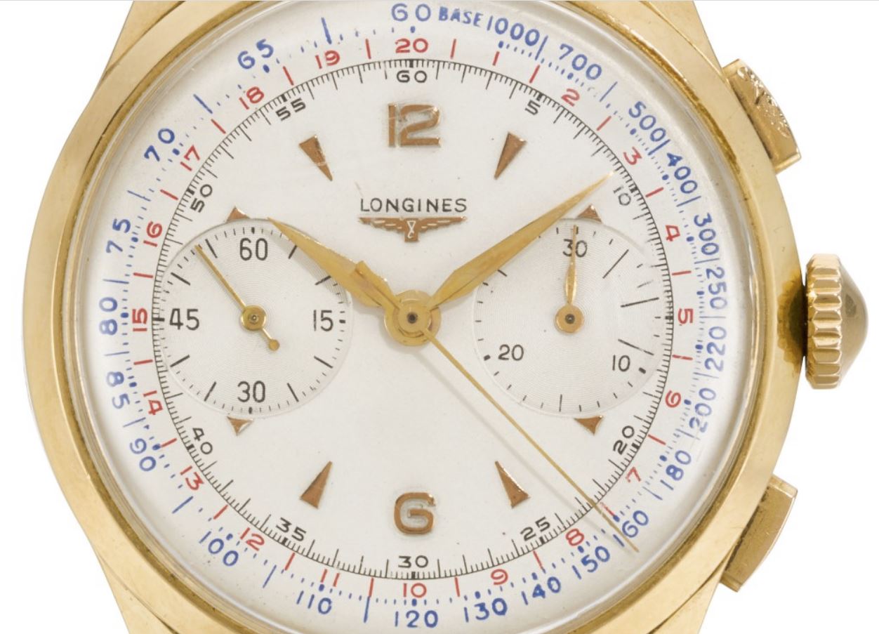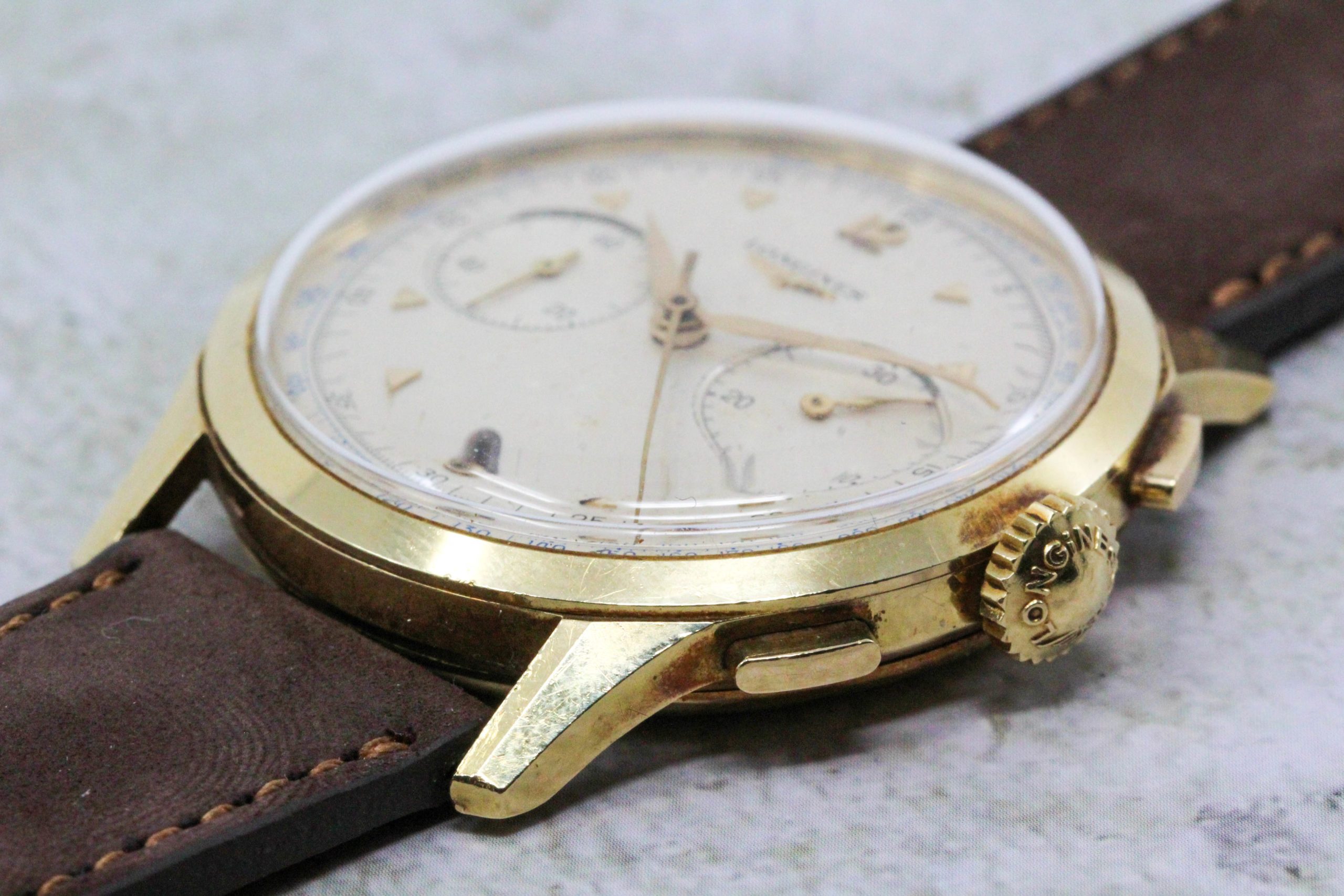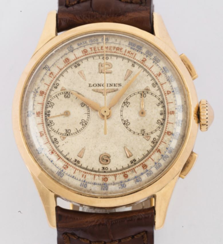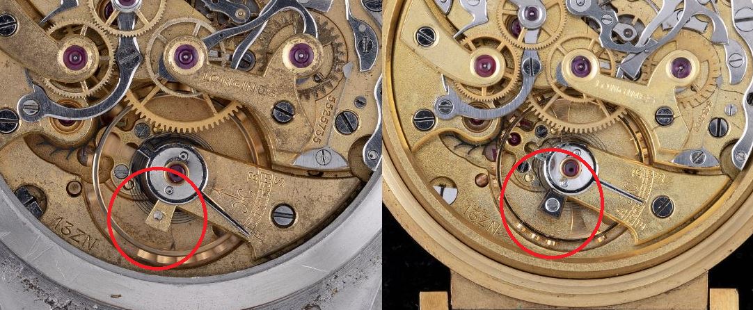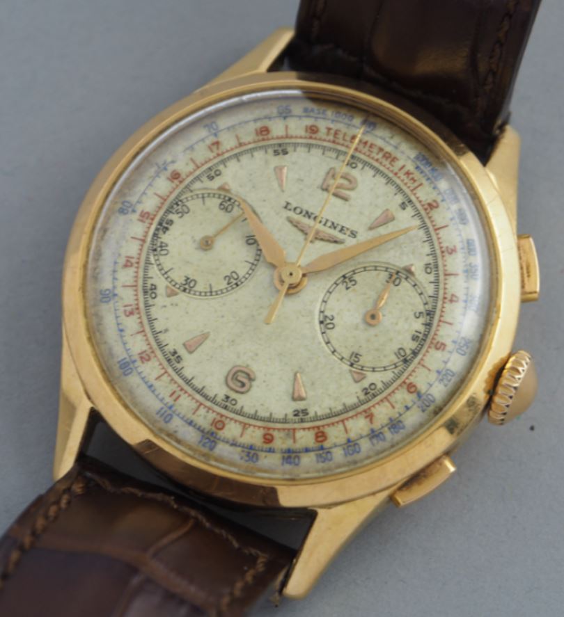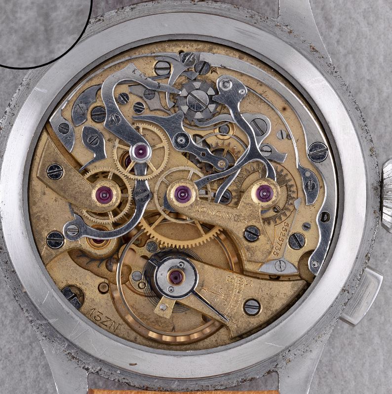 Now, a slightly later 5967 (source: https://www.sothebys.com/en/buy/auc...8/longines-reference-5967-yellow-gold-flyback). The dial has been crudely refinished. It is tough to tell, but the markers and emblem are not applied but embossed. Also, note the clear cap jewel on the balance cock. Crown is correct and unsigned.