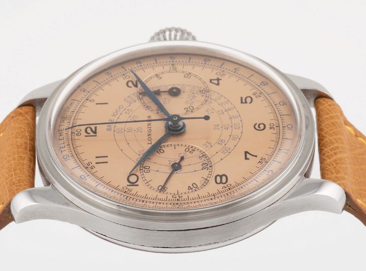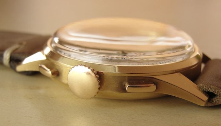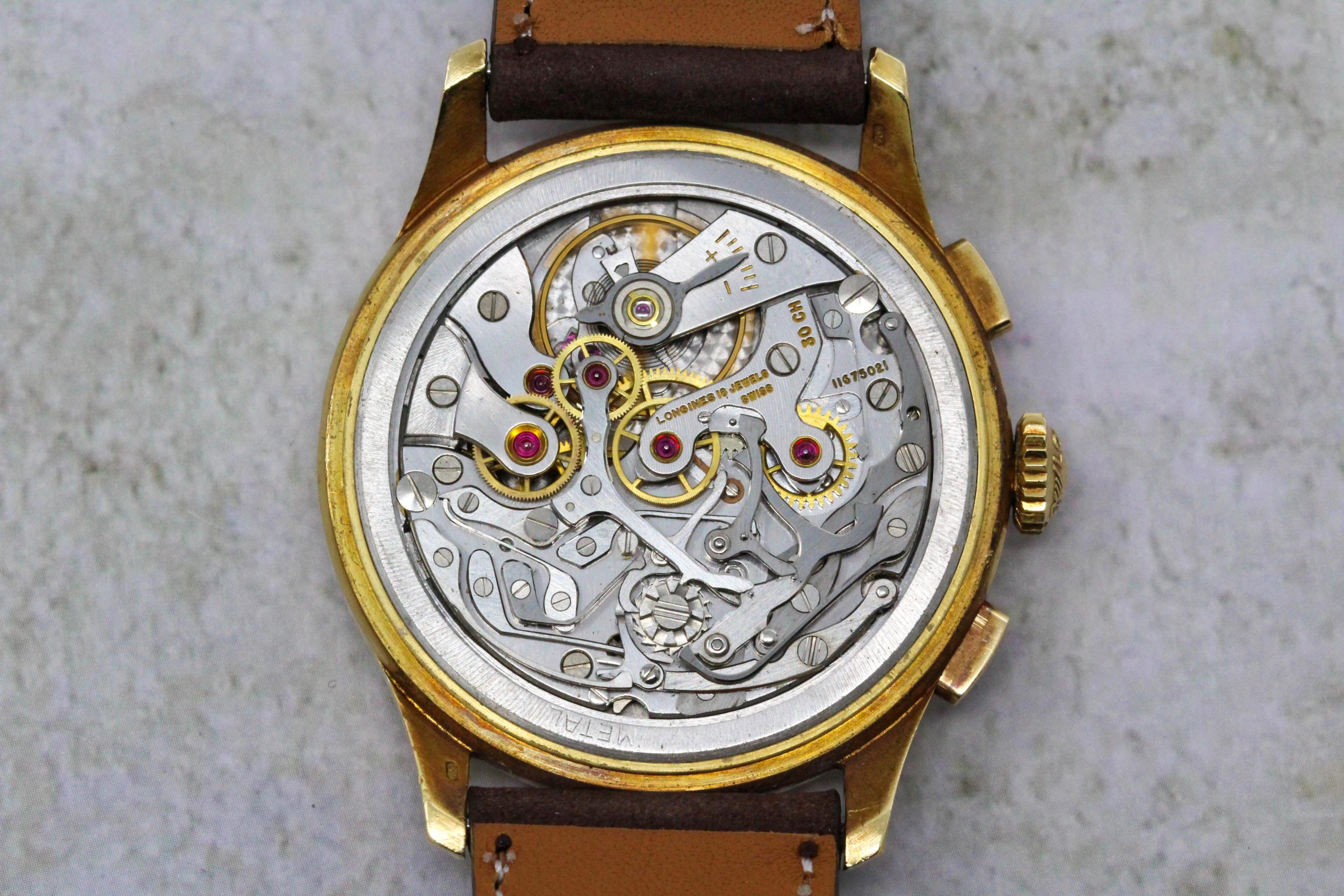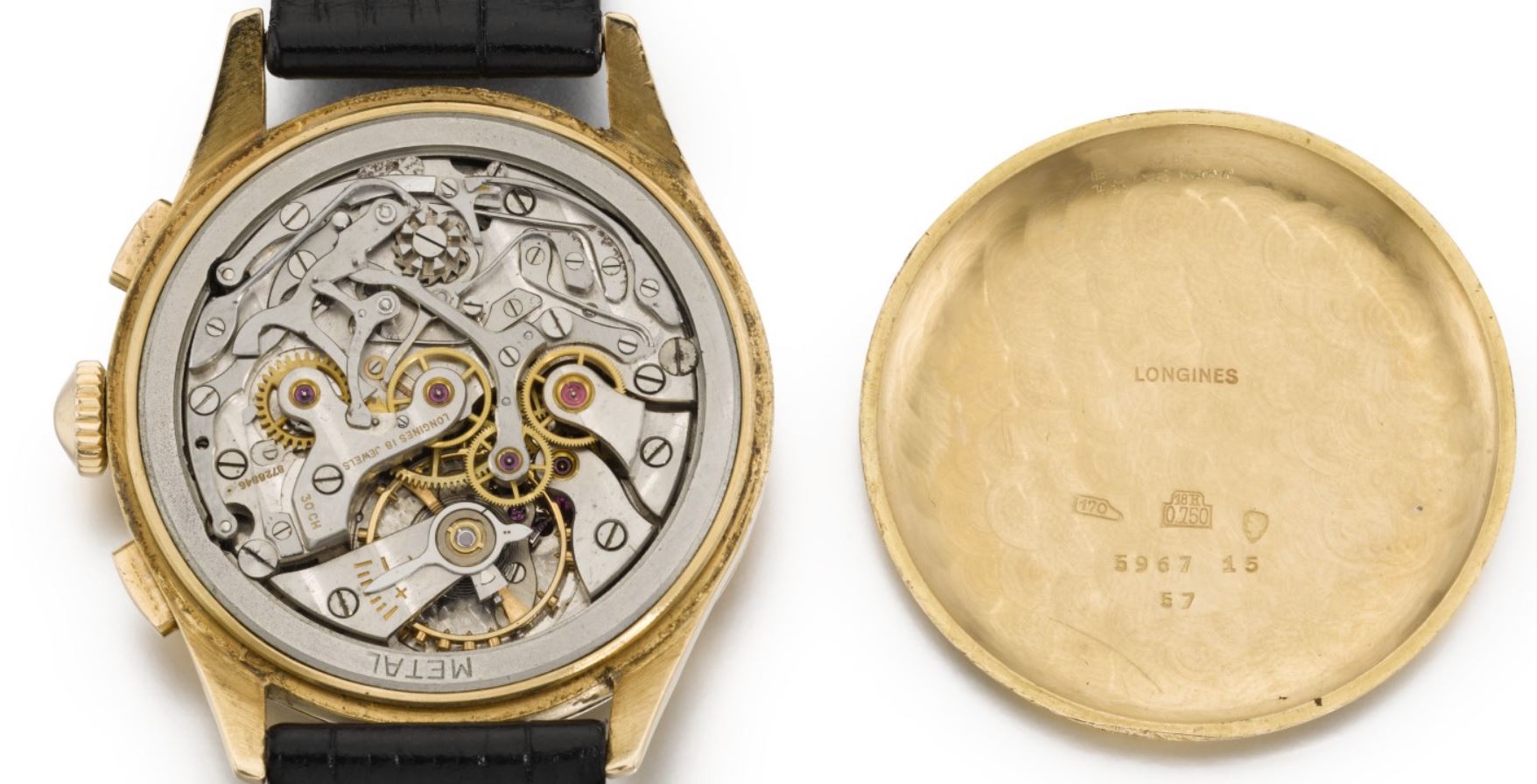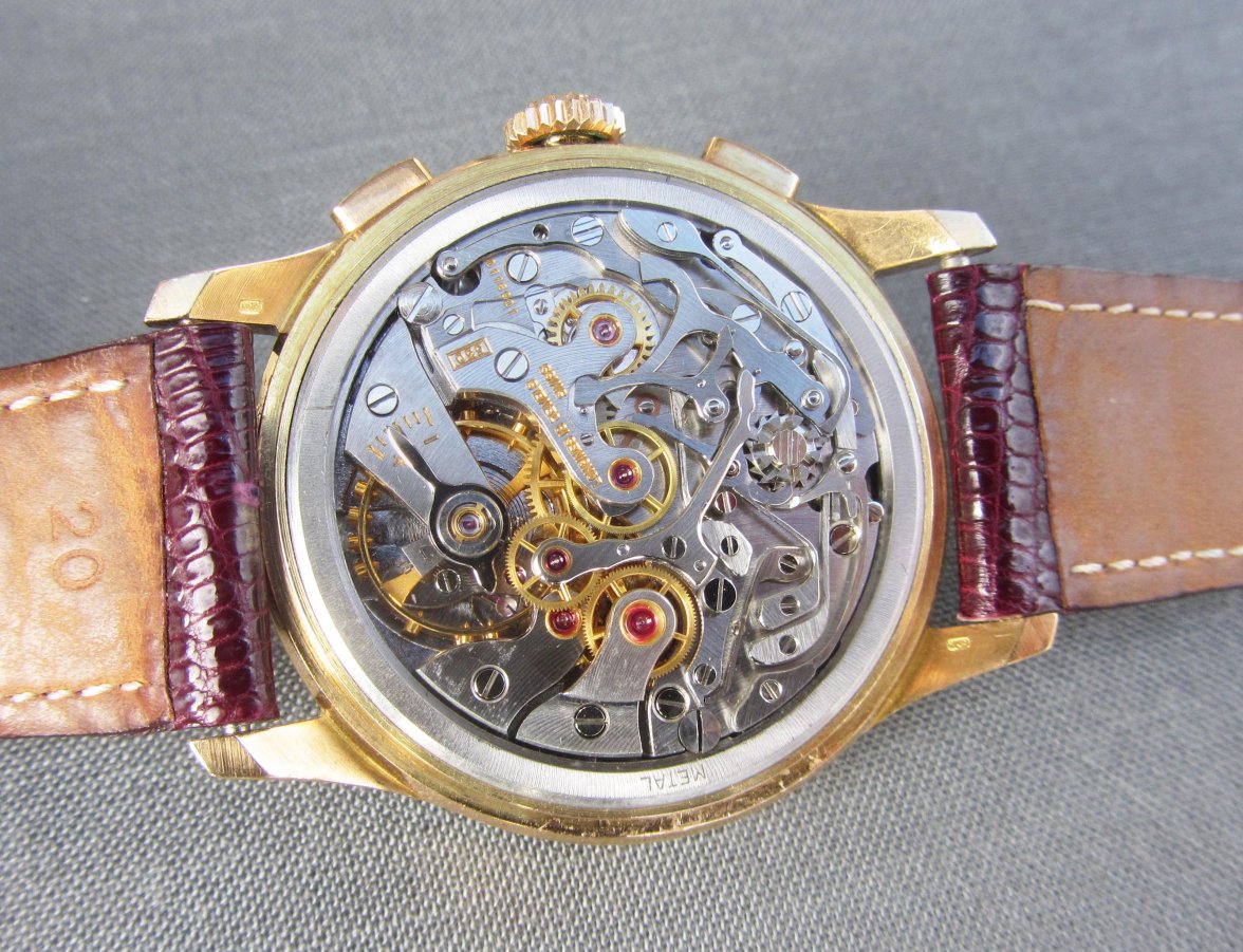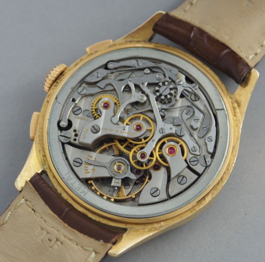 Now, a slightly later 5967 (source: https://www.sothebys.com/en/buy/auc...8/longines-reference-5967-yellow-gold-flyback). The dial has been crudely refinished. It is tough to tell, but the markers and emblem are not applied but embossed. Also, note the clear cap jewel on the balance cock. Crown is correct and unsigned.