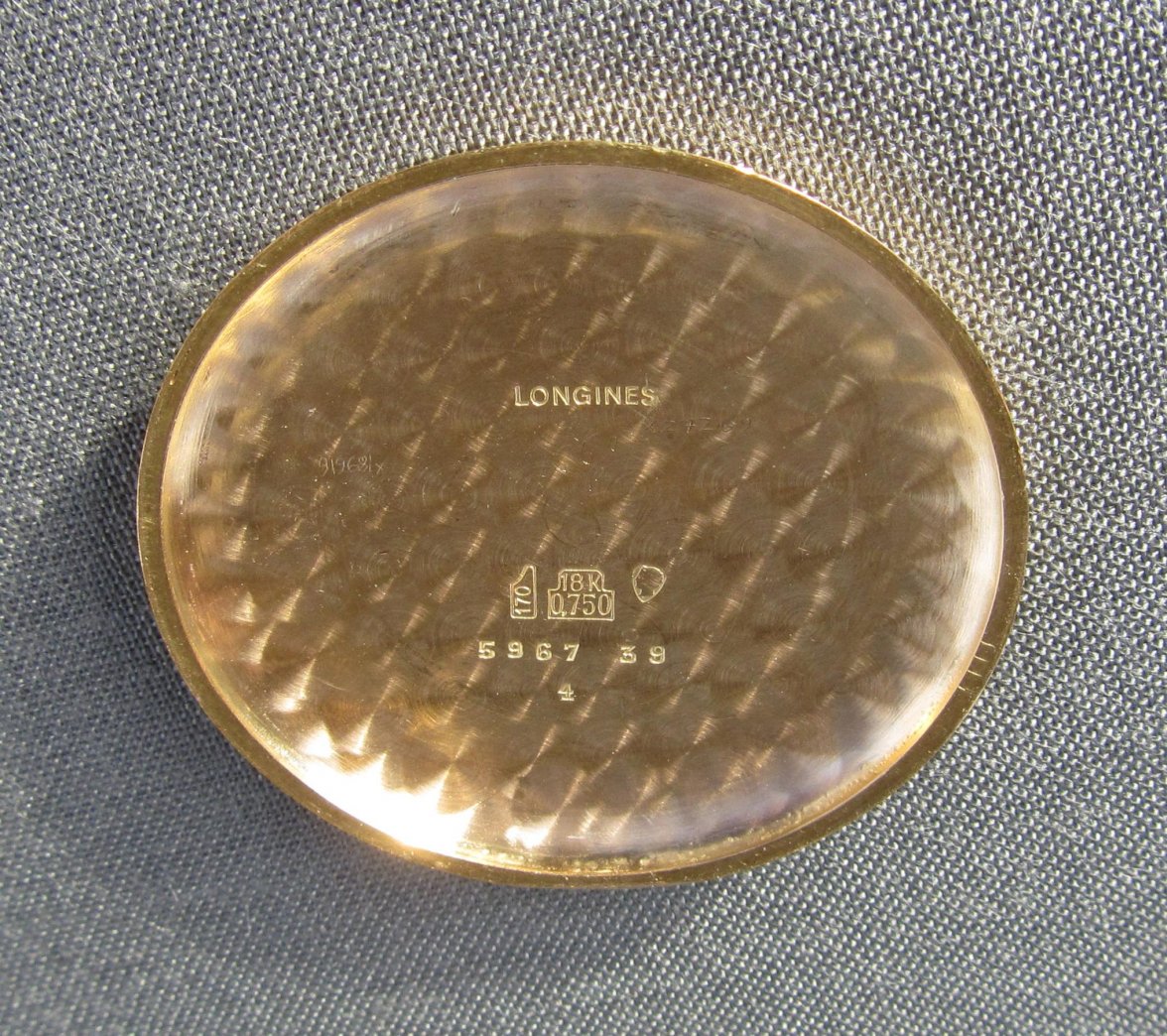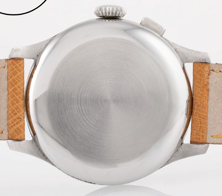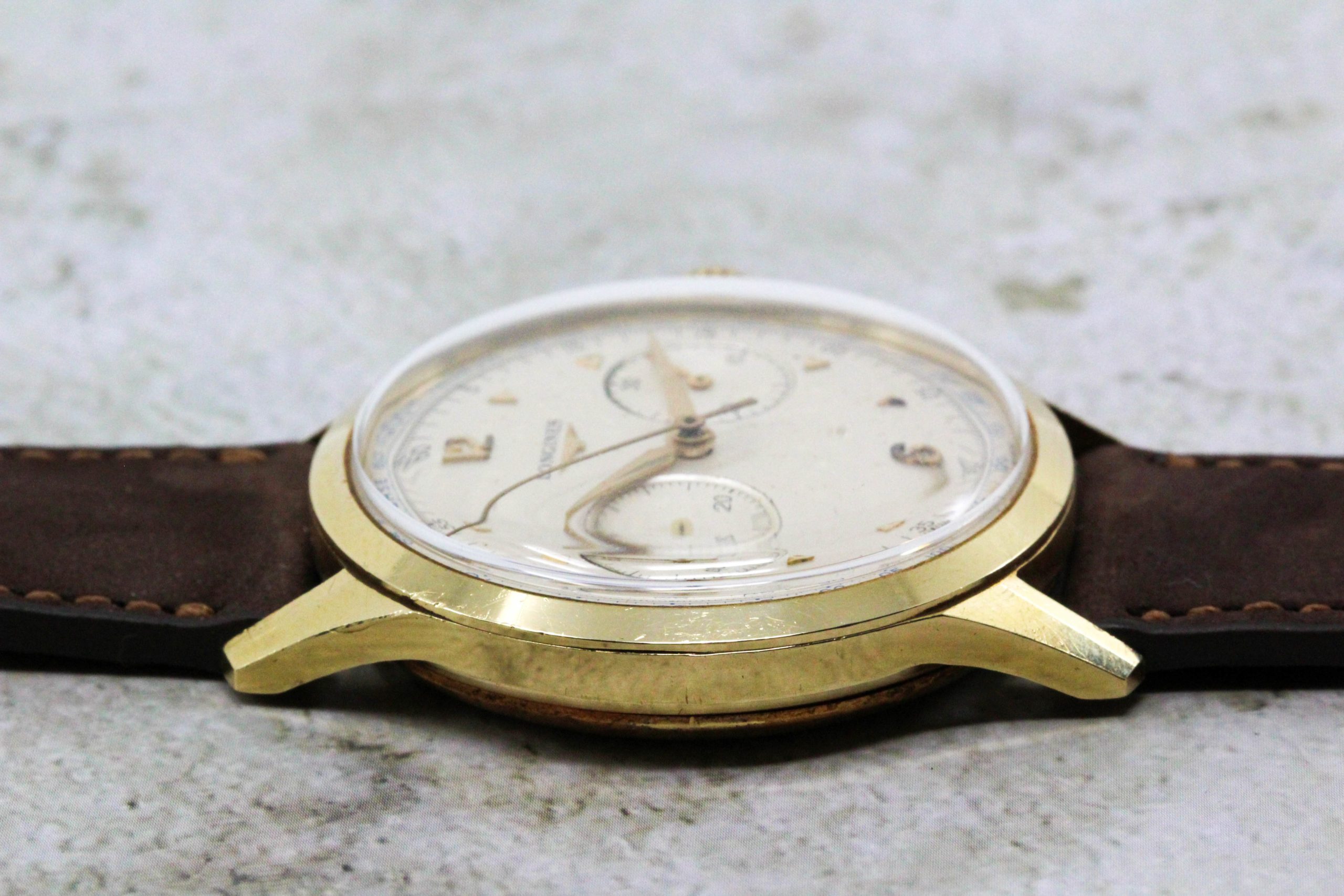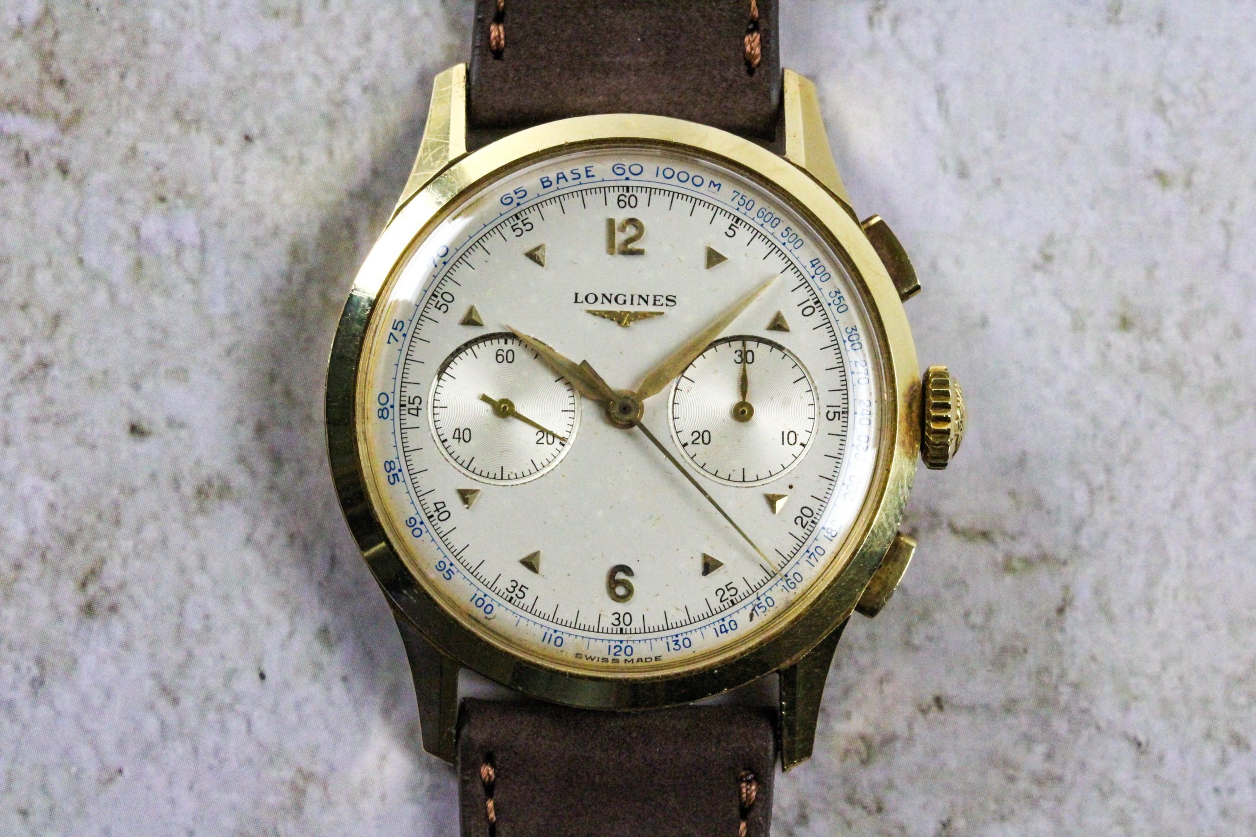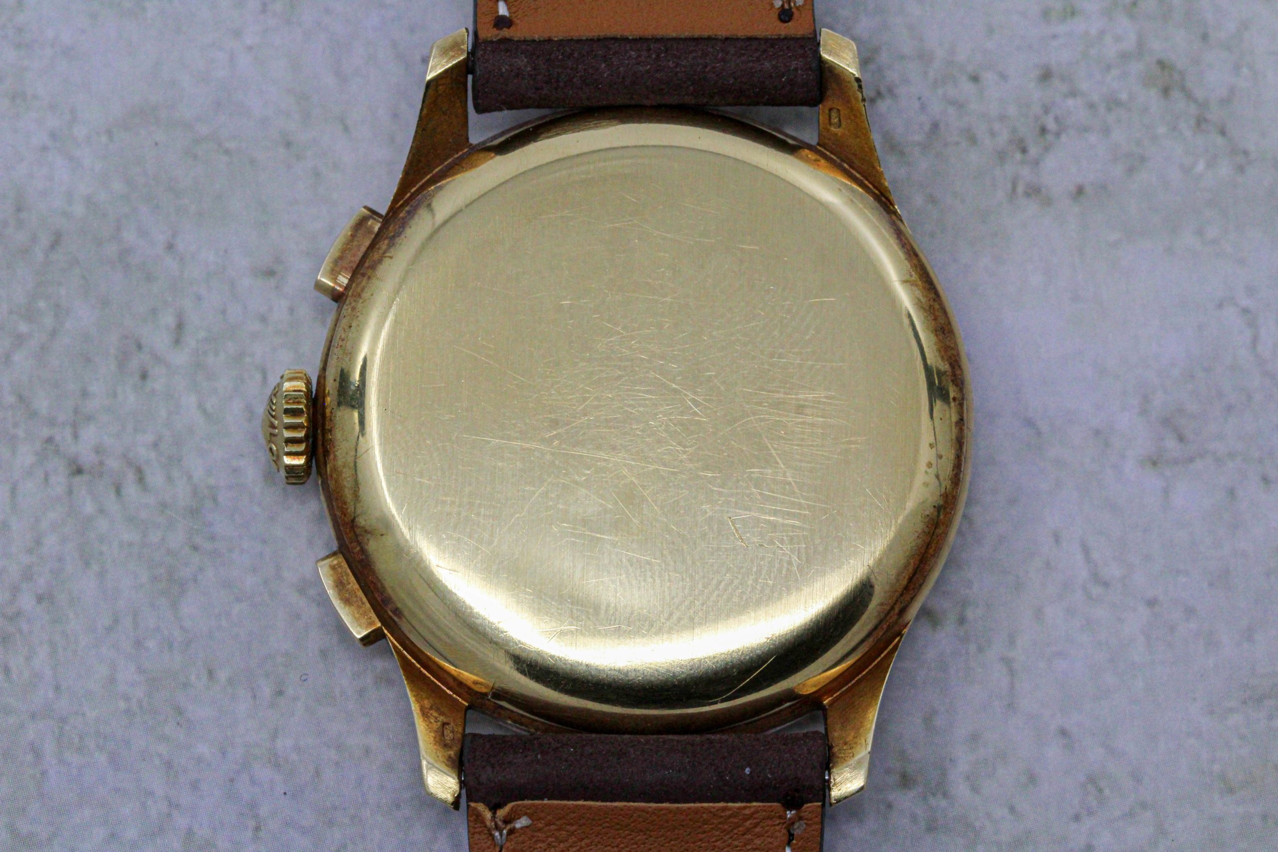 Now, a slightly later 5967 (source: https://www.sothebys.com/en/buy/auc...8/longines-reference-5967-yellow-gold-flyback). The dial has been crudely refinished. It is tough to tell, but the markers and emblem are not applied but embossed. Also, note the clear cap jewel on the balance cock. Crown is correct and unsigned.
