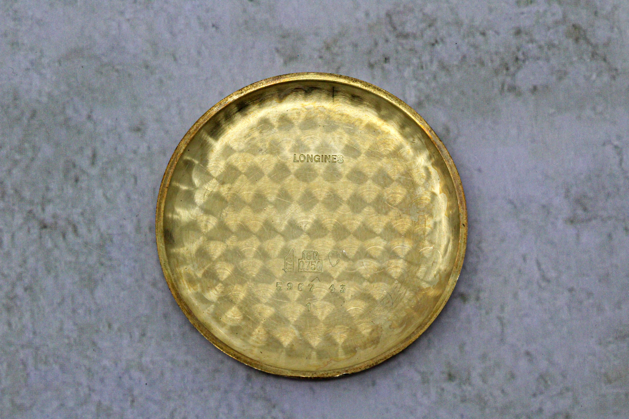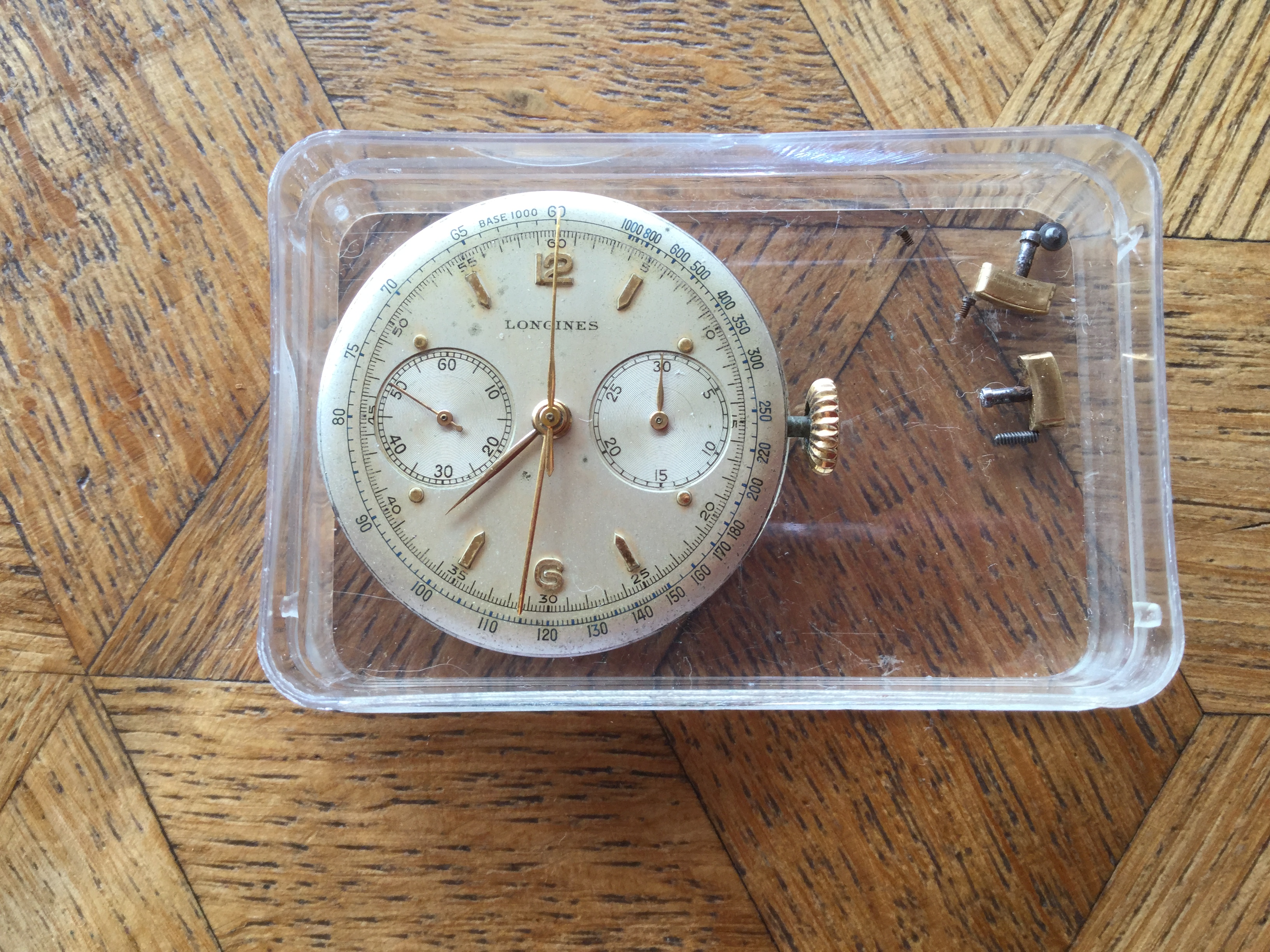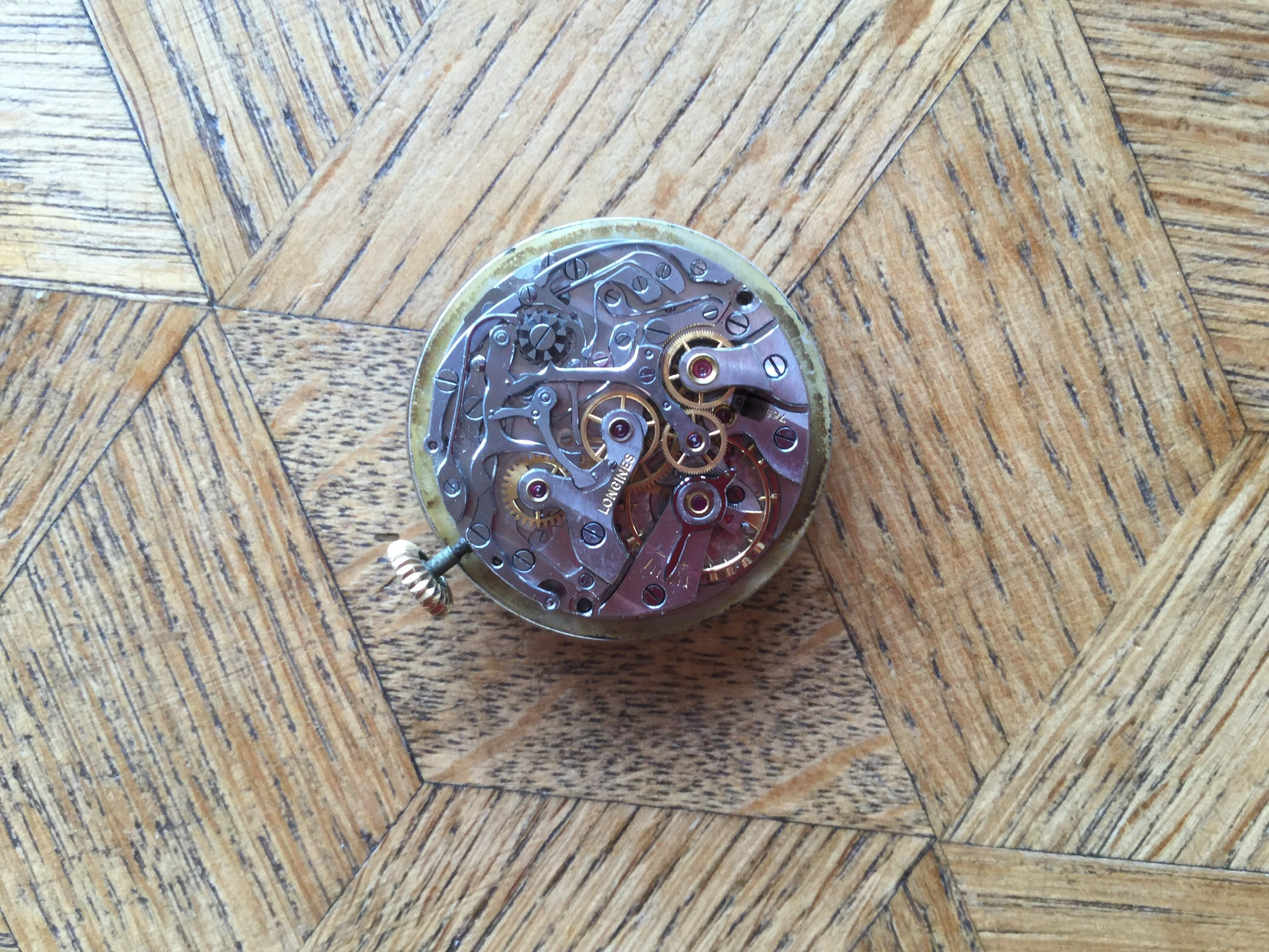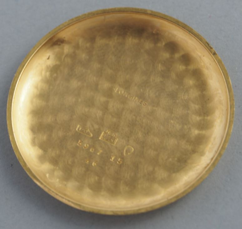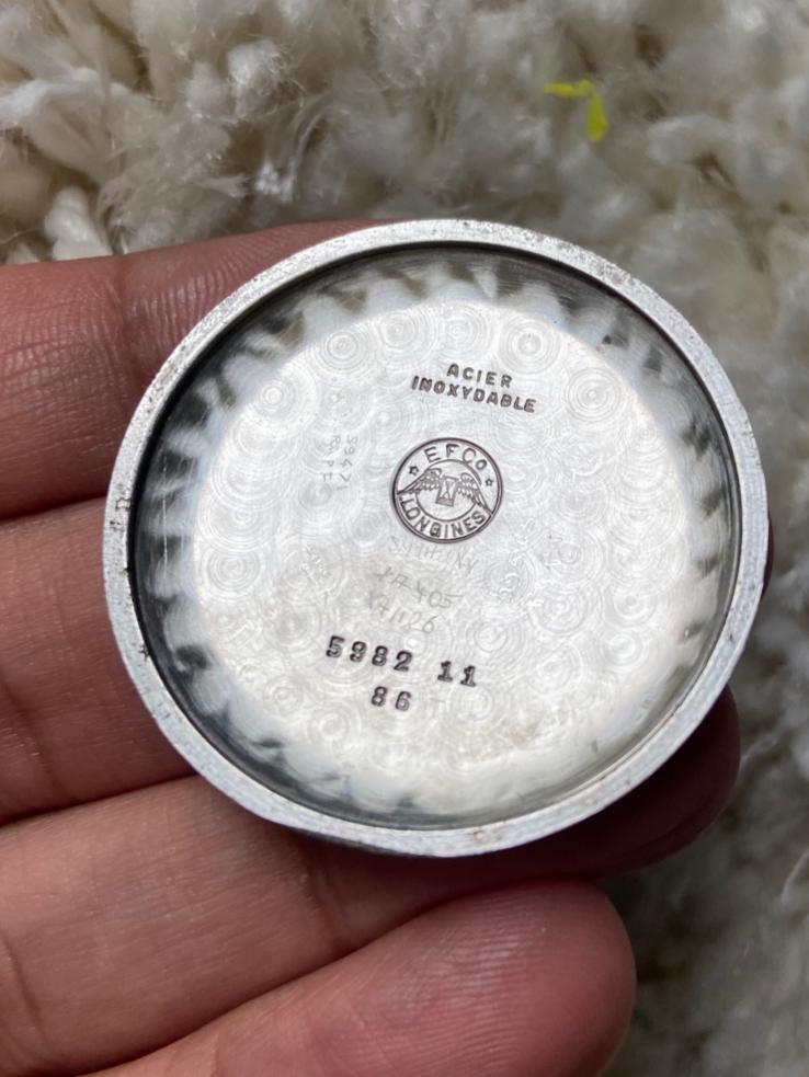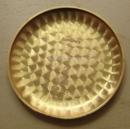 Finally, a very late 5967 (source: https://omegaforums.net/threads/longines-30ch-530-numbering.93404/). Again, applied details on the dial. Movement is now marked 530. Crown is signed.