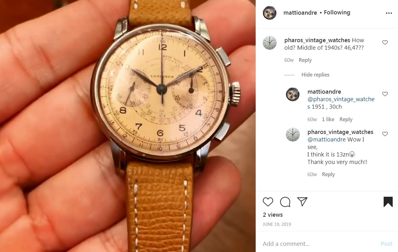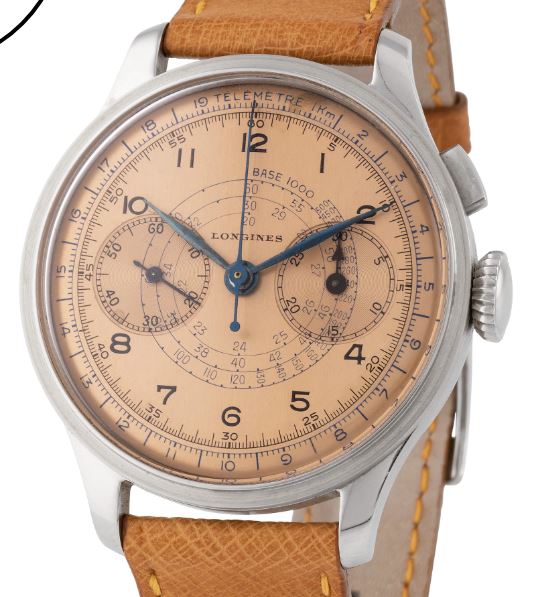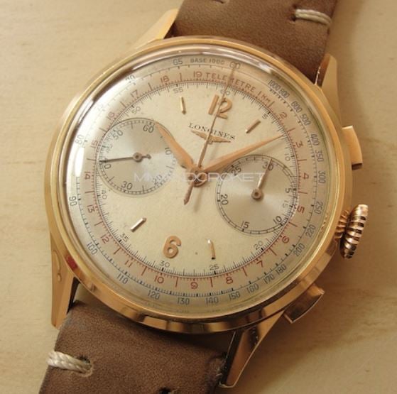 Next is a later 5967 (source: https://mentawatches.com/product/longines-30ch-chronograph-6/). Again, the dial has applied markers and emblem. Note that the movement has lost its Geneva stripes. Crown is correct and signed.