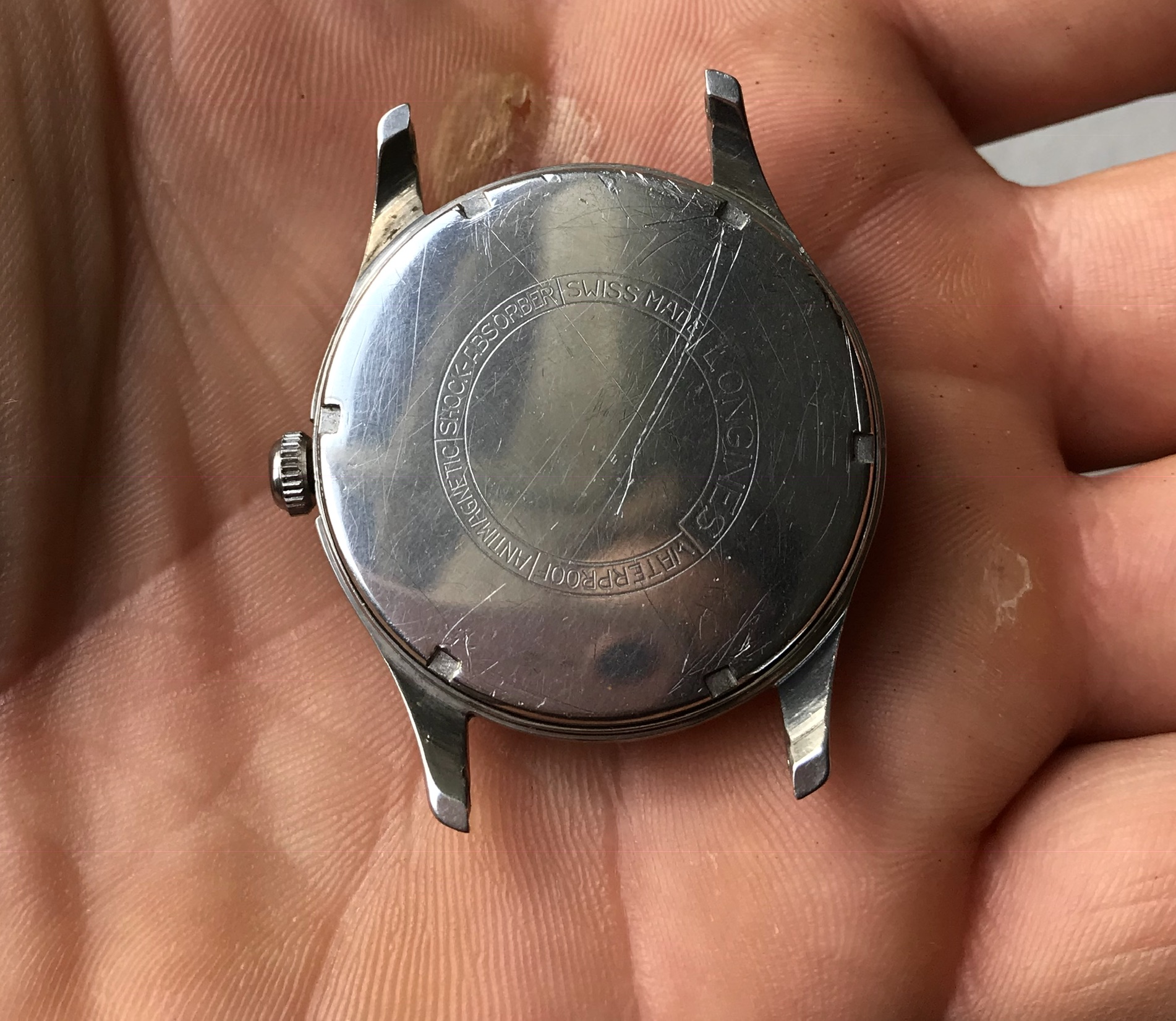 The steel case is 35mm excluding crown and takes 18mm straps. Overall good condition without any bigger flaws except of some heavy scratches on the caseback, screwed down caseback and unsigned crown.