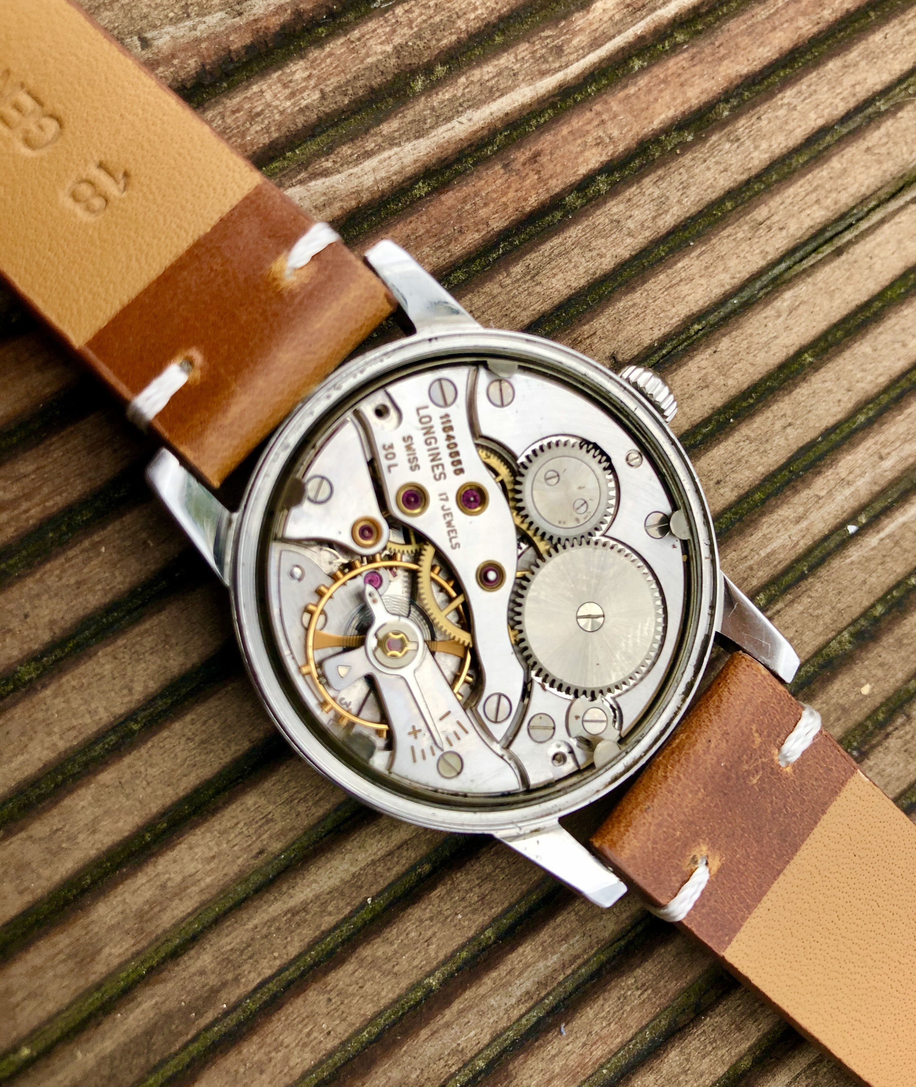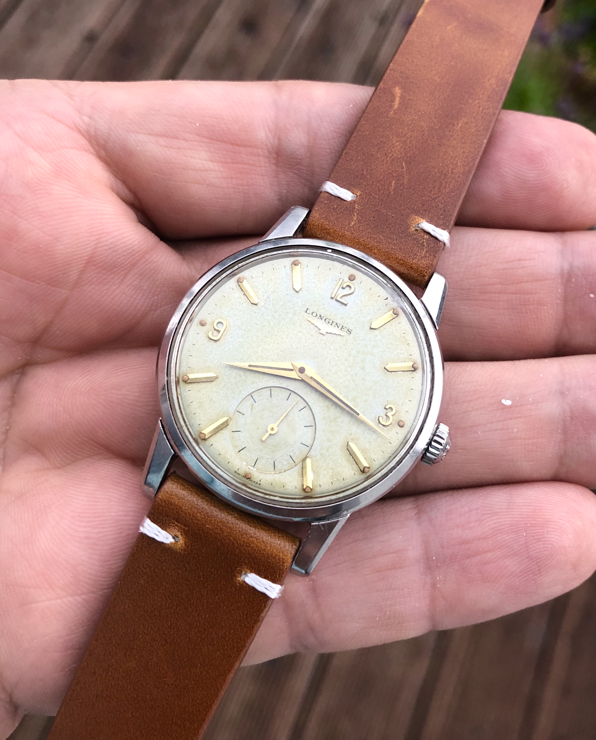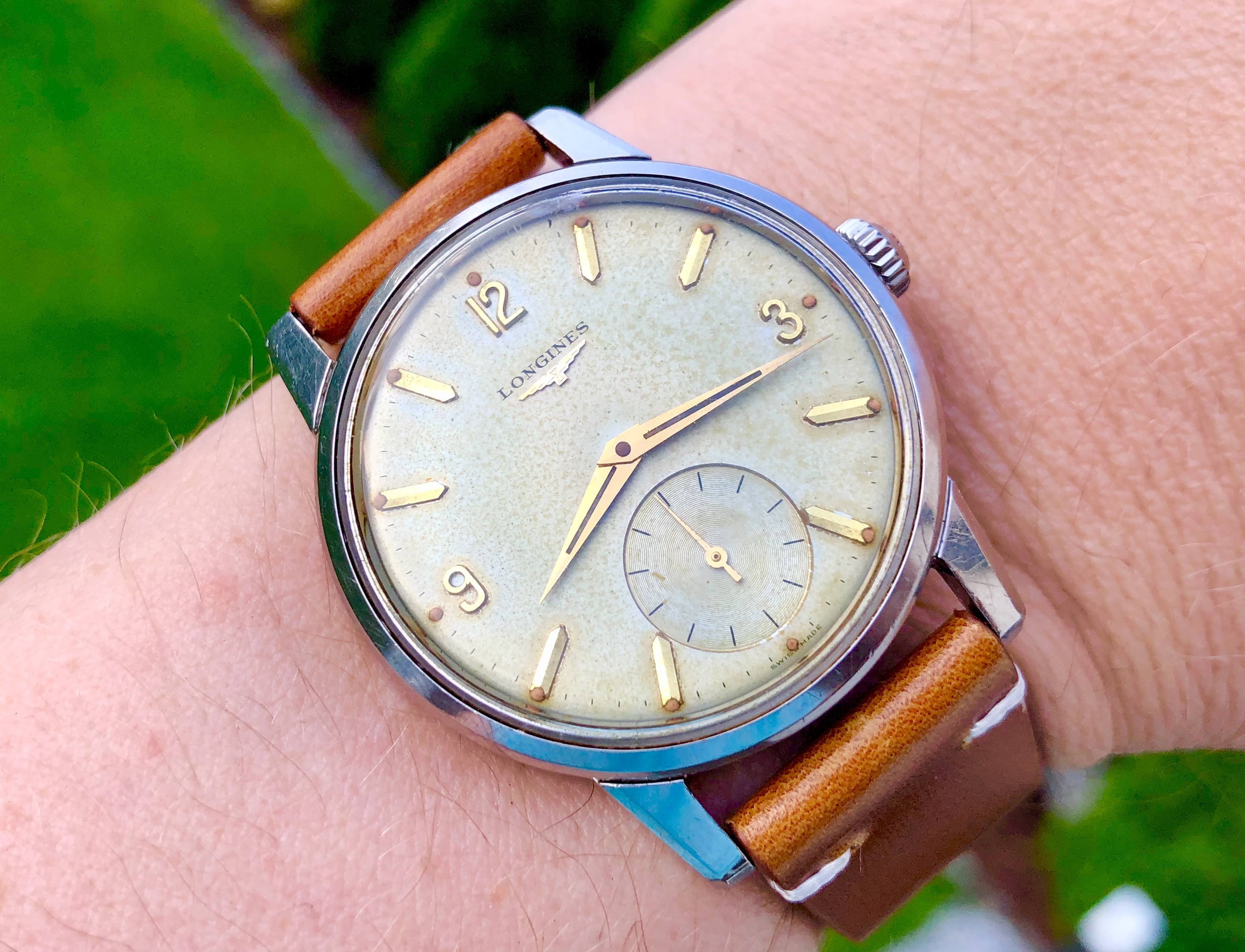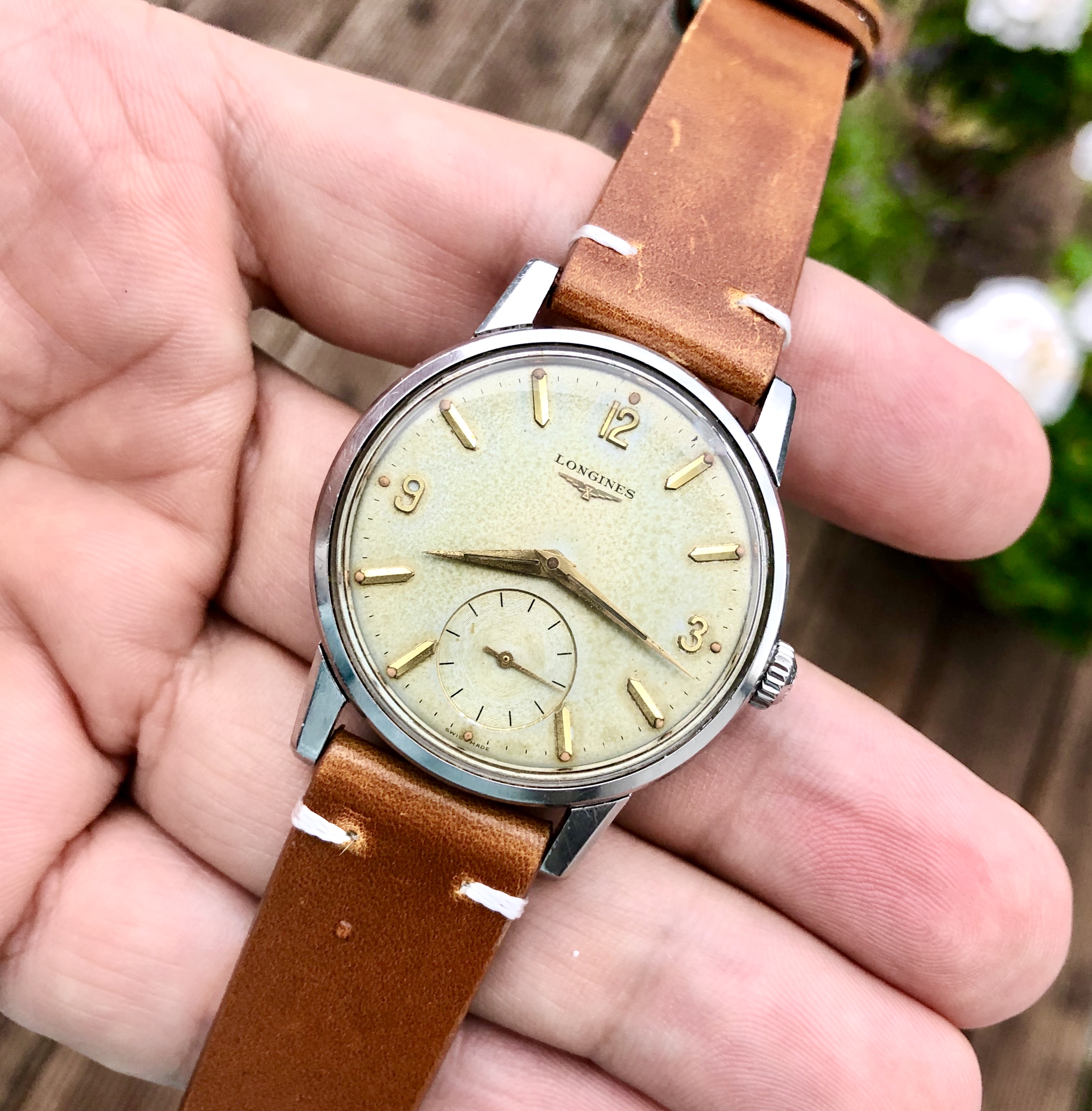 For sale is an original rare Longines from ca 1960 in stainless steel case. A classic gent's dress size at 35mm in diameter, this Longines wears large, as they say, because of the small bezel, big face and long, beefy lugs.