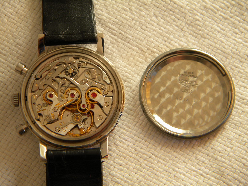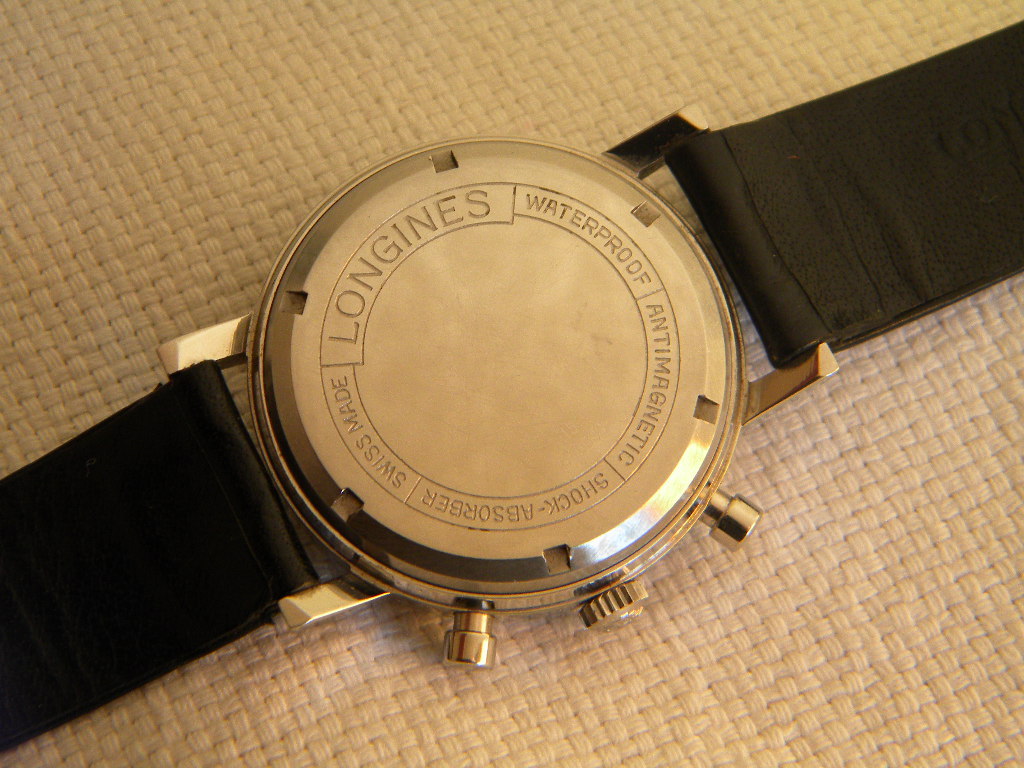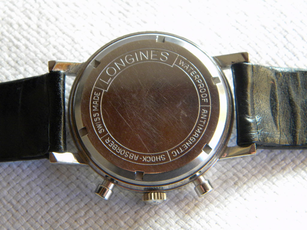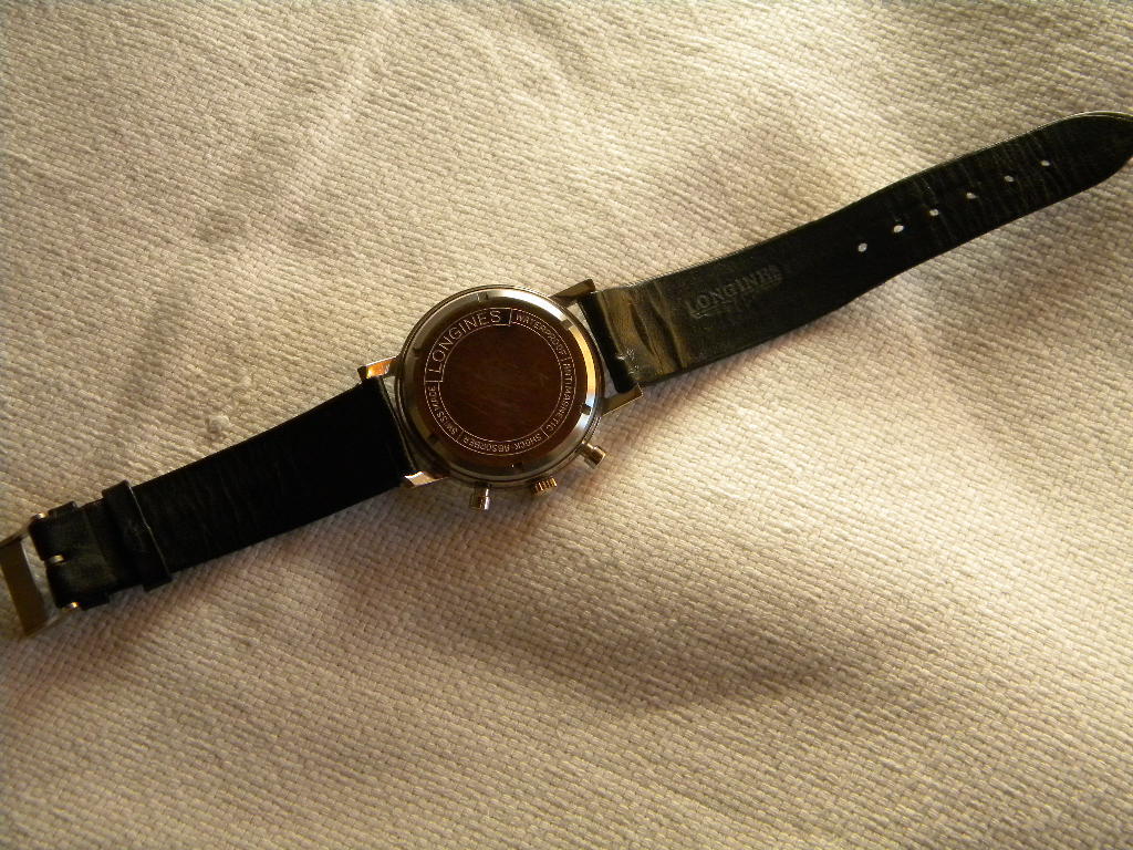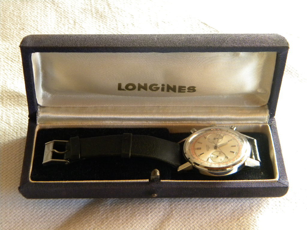 Band and buckle are Longines, also the box. First owner, all matches and was never replaced. Plexi, crown, hands, dial, pushers, mechanical parts and accesories.