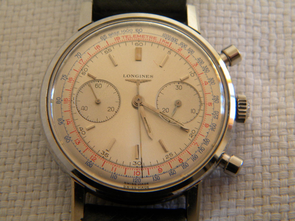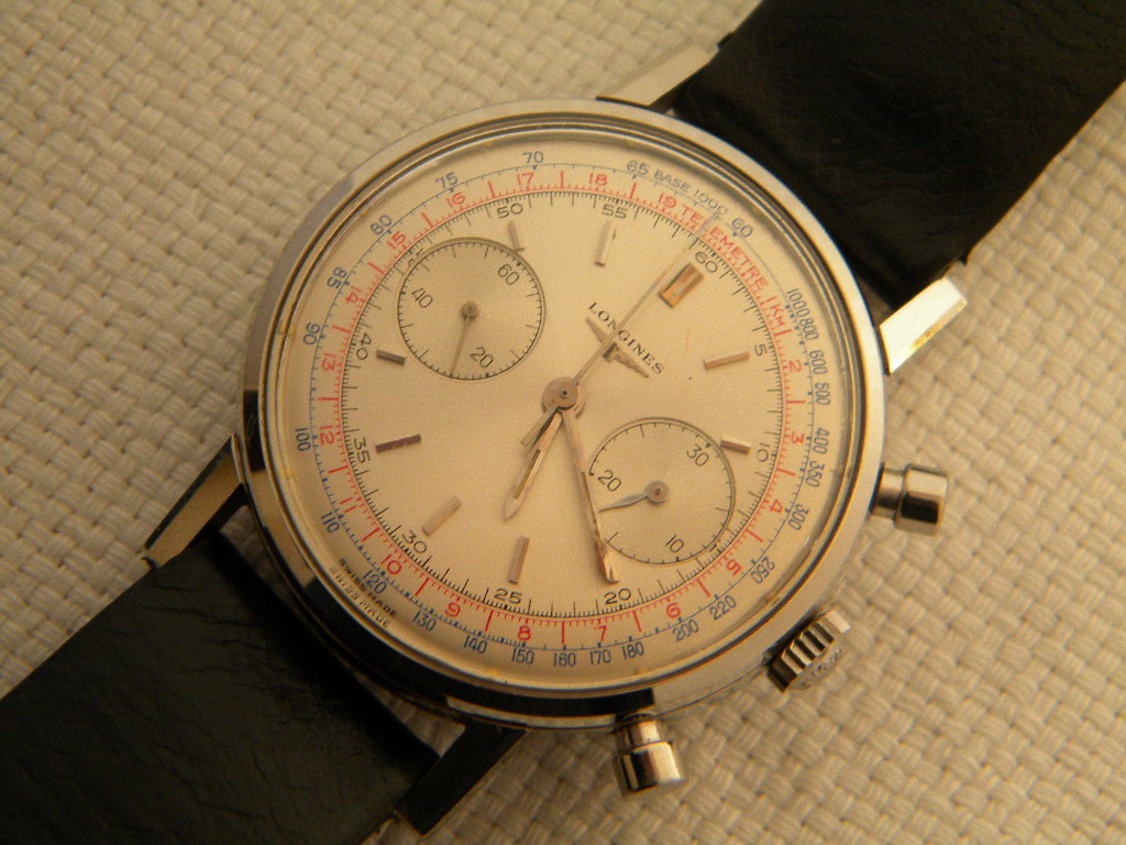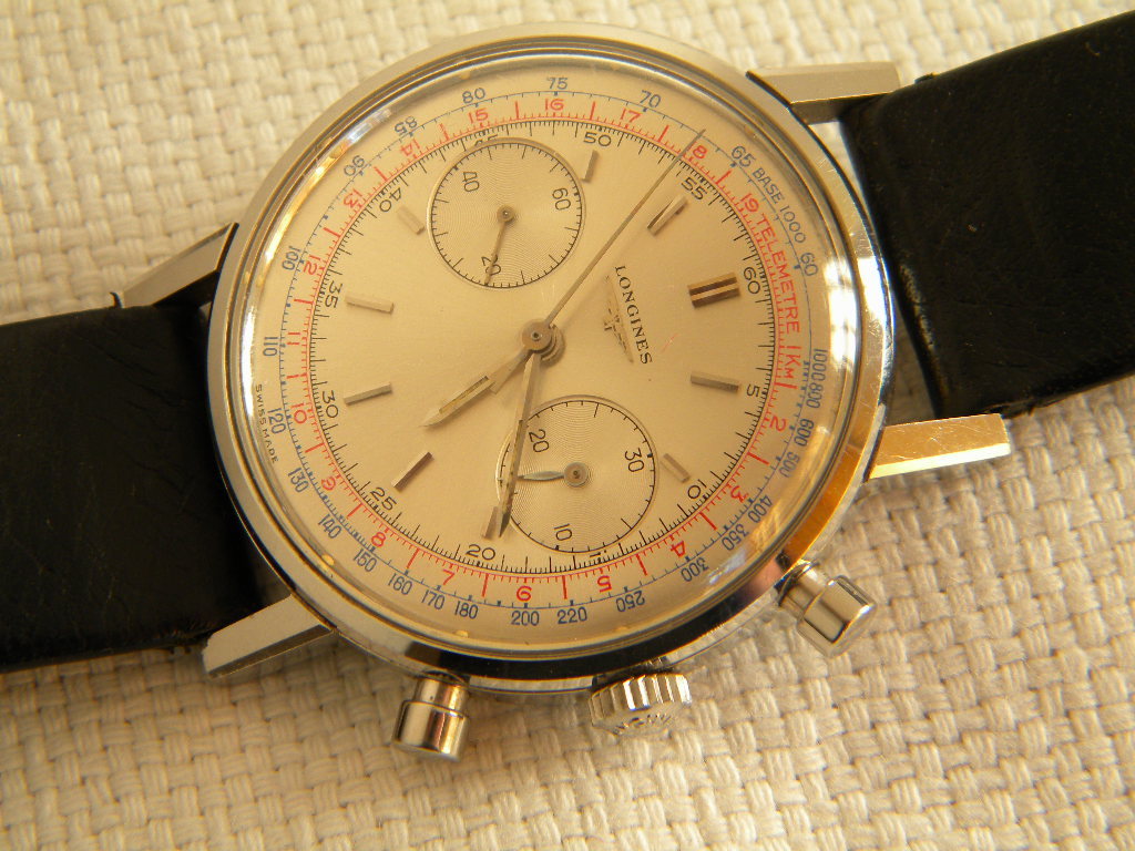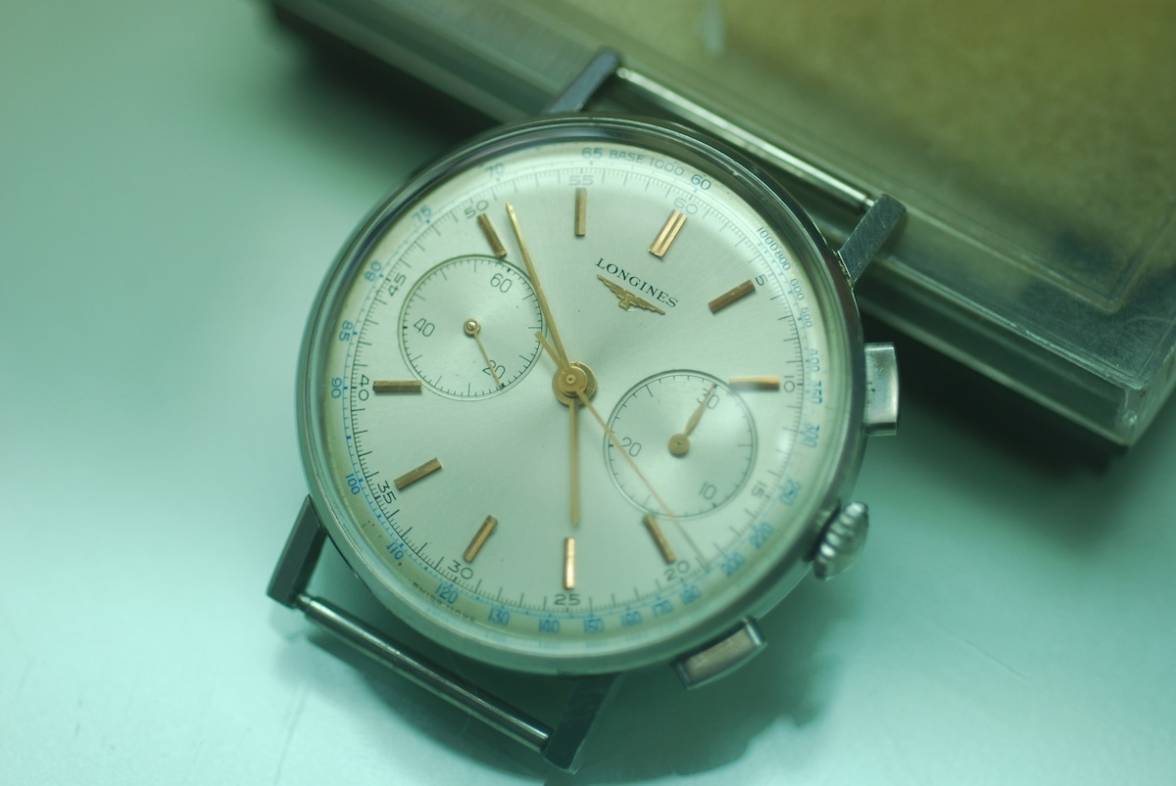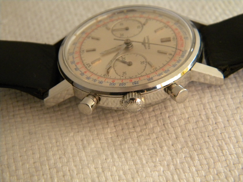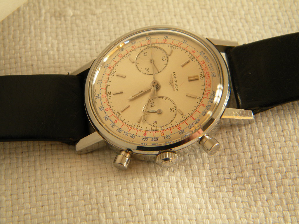 Band and buckle are Longines, also the box. First owner, all matches and was never replaced. Plexi, crown, hands, dial, pushers, mechanical parts and accesories.
