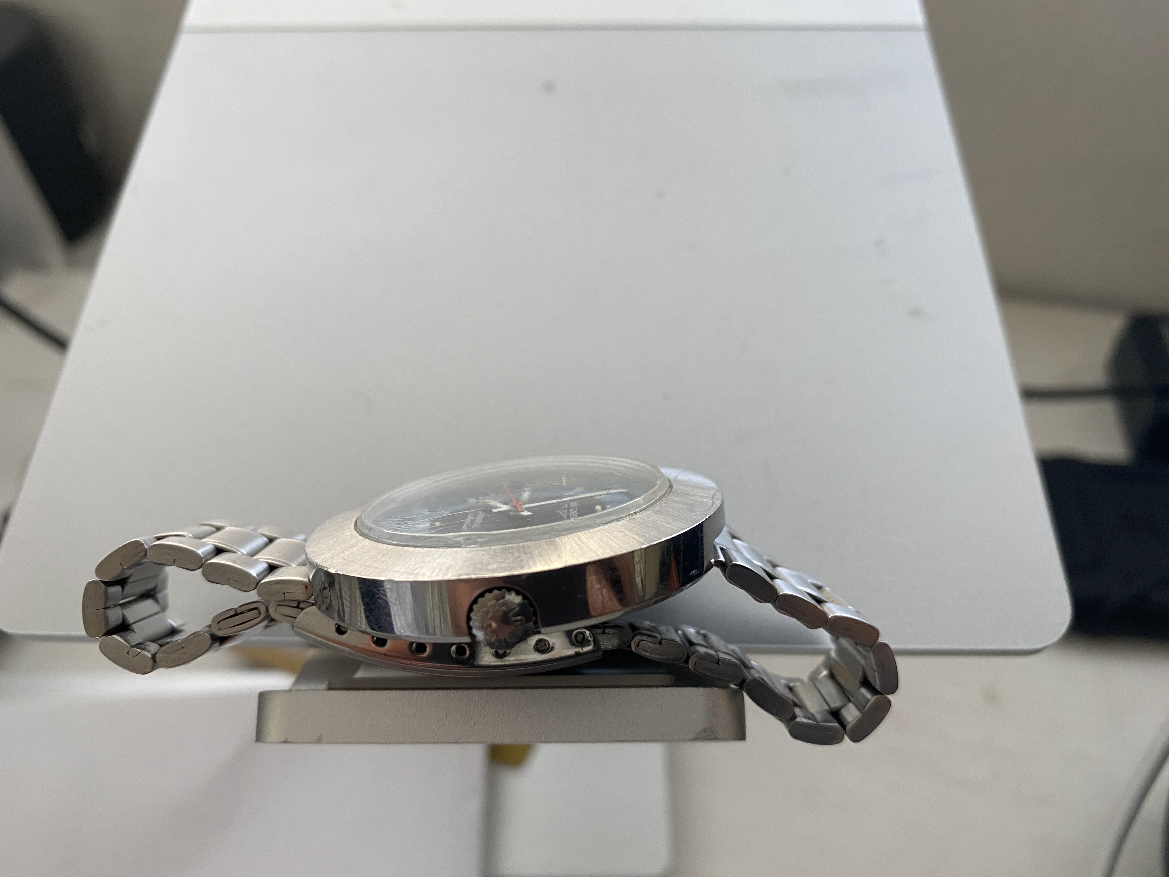 Crystal: The crystal may be original - it doesn't protrude above the case much. There are some marks as visible on the picture.