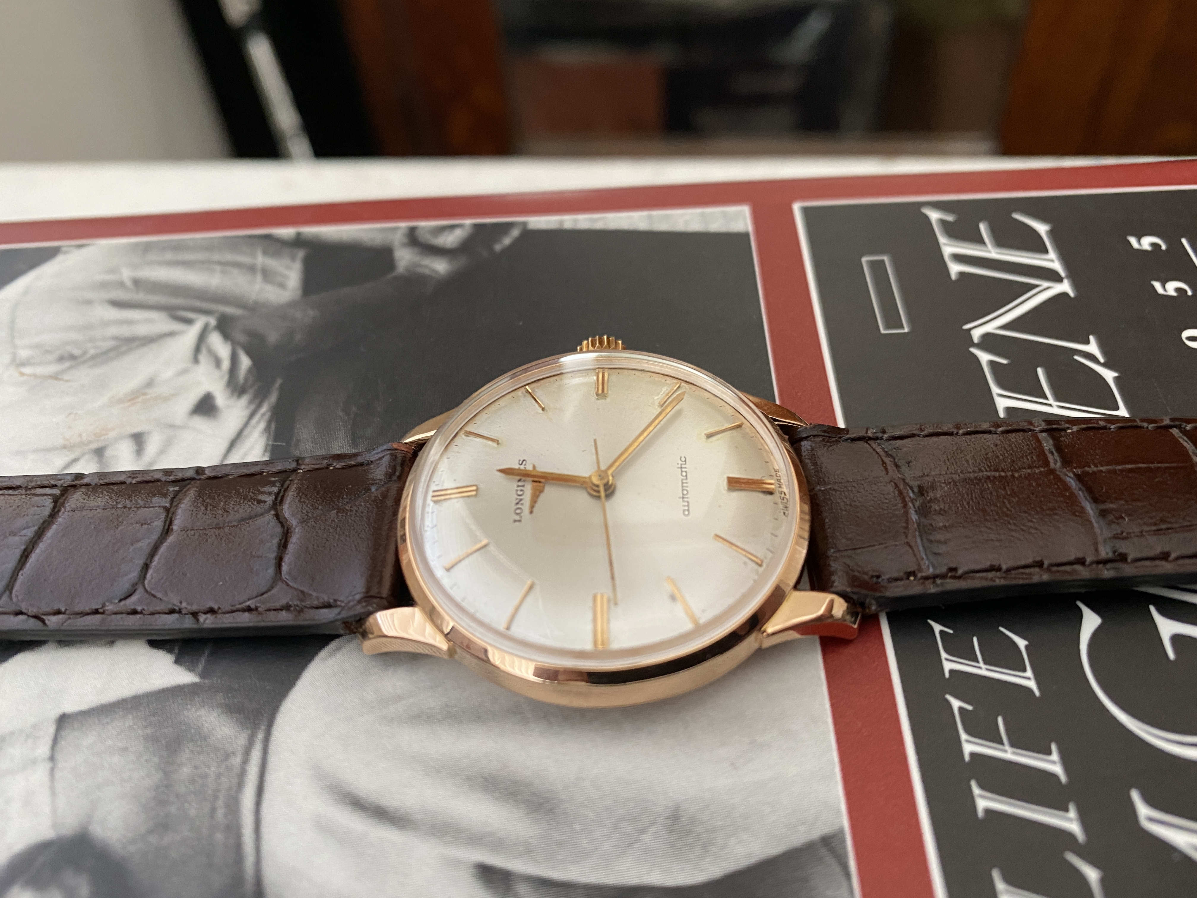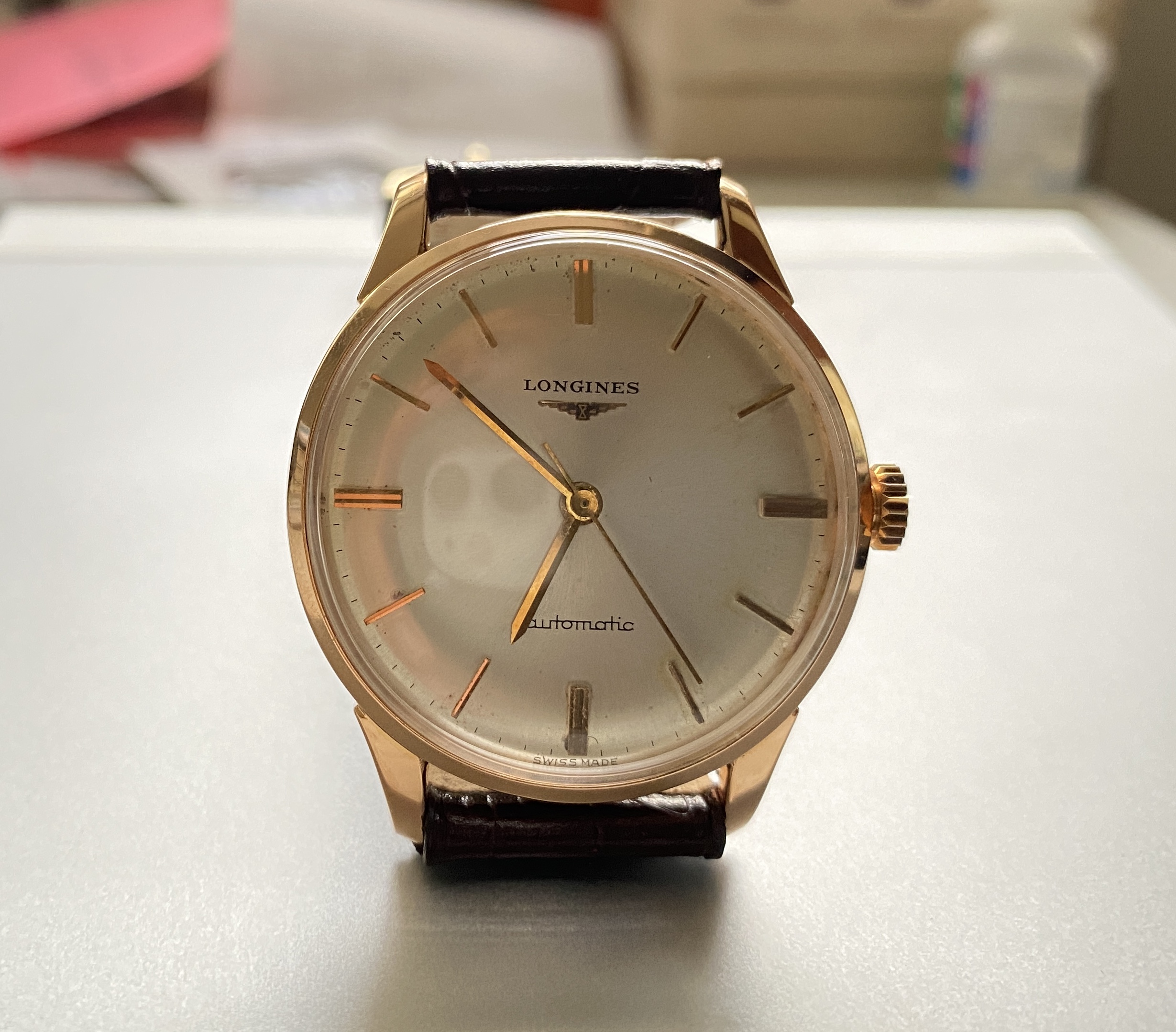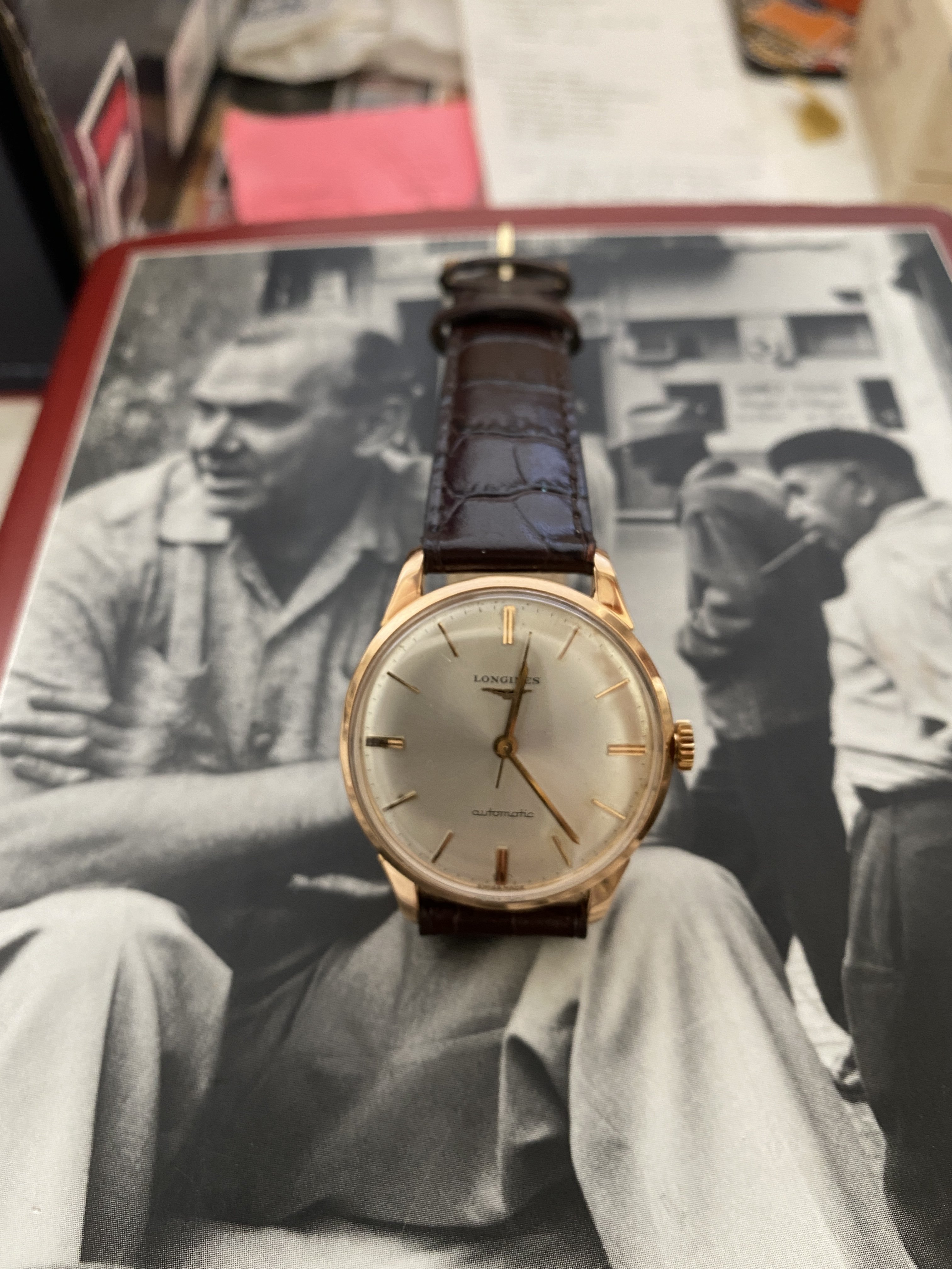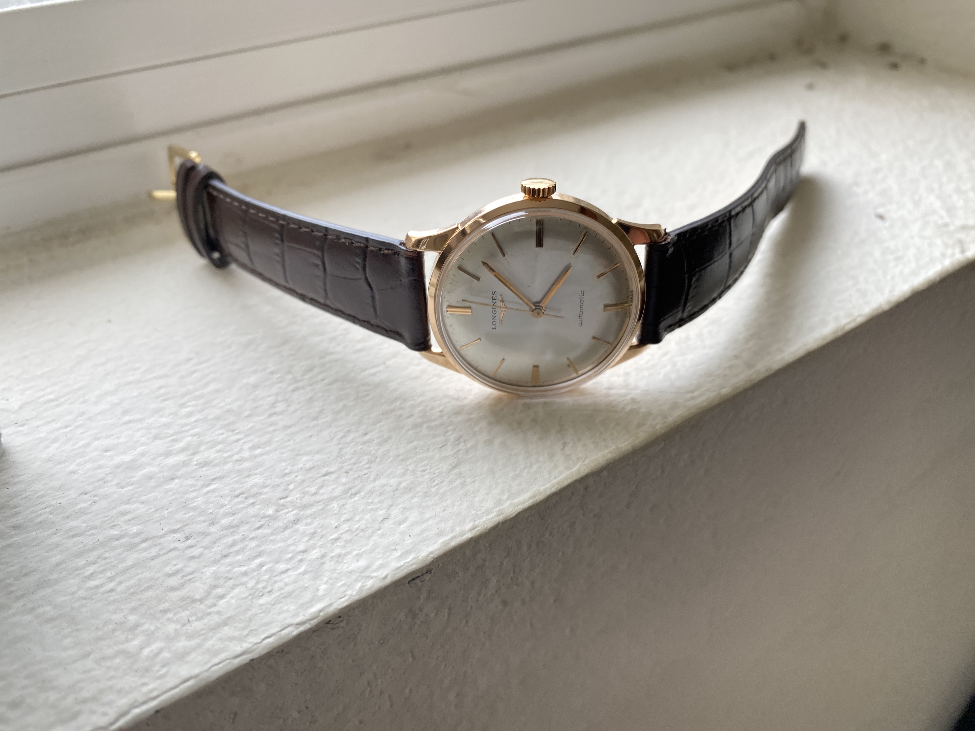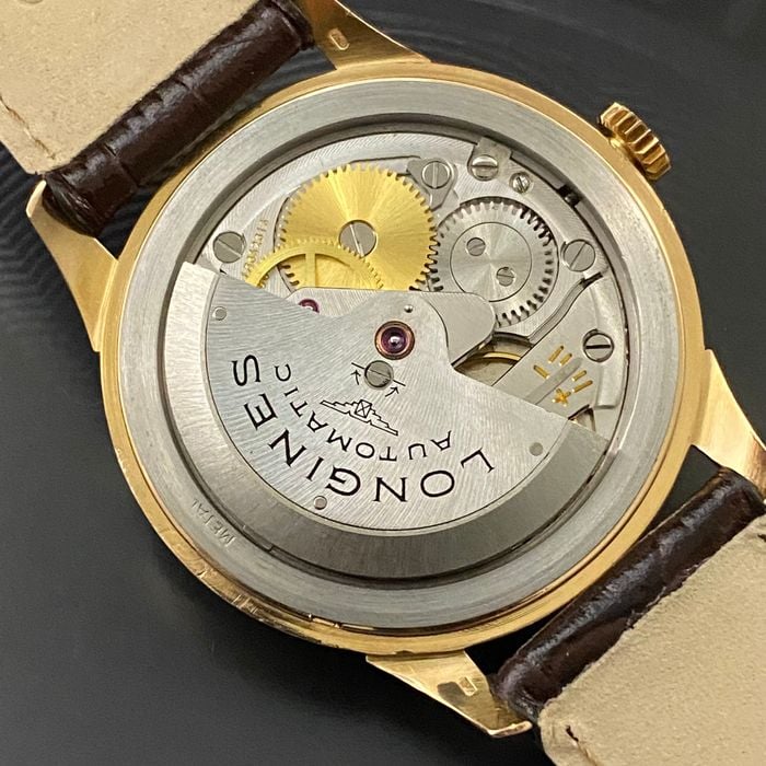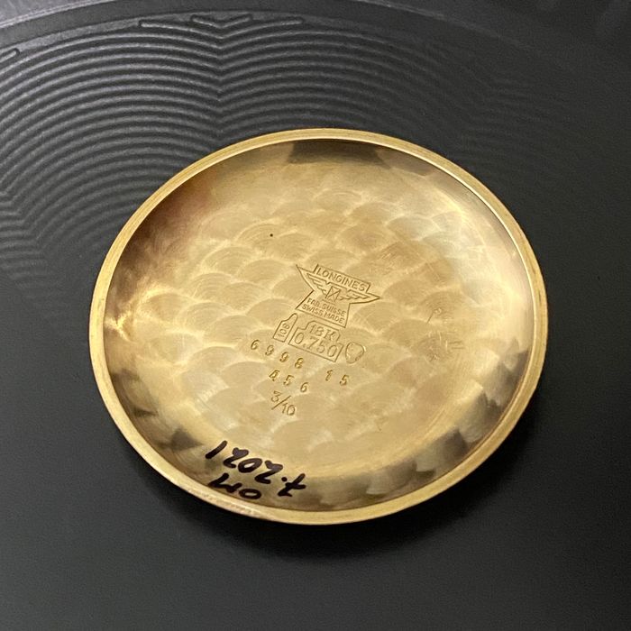 Case: The 34mm case is 18kt rose gold. It is marked with the Longines stamp on the inside and also stamped on the back of the lugs. The case looks clean. I cannot tell if it has been polished. I suspect a light polish.