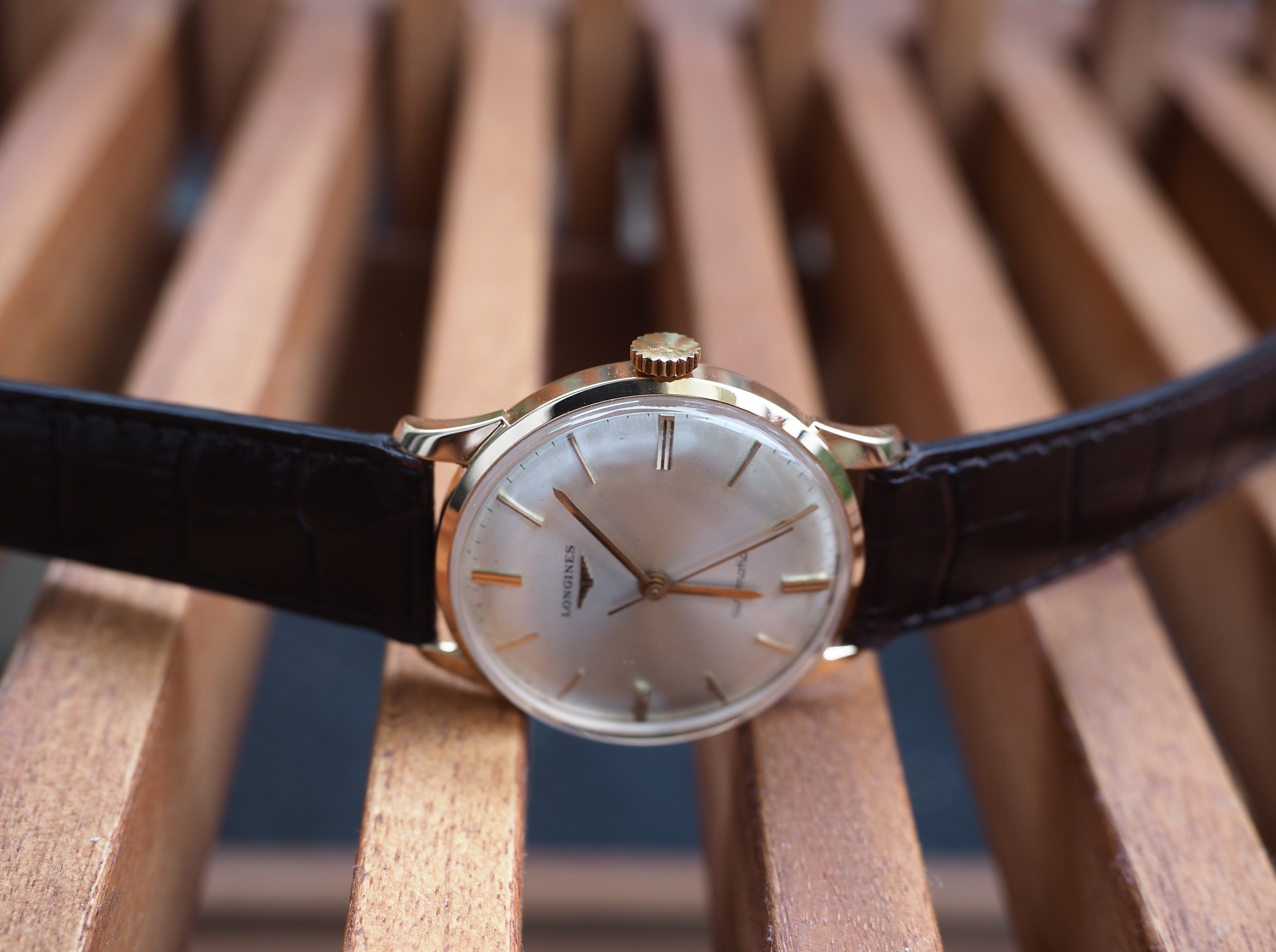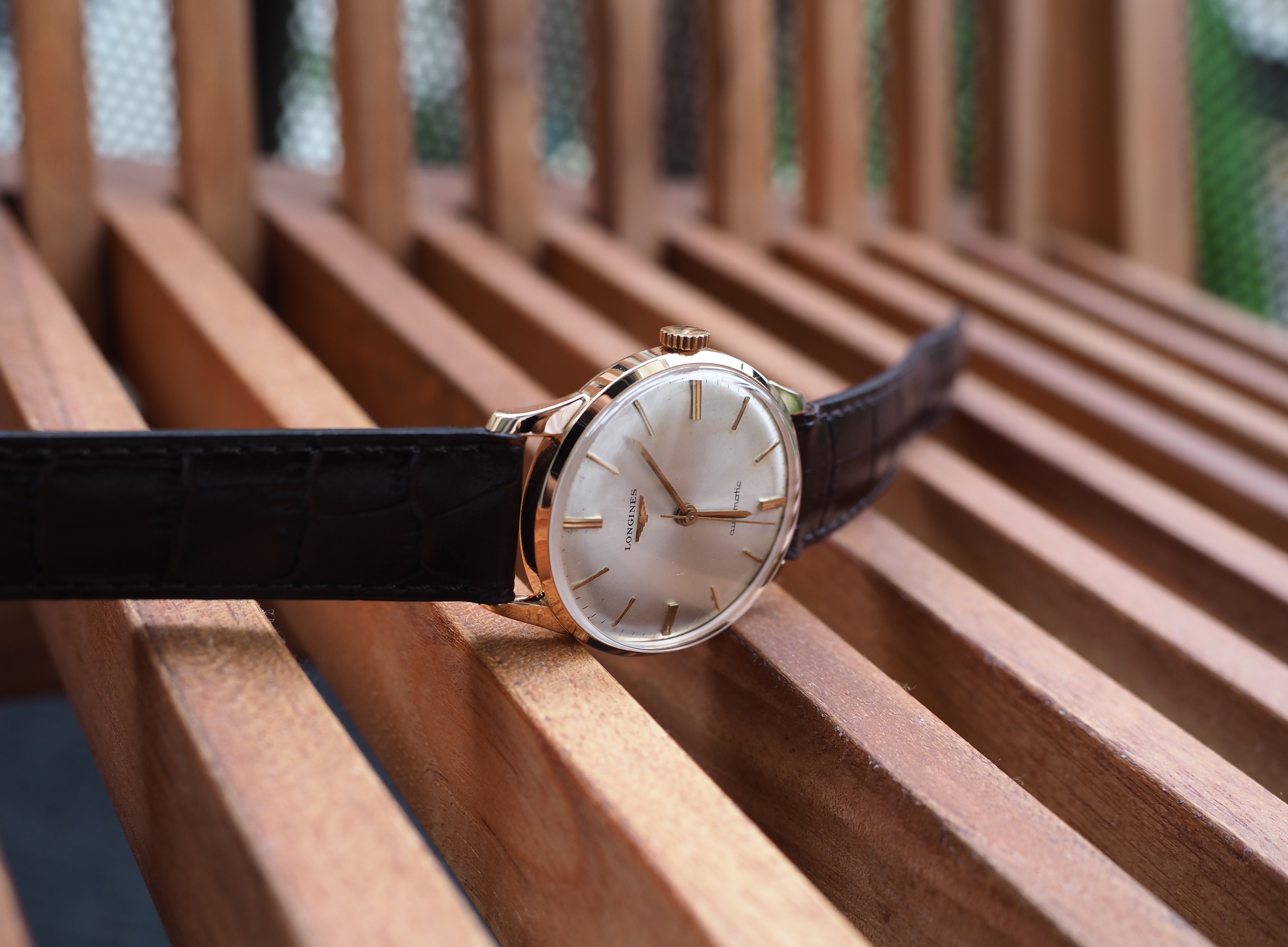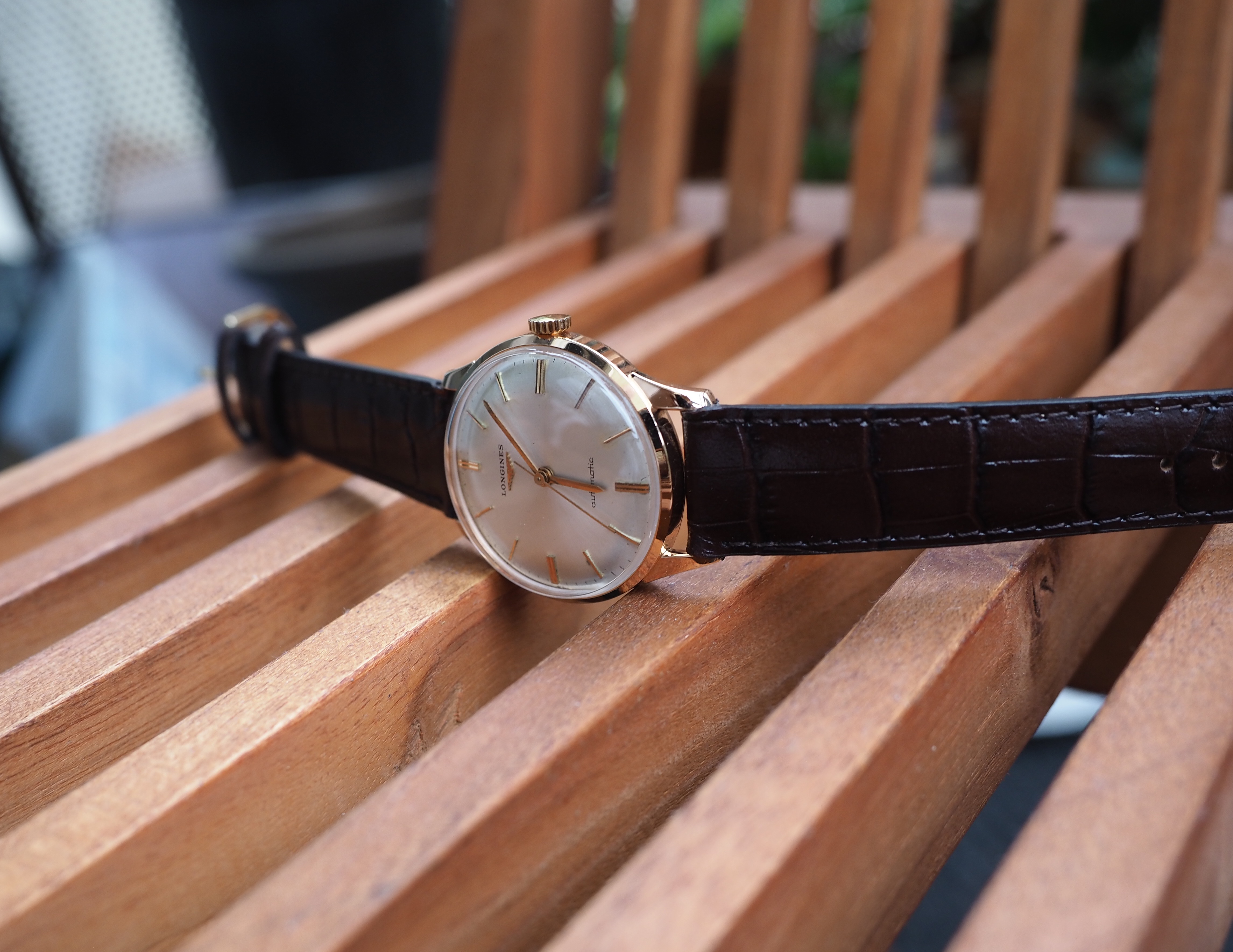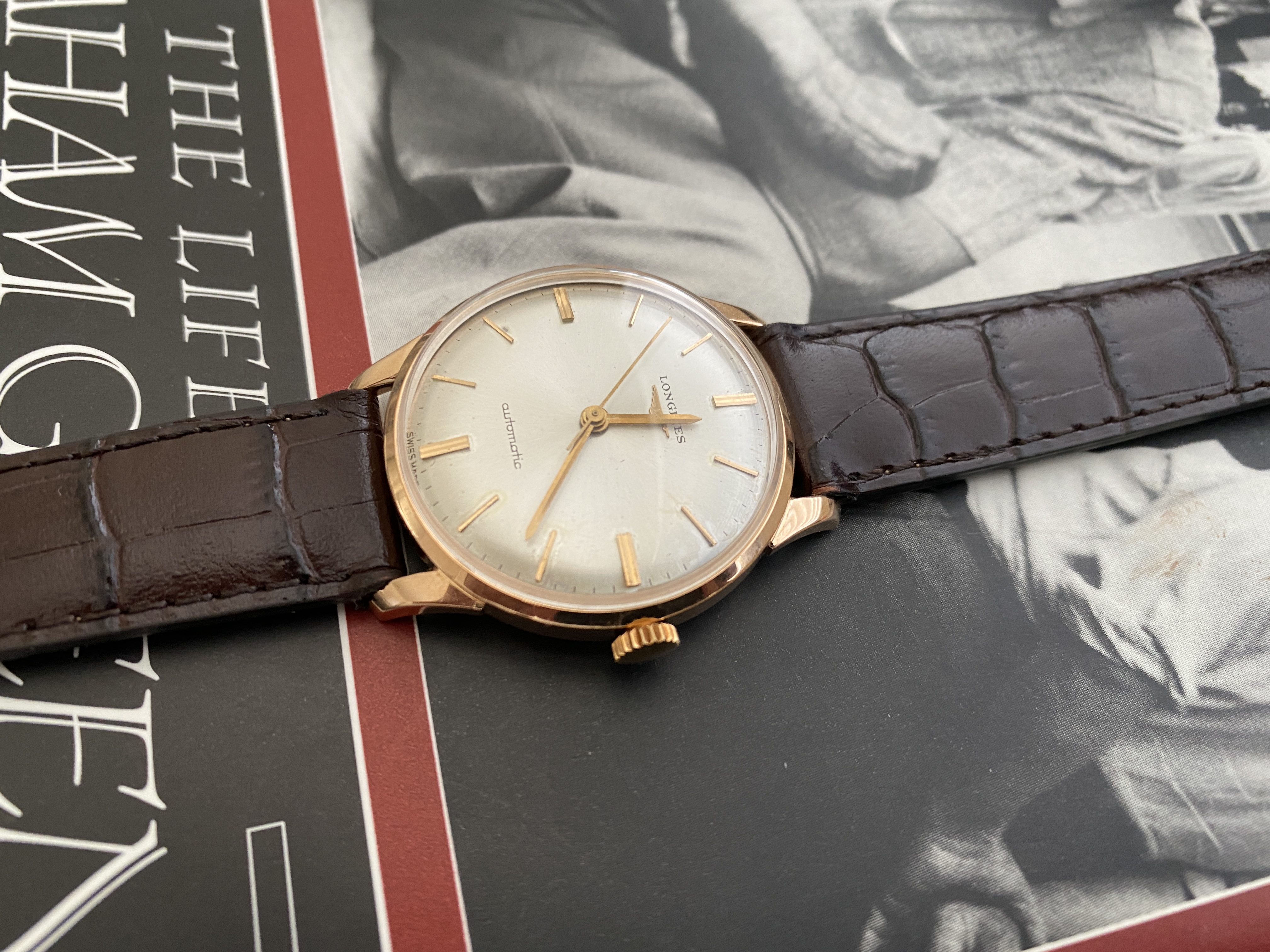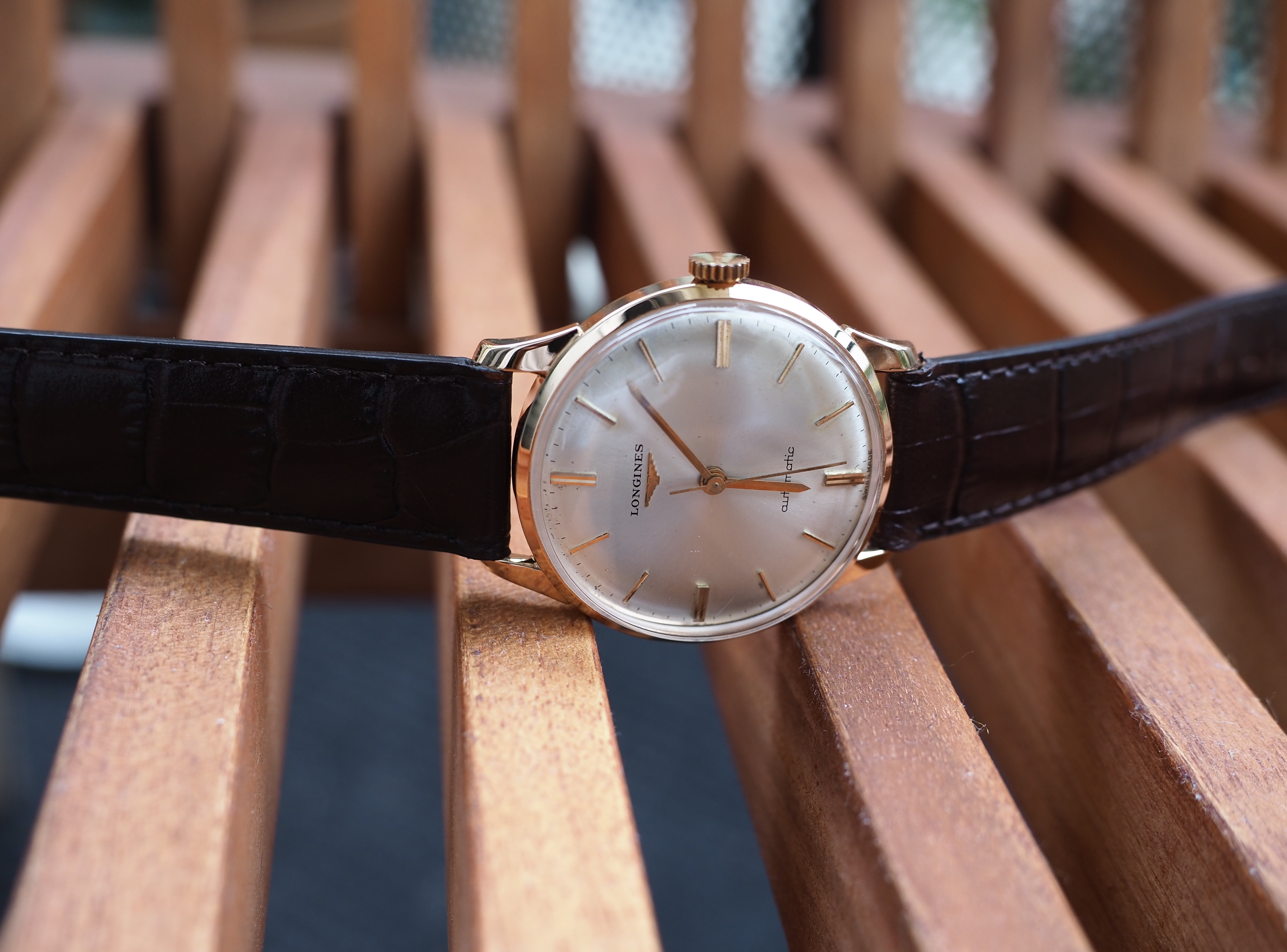 Case: The 34mm case is 18kt rose gold. It is marked with the Longines stamp on the inside and also stamped on the back of the lugs. The case looks clean. I cannot tell if it has been polished. I suspect a light polish.