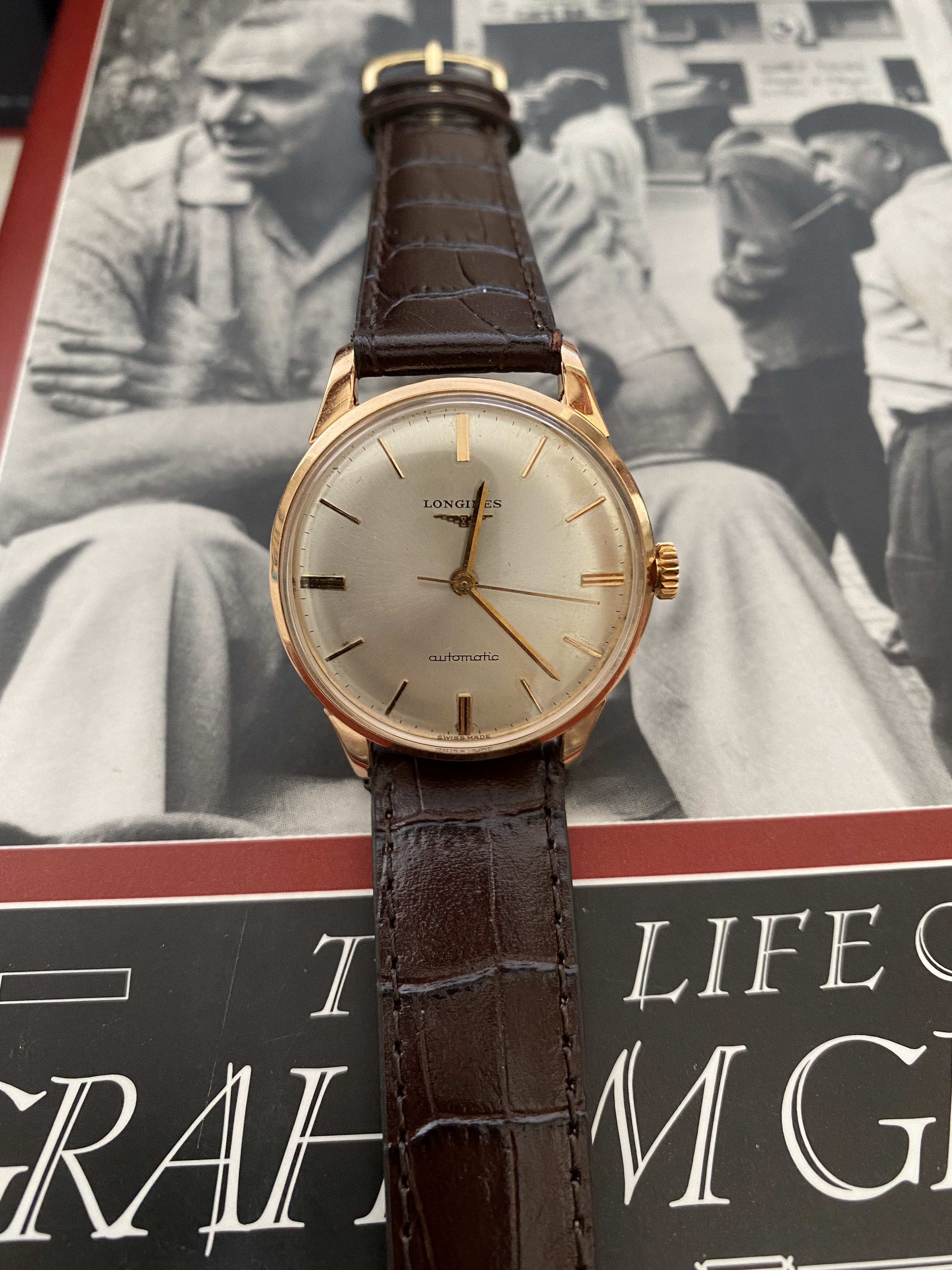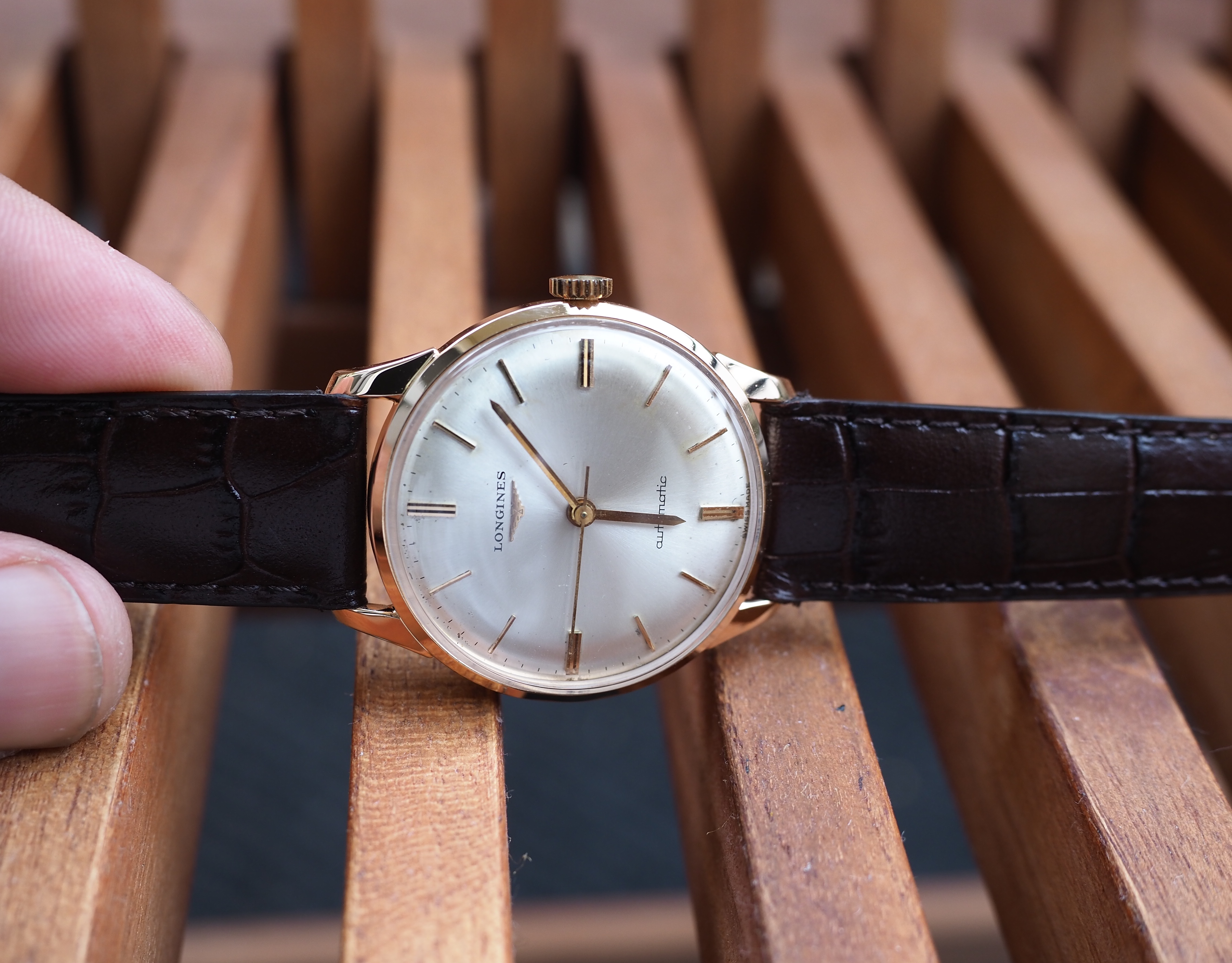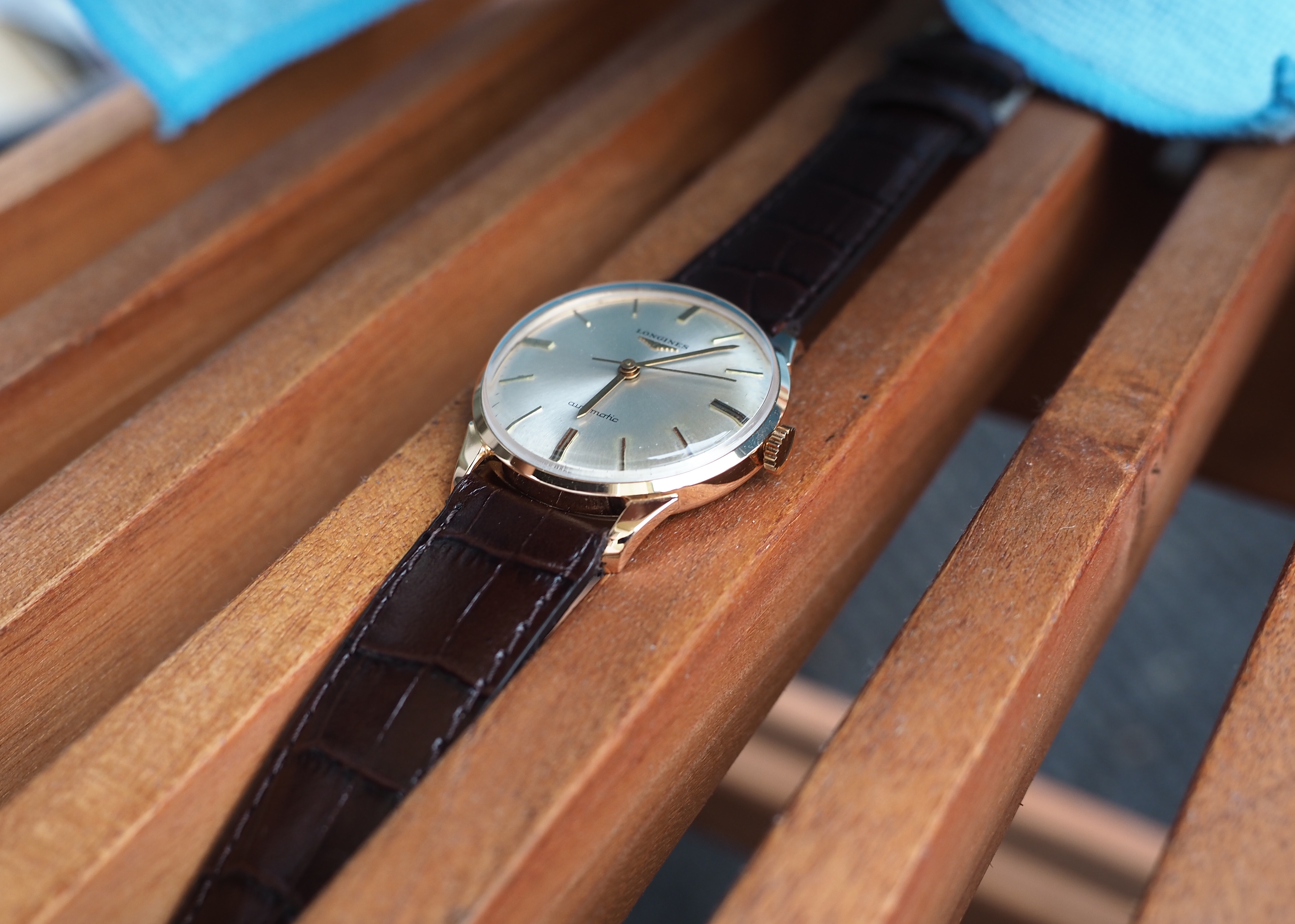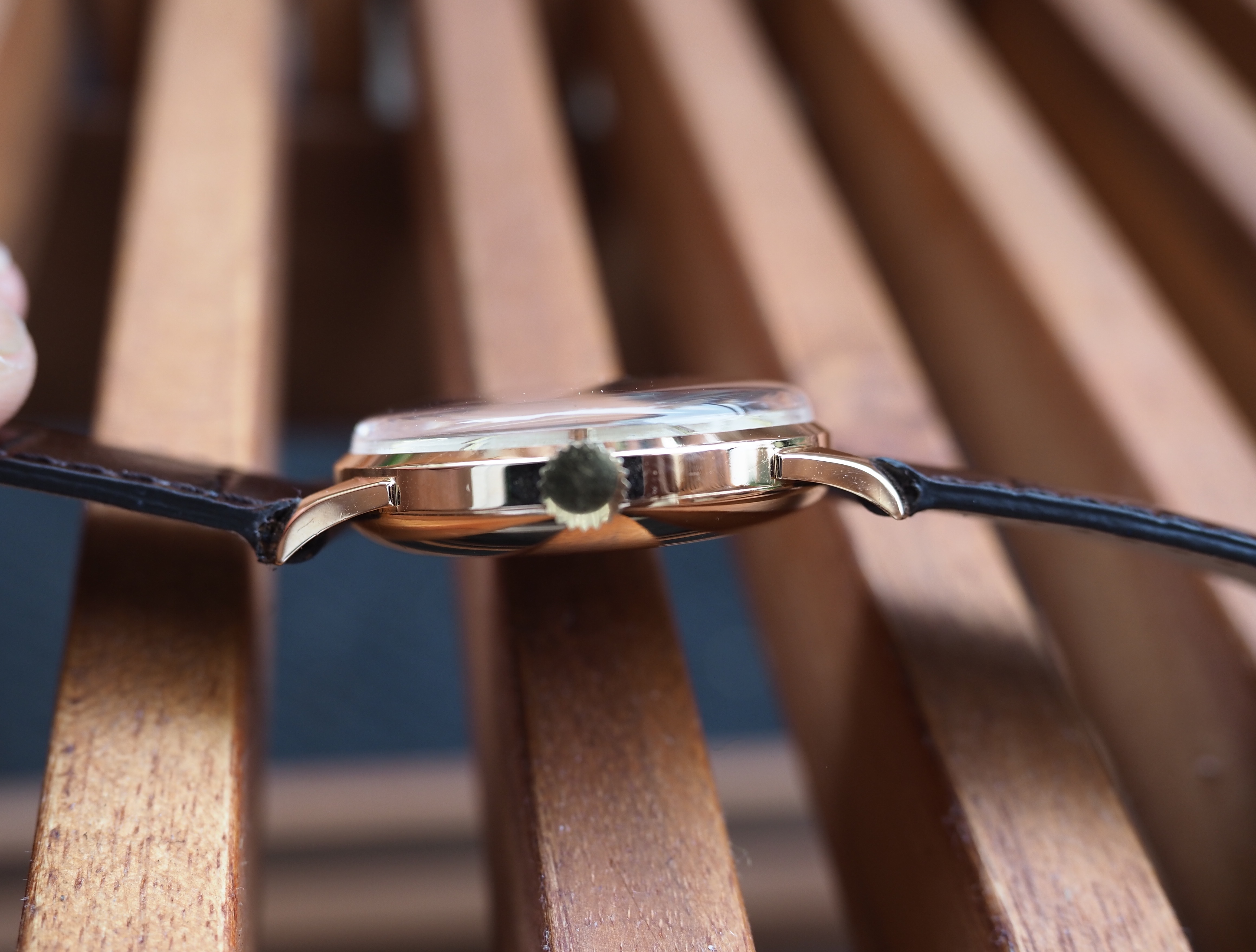 Case: The 34mm case is 18kt rose gold. It is marked with the Longines stamp on the inside and also stamped on the back of the lugs. The case looks clean. I cannot tell if it has been polished. I suspect a light polish.