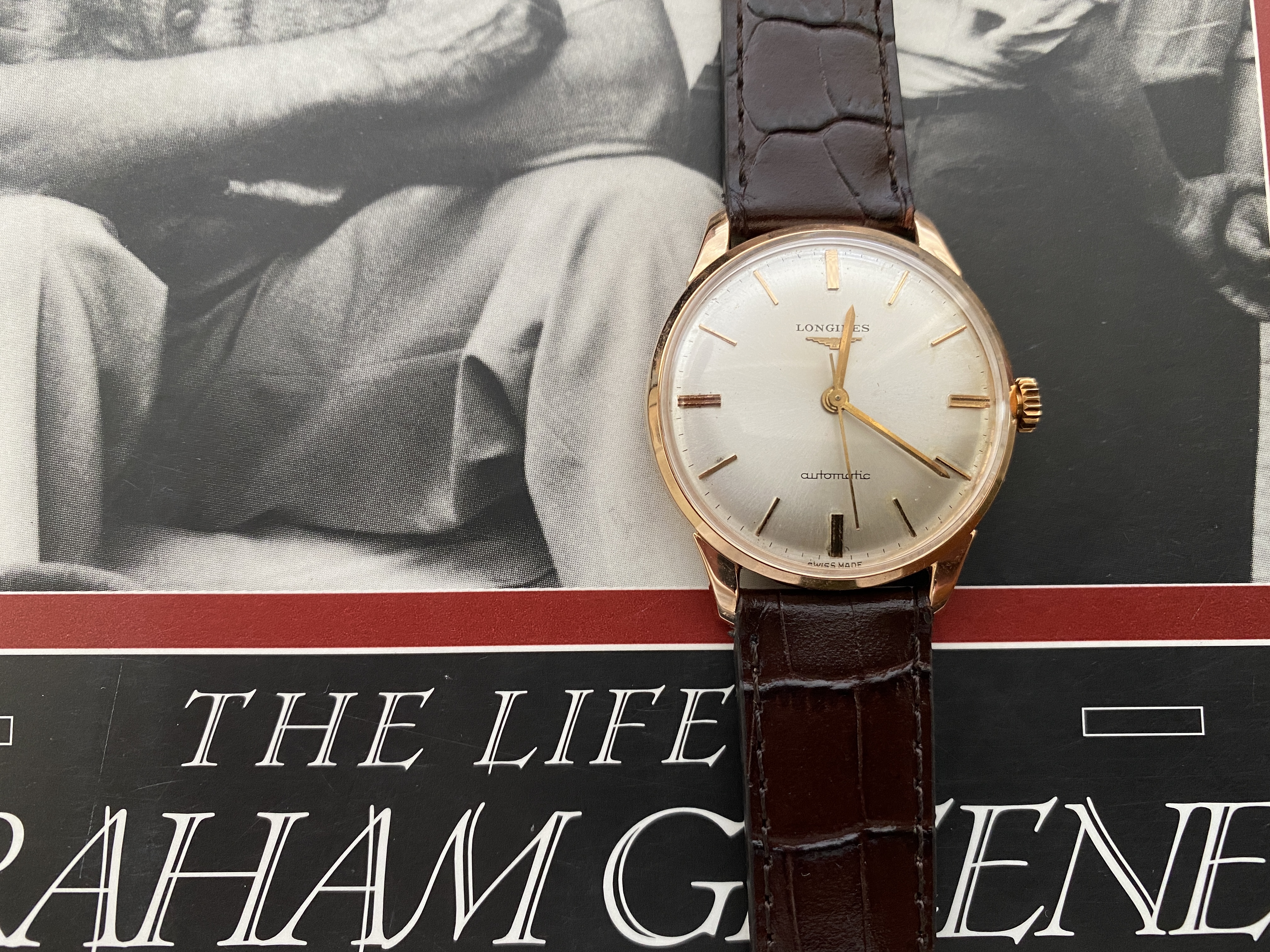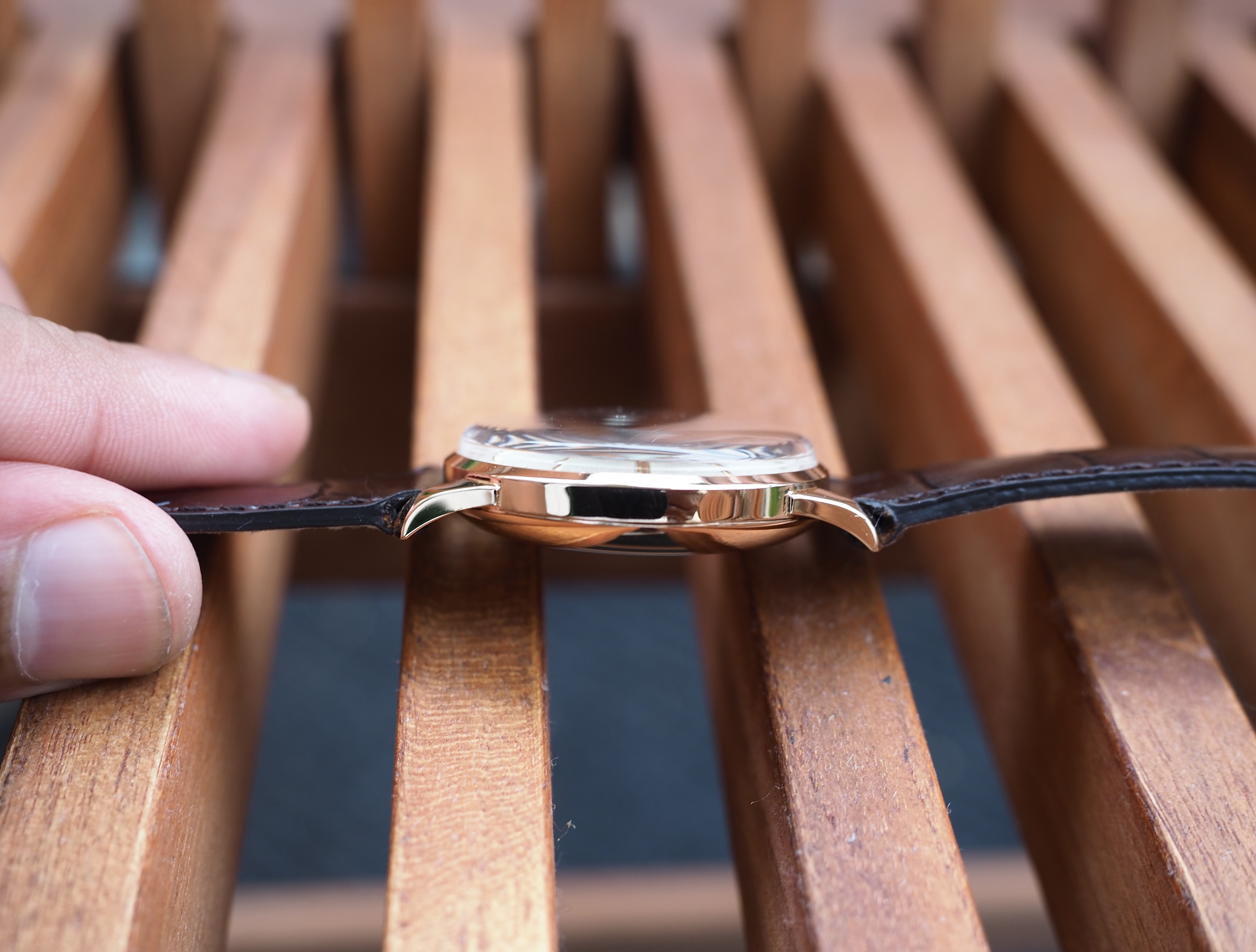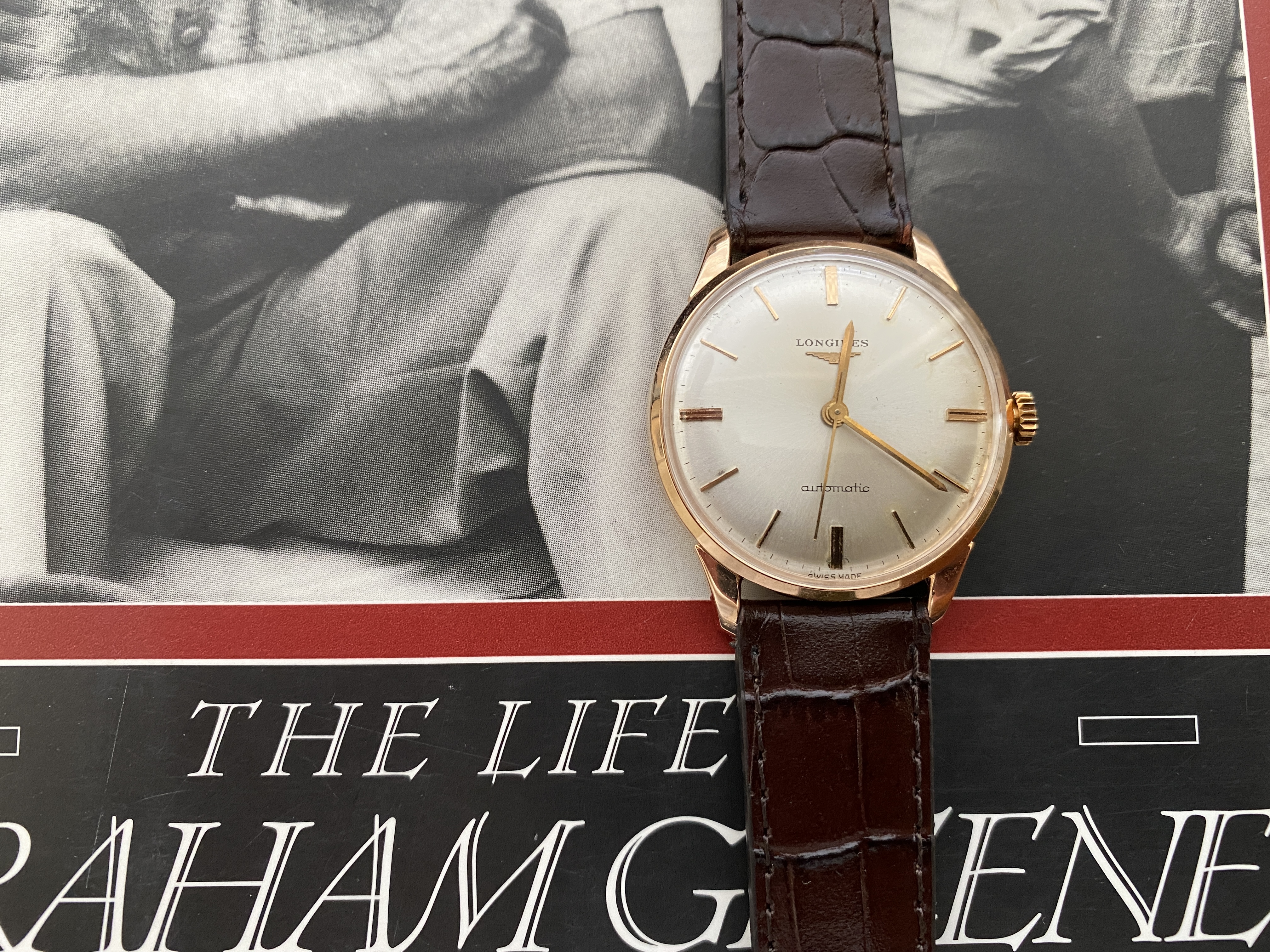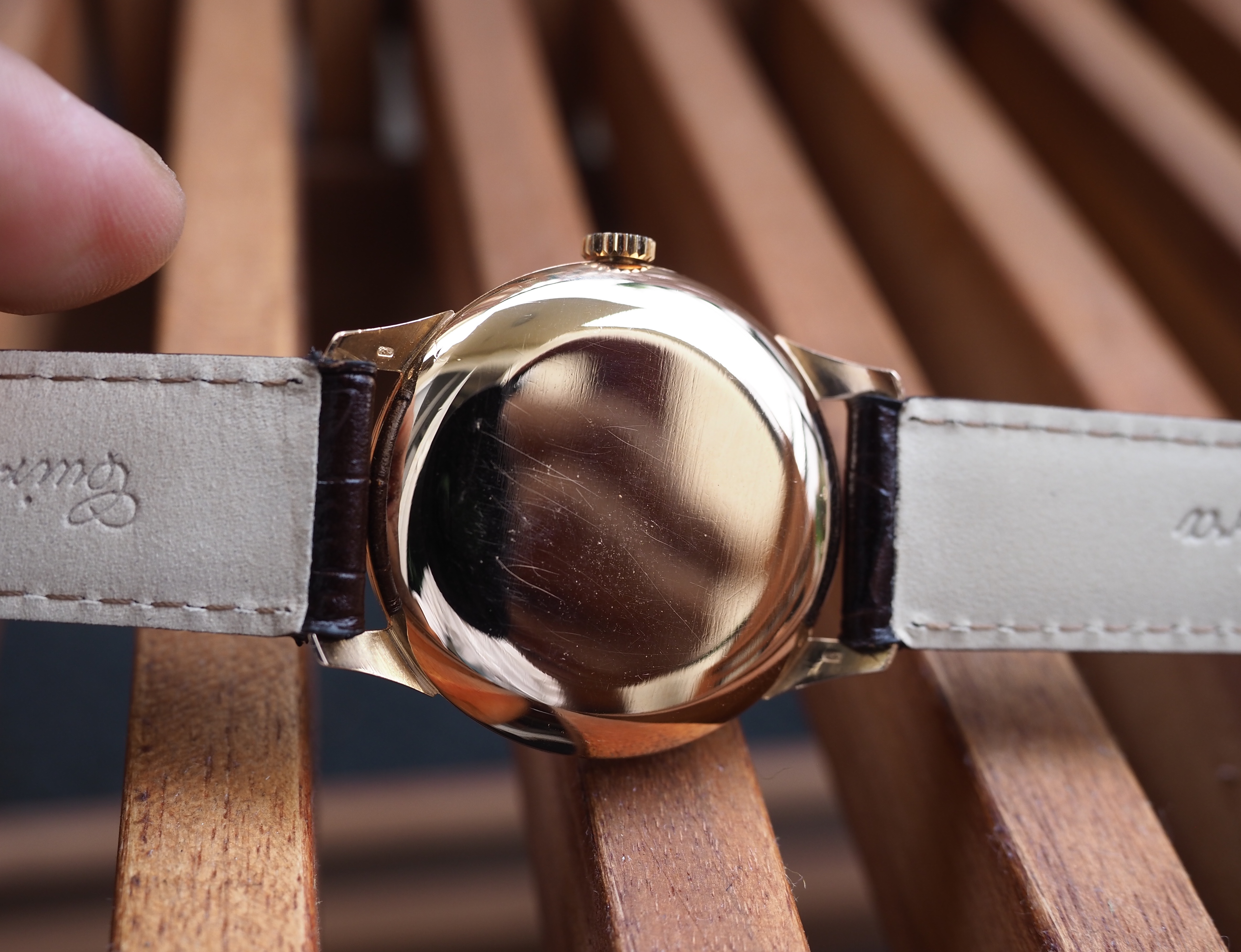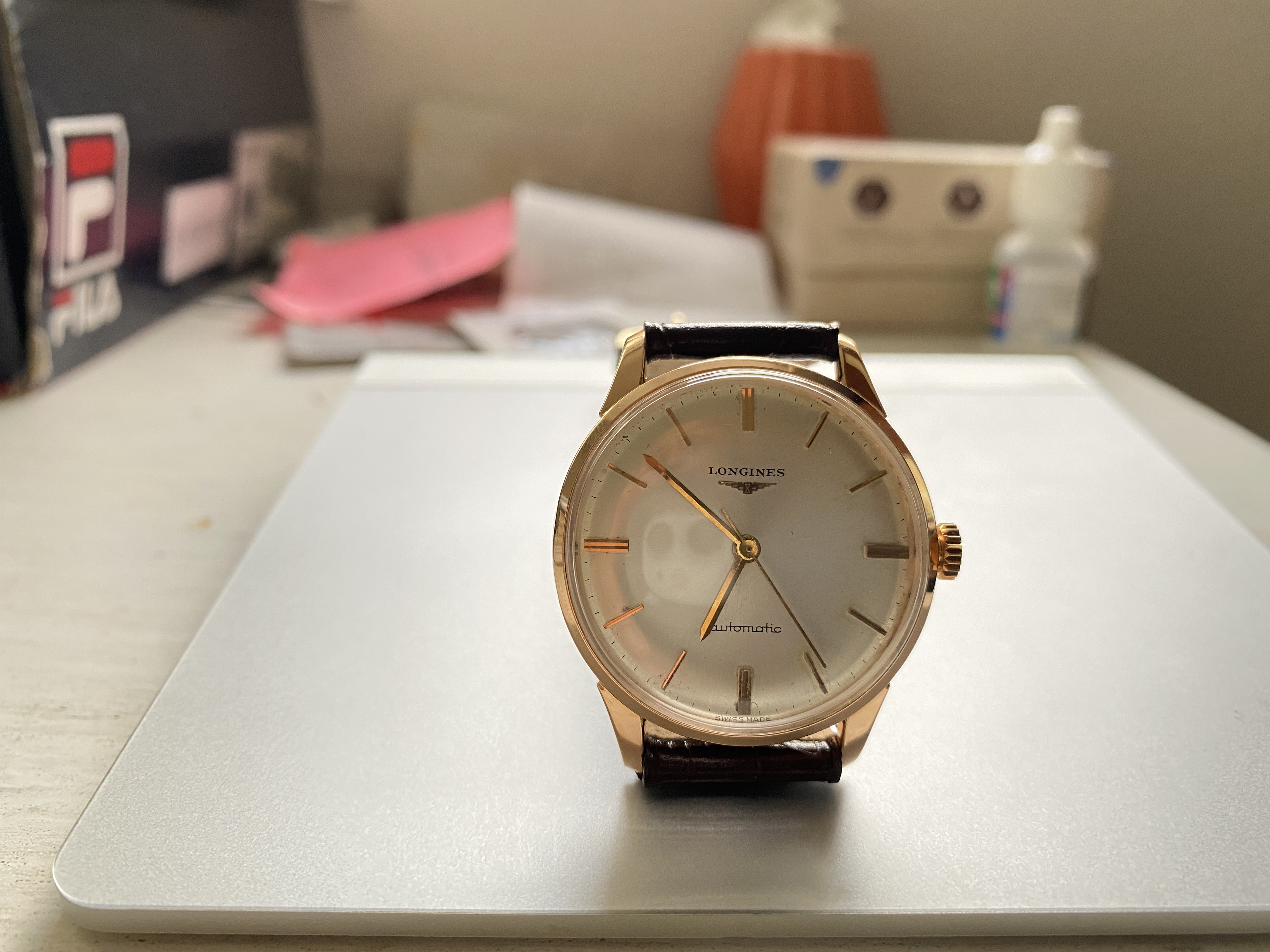 Case: The 34mm case is 18kt rose gold. It is marked with the Longines stamp on the inside and also stamped on the back of the lugs. The case looks clean. I cannot tell if it has been polished. I suspect a light polish.