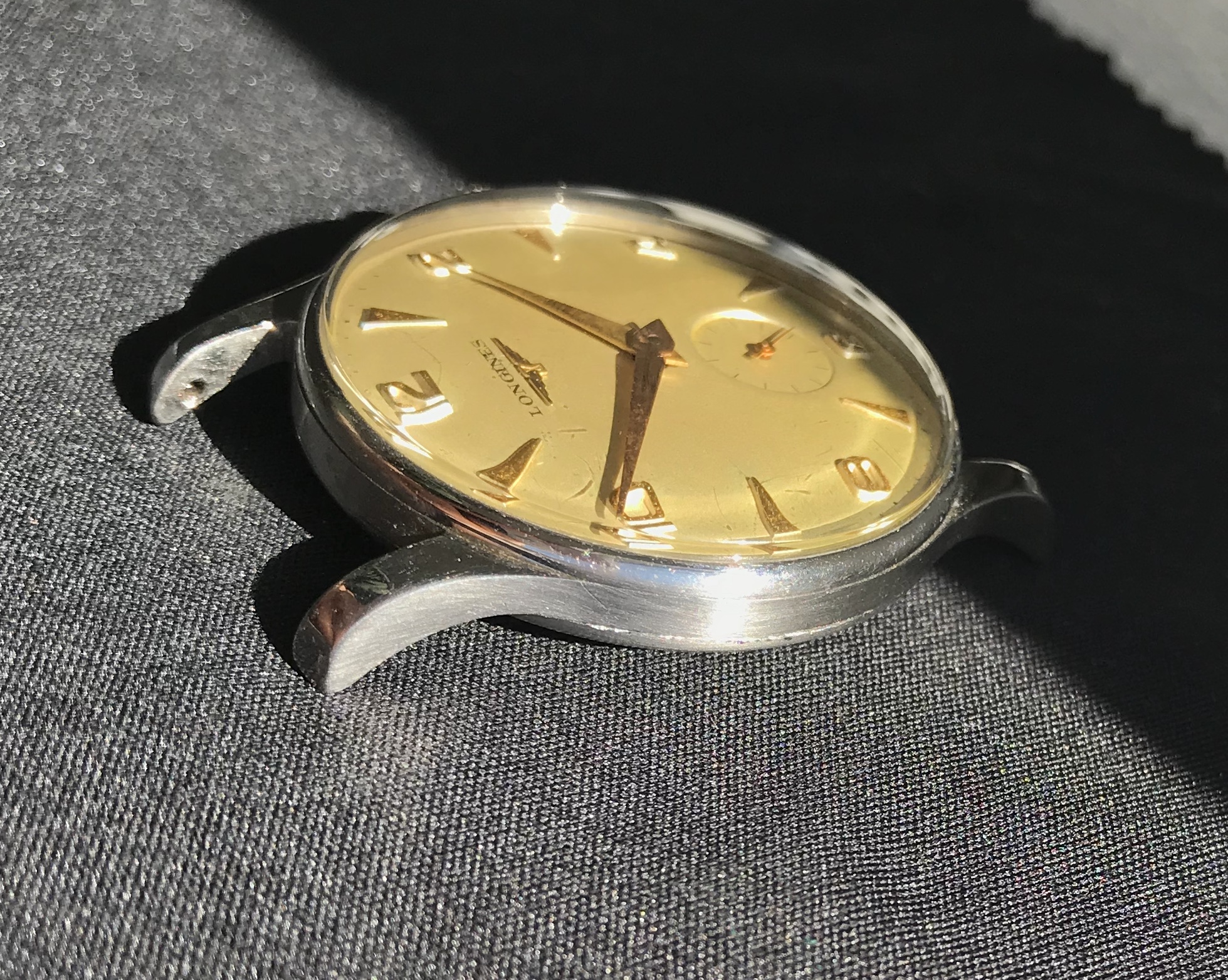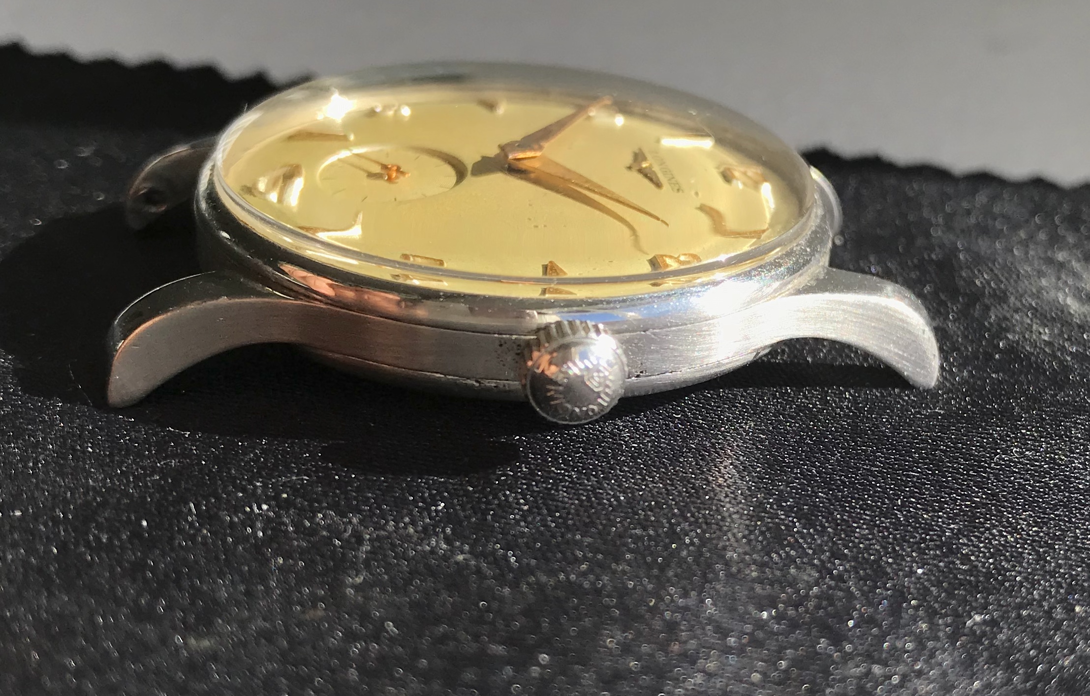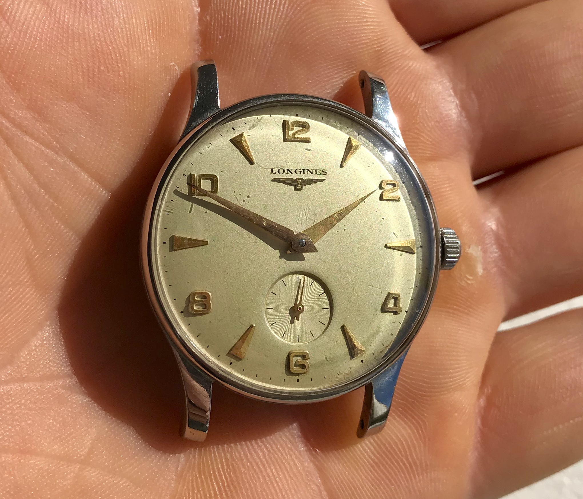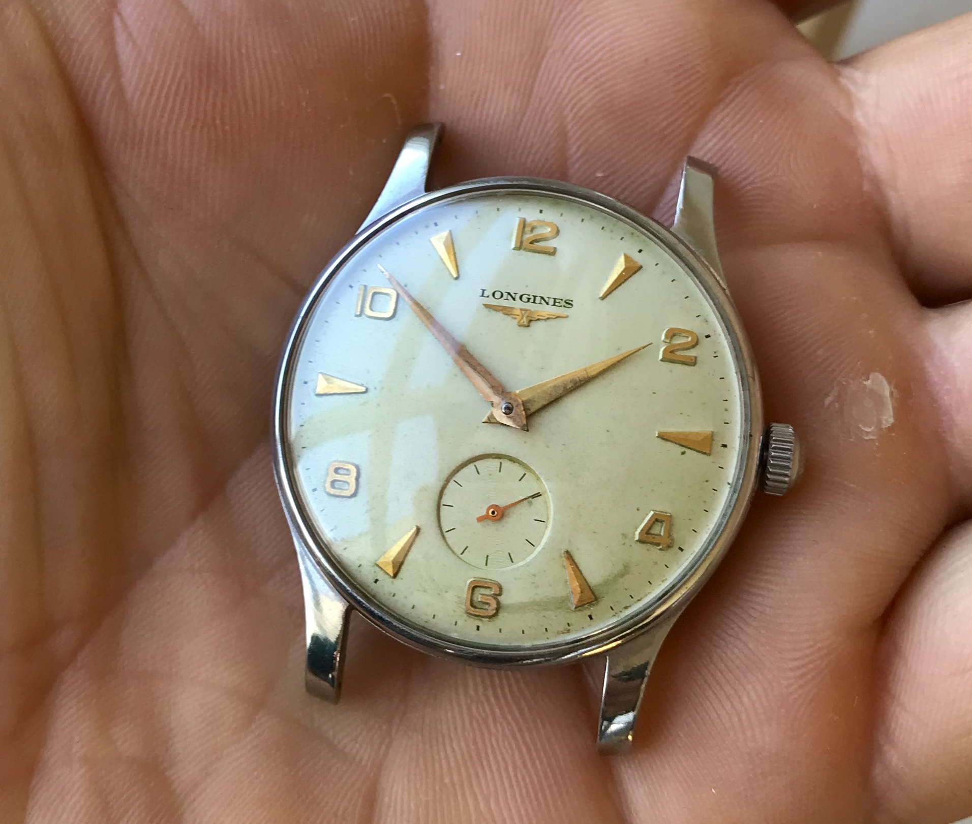The case is in good condition with its original shape intact, original signed Longines crown. Dial has some patina especially around 5 o'clock.