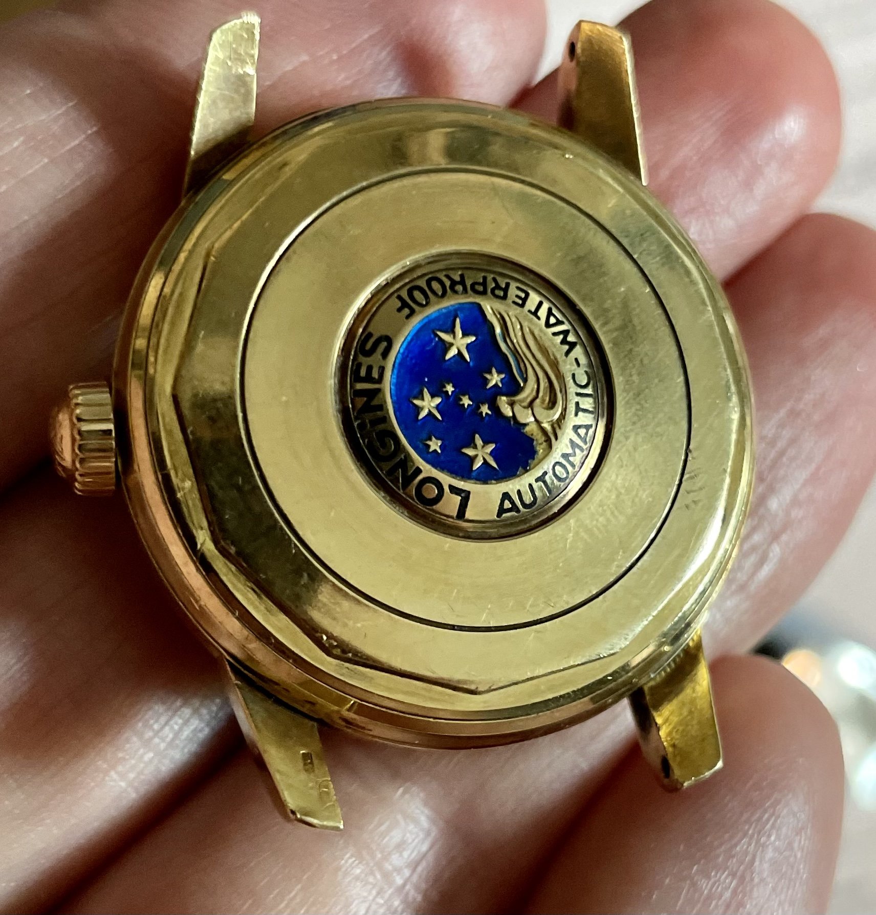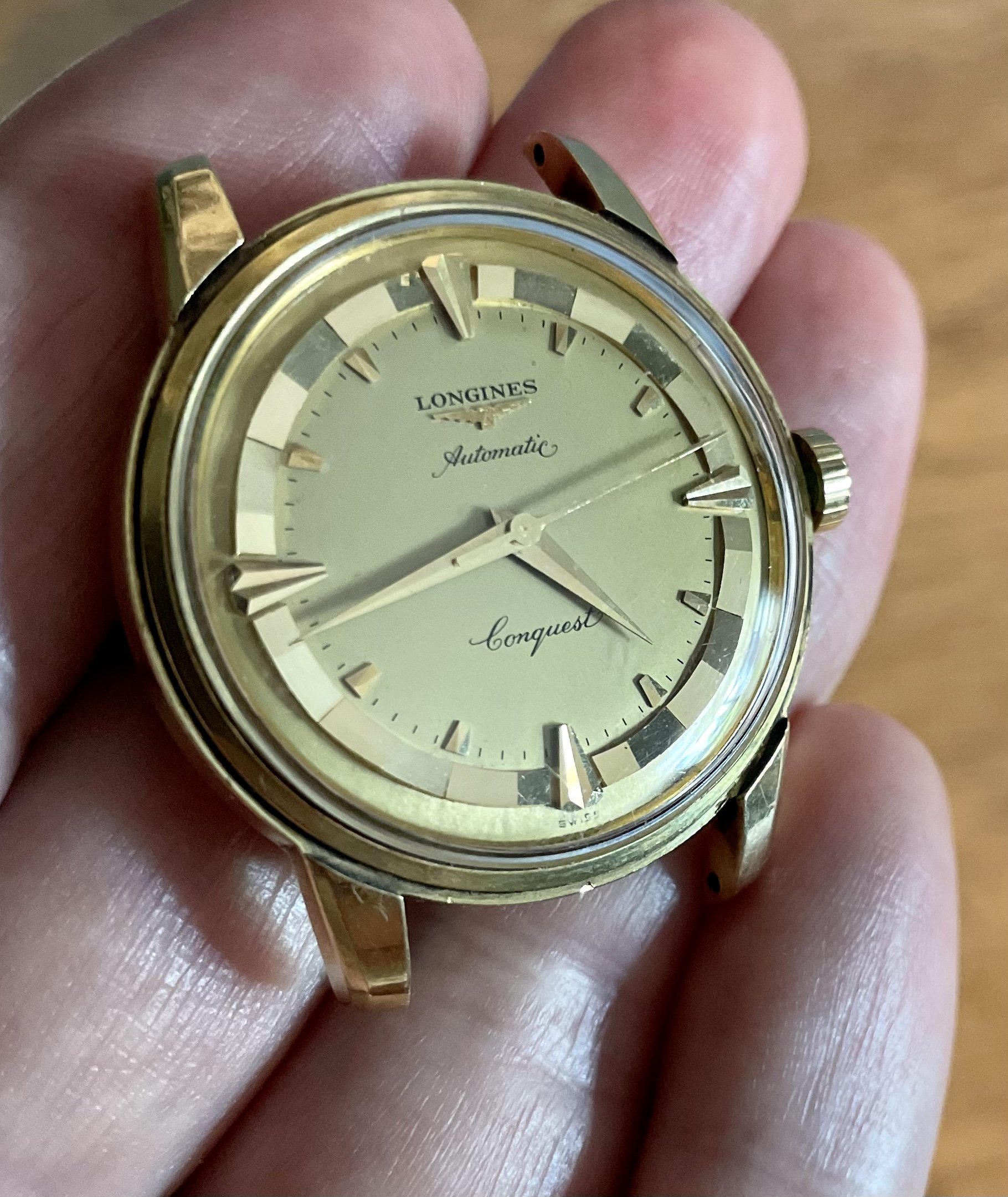 ·I recently picked up a ref. 9001 Conquest from the late 1950s and was quite pleased with the purchase until I realized that it was missing the original bezel. The bezel on the watch is quite a bit smaller and thinner, and the slightly different color/hue suggests that it likely isn’t solid 18k gold. The watch was advertised (on eBay) as being 100% original so I have the option of returning the watch, but before taking that step, I wanted to check with members more knowledgeable about Longines if the bezels on steel/gold cap beefy lug 50s Conquest models have (18k?) solid gold bezels.