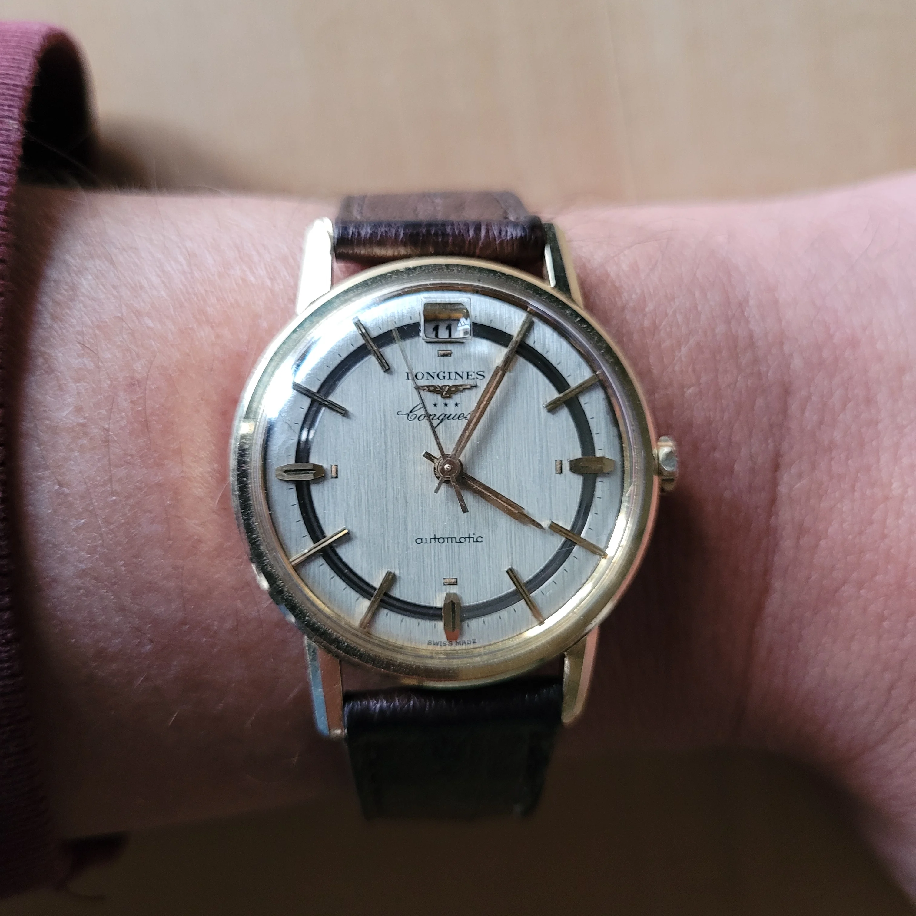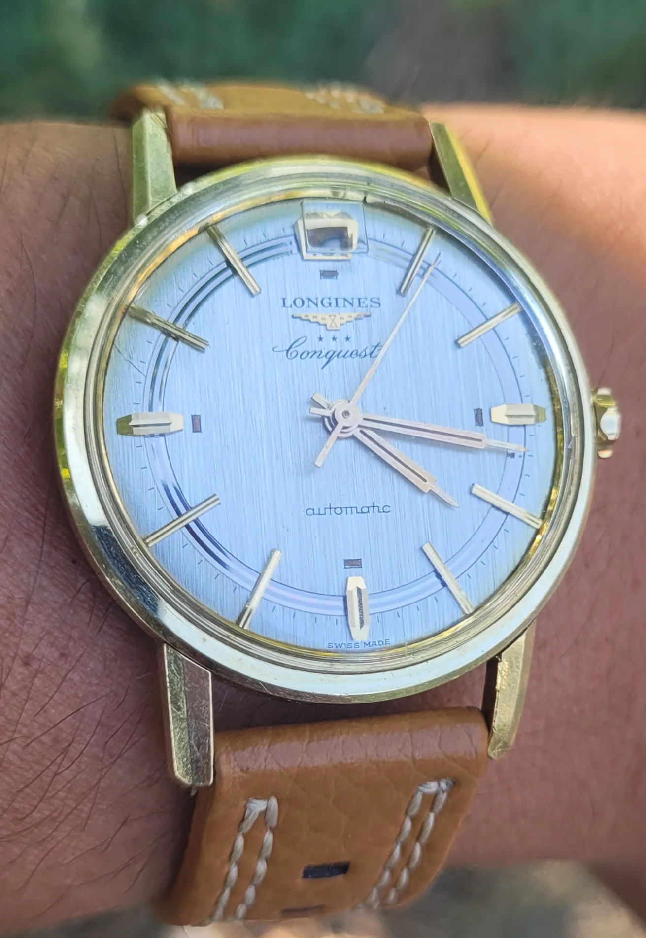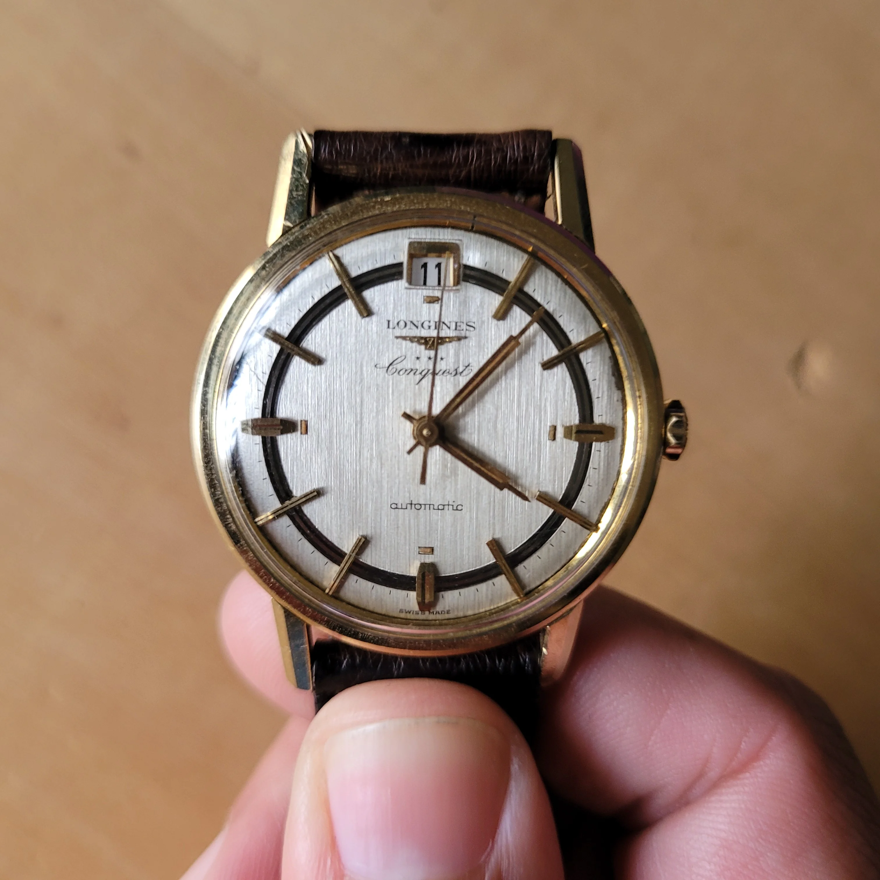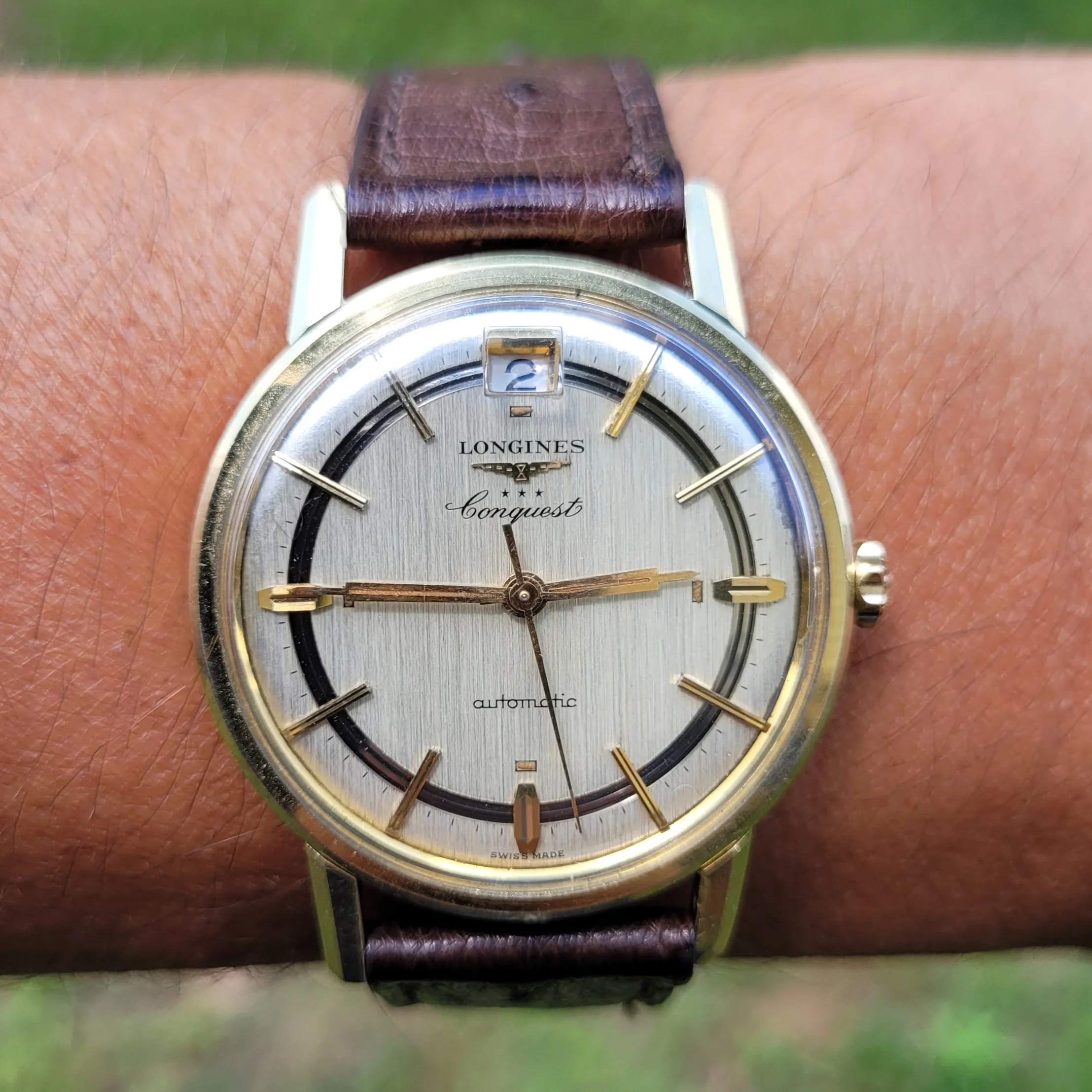 ·For sale is my 1960 Longines Conquest, ref. 9026, powered by a caliber 291 automatic movement. According to Longines this watch was shipped to Mexico in August of 1960. I've been wearing this watch daily for a little over a week. It's running well but gains approximately a minute a day. I recommend getting it serviced if you're going to wear it daily. The lugs are sharp and there is no wear through of the gold cap anywhere. This is a very handsome watch, I especially like the hands and 12 o'clock date window. I'm asking $850 USD + shipping OBO.
