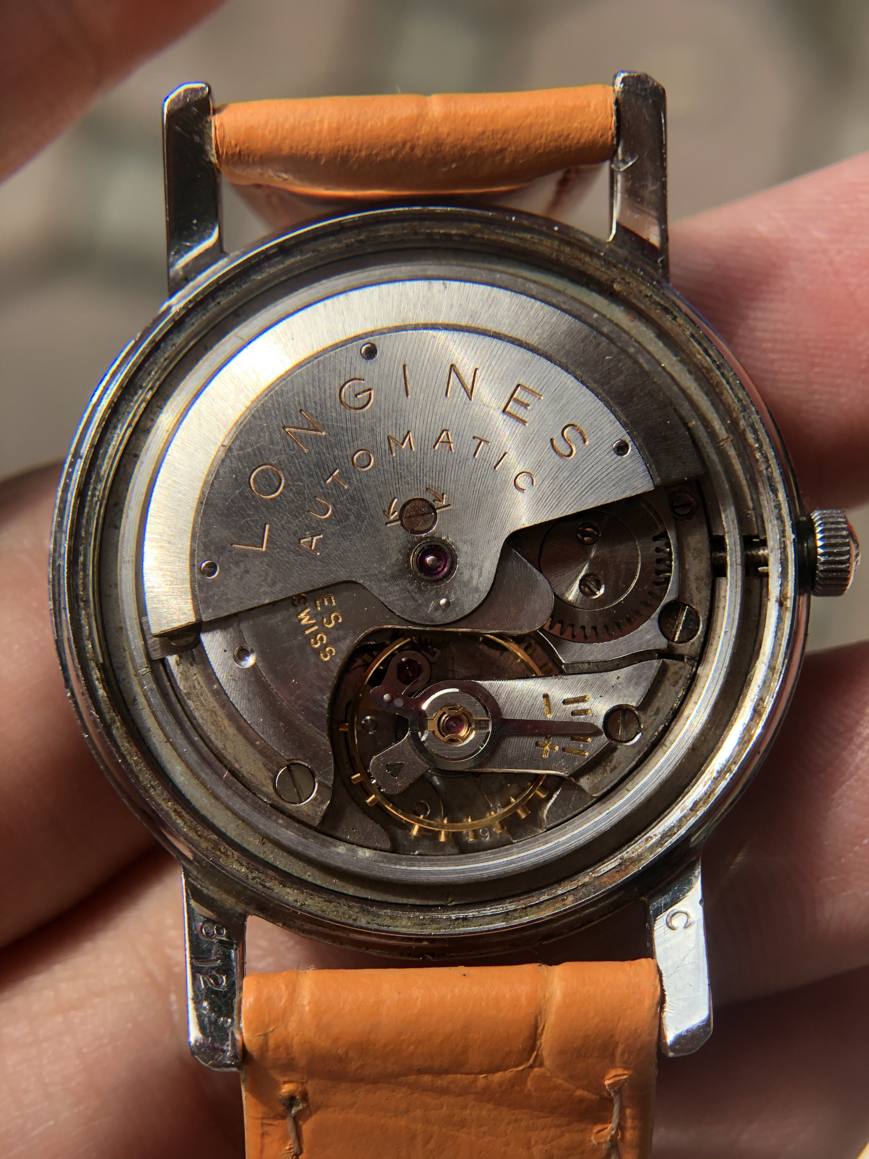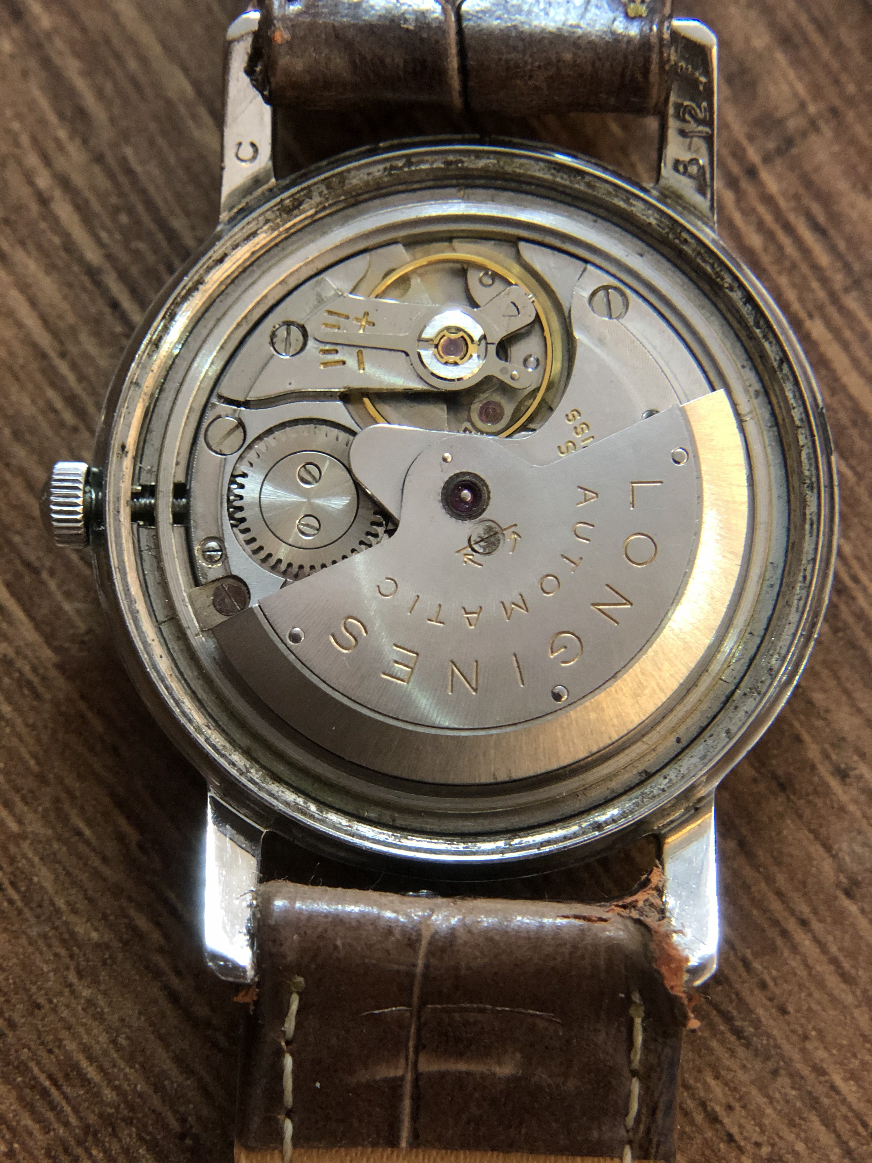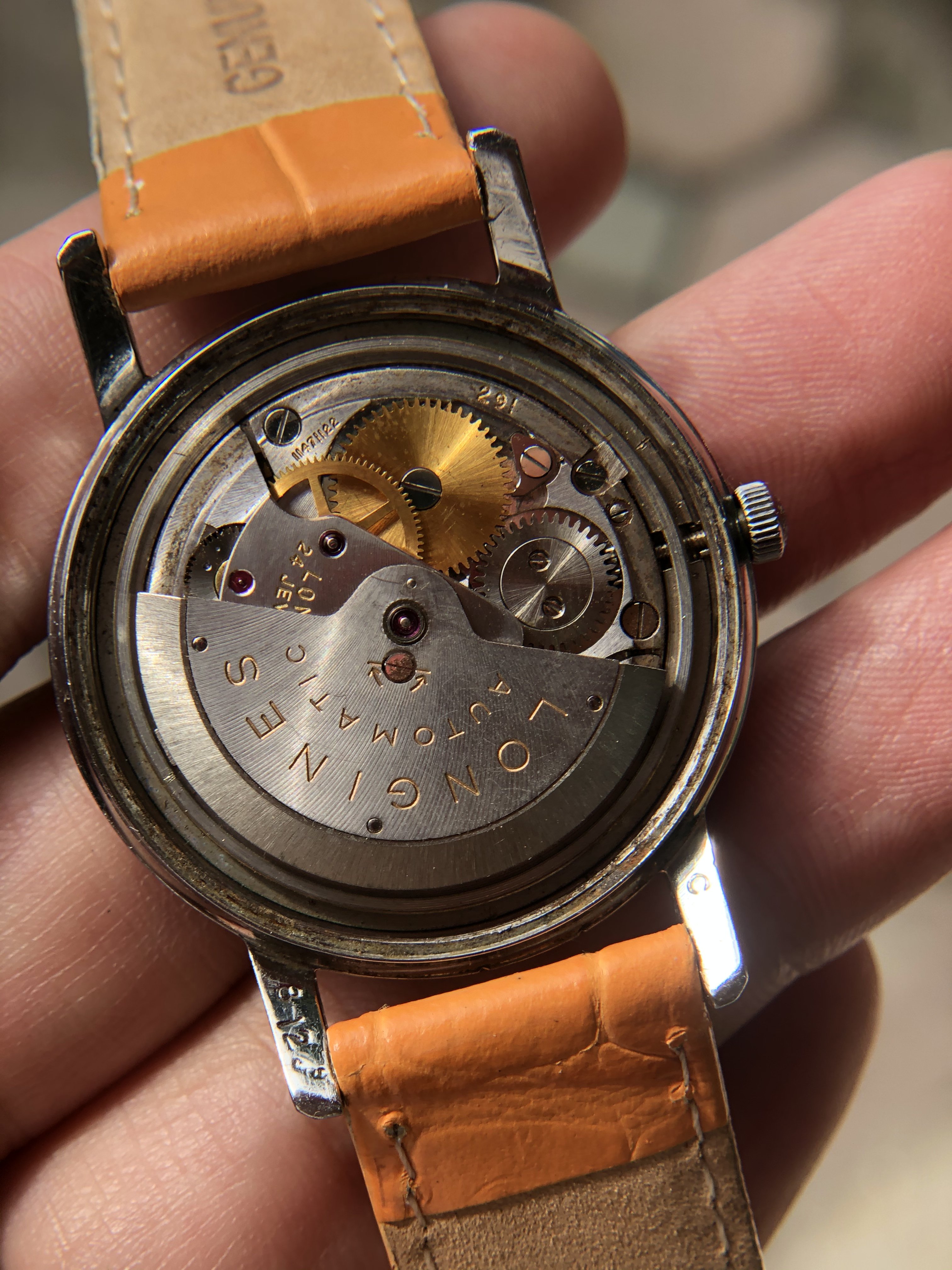 - Original Longines Cal. 291 movement, running, date fuction work, winding fine, but unknow service and untested for accuracy.