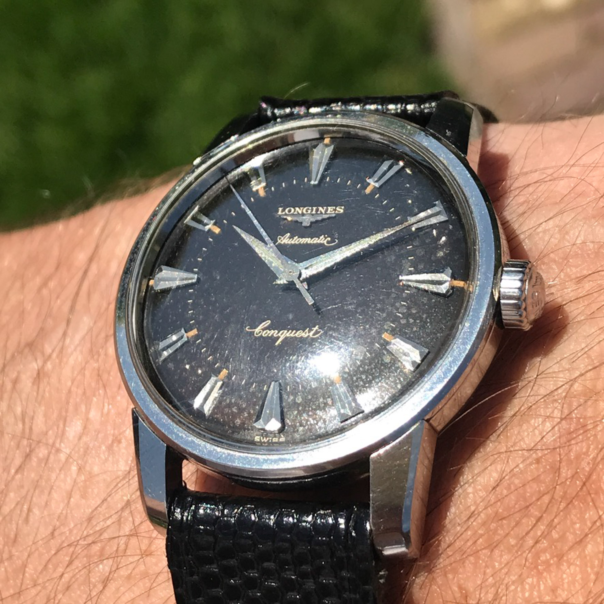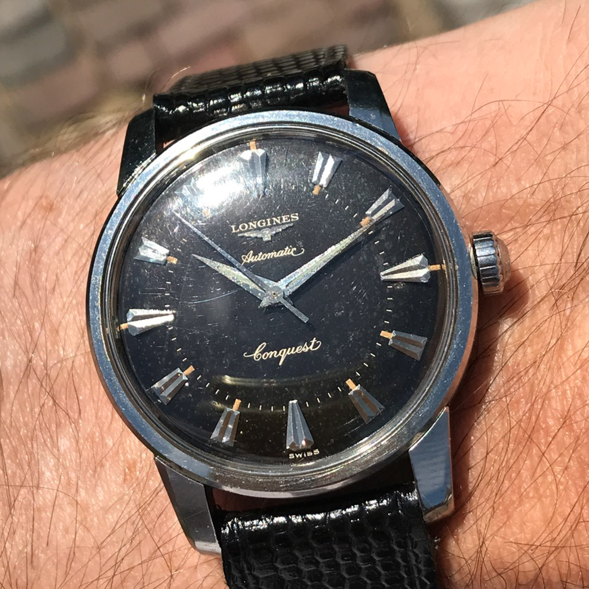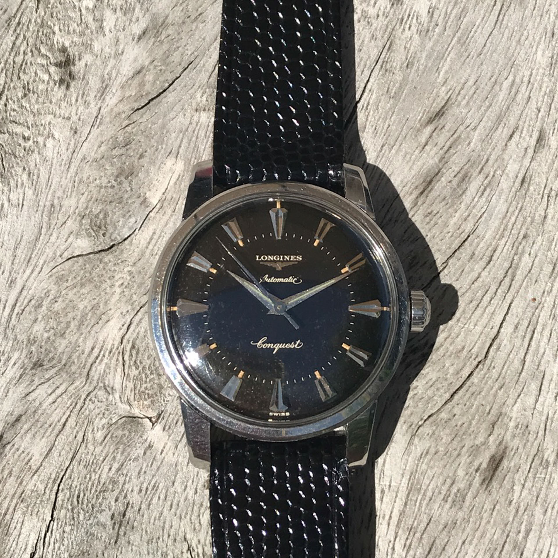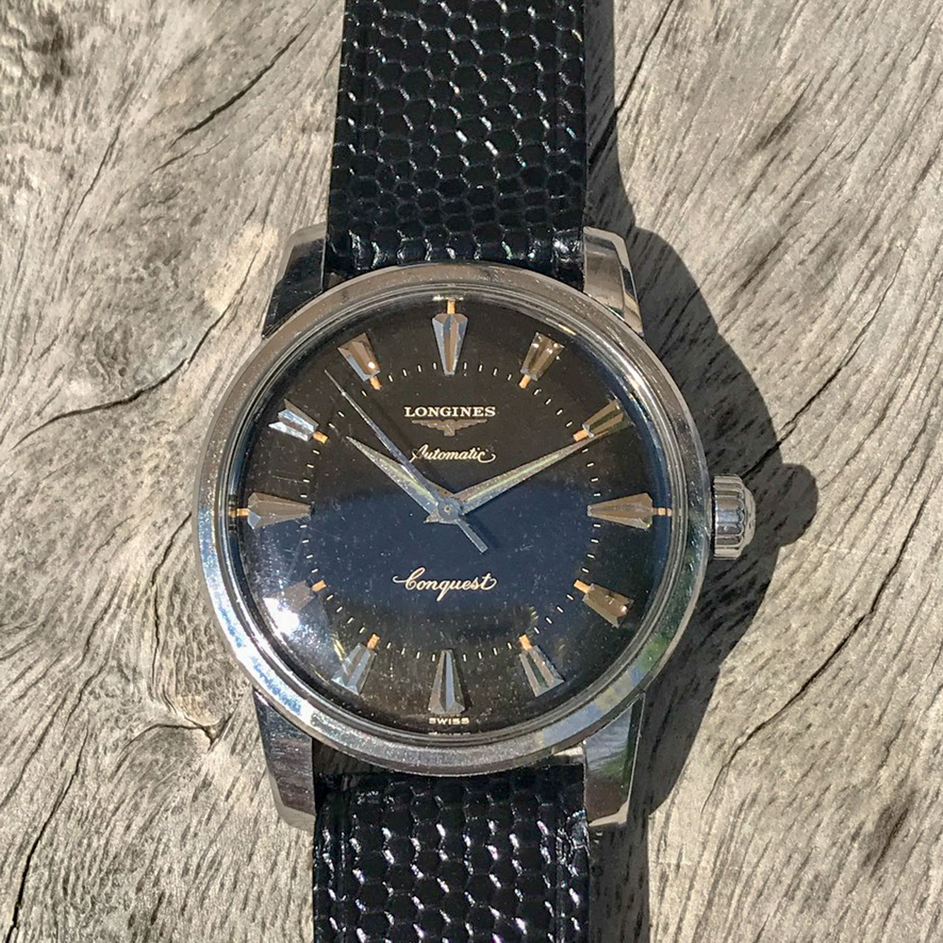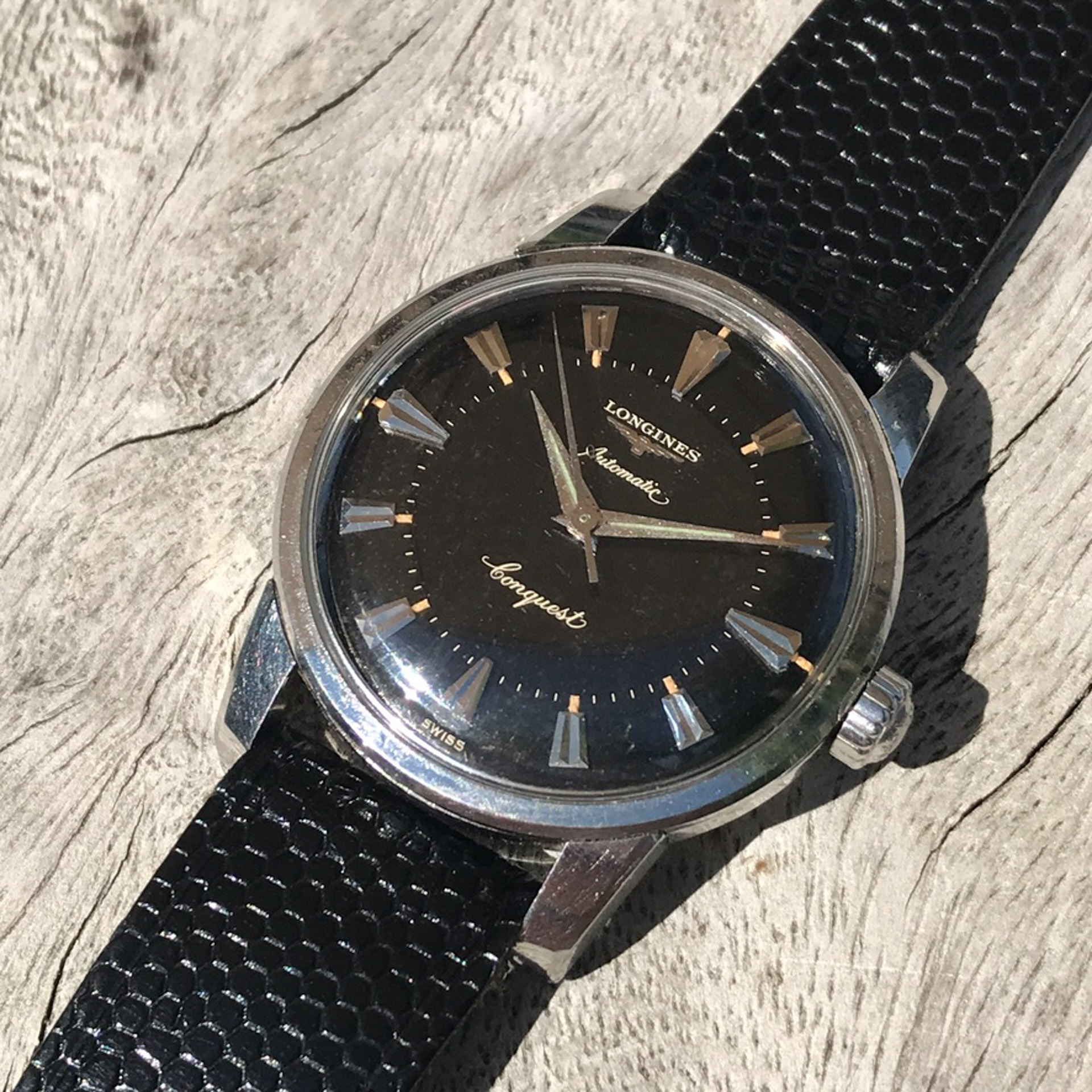 Notes: Absolutely stunning example of a rare late 1950s Longines Conquest with a black gilt light pie pan dial. Very hard to find these in this condition.