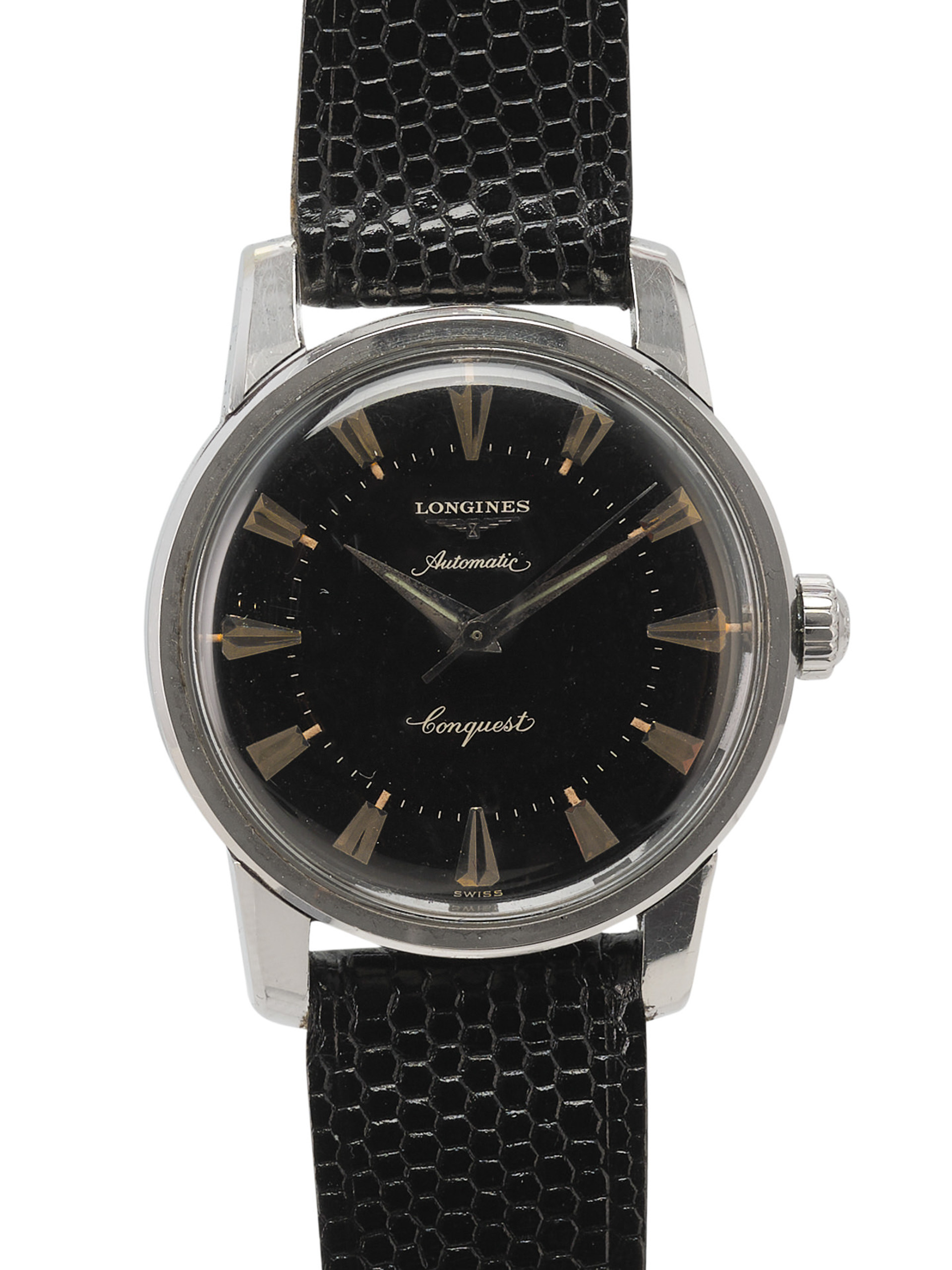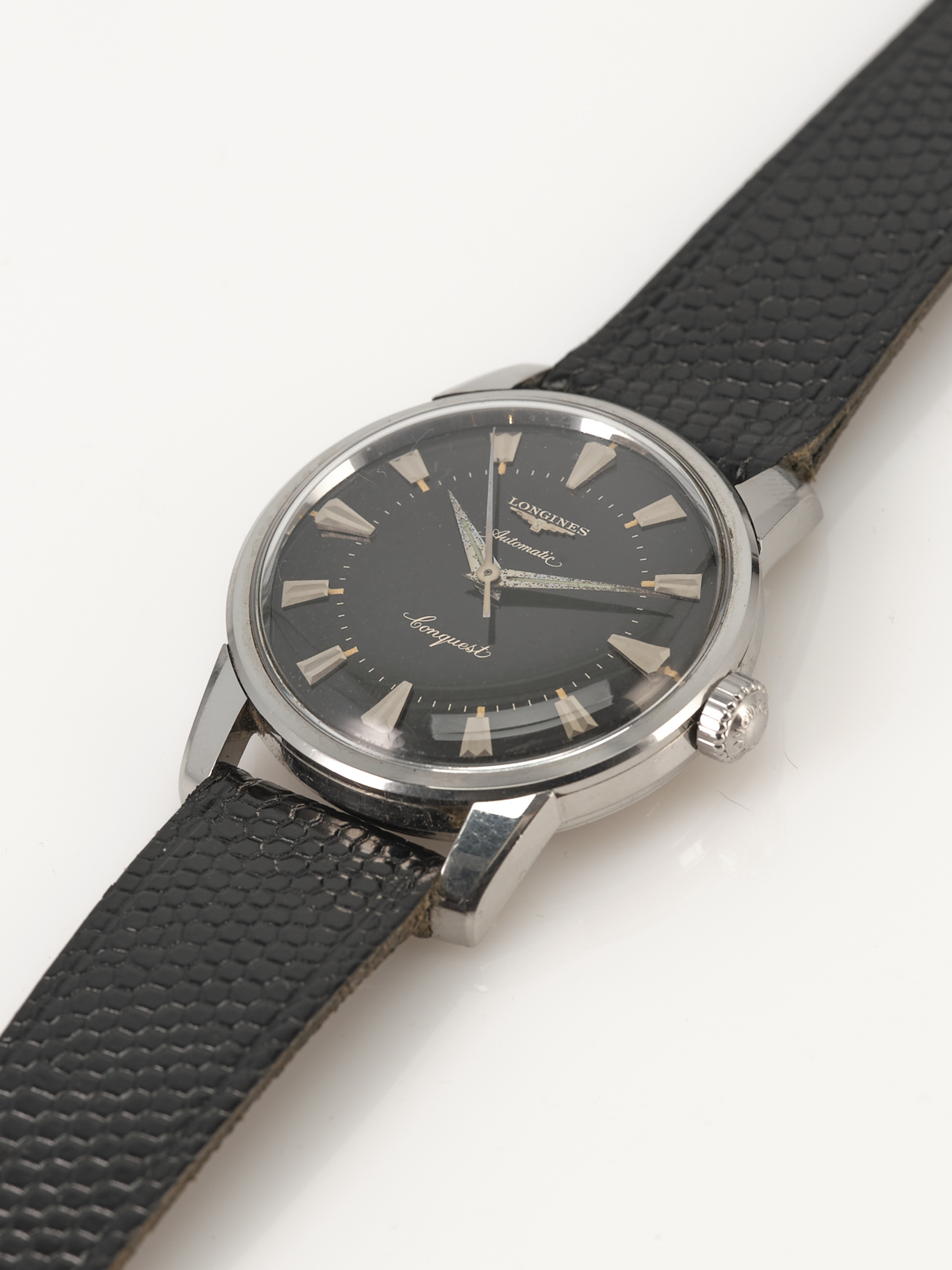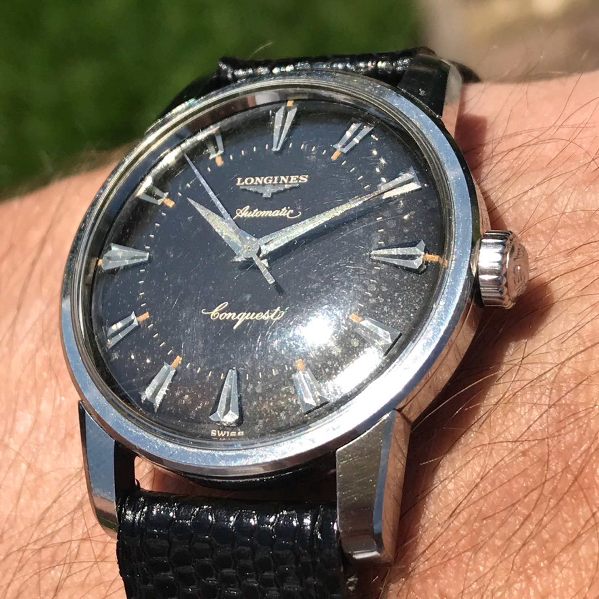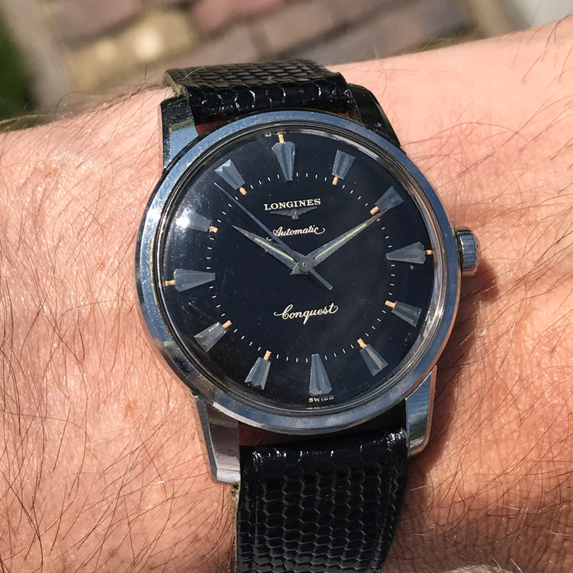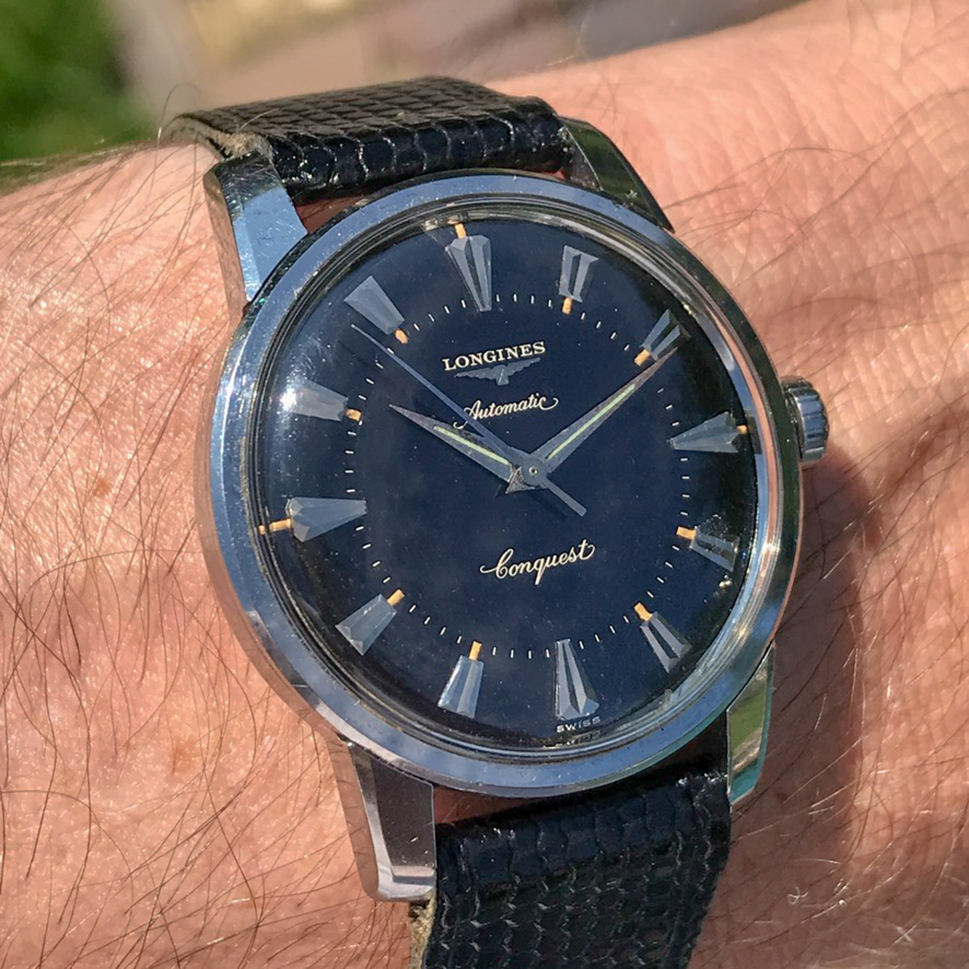 Notes: Absolutely stunning example of a rare late 1950s Longines Conquest with a black gilt light pie pan dial. Very hard to find these in this condition.