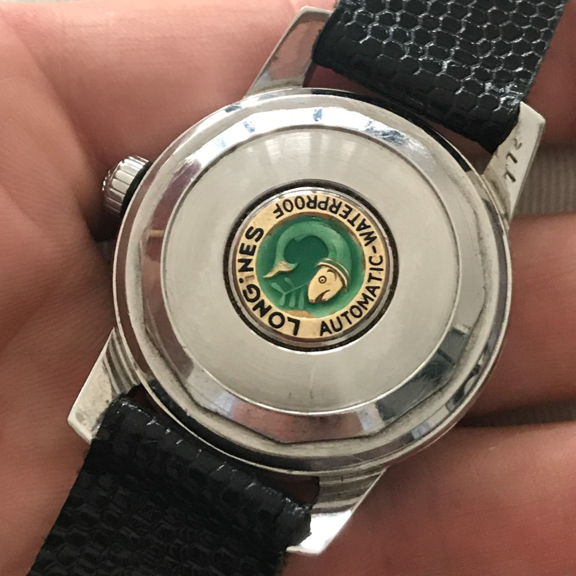 - Case: It has a solid stainless steel case with screw down case back. Good stainless steel case that has light wear from use. It has a yellow gold fluted bezel. signed original crown. ld medallion on caseback "Fish in Kelp" Longines Seal of Quality