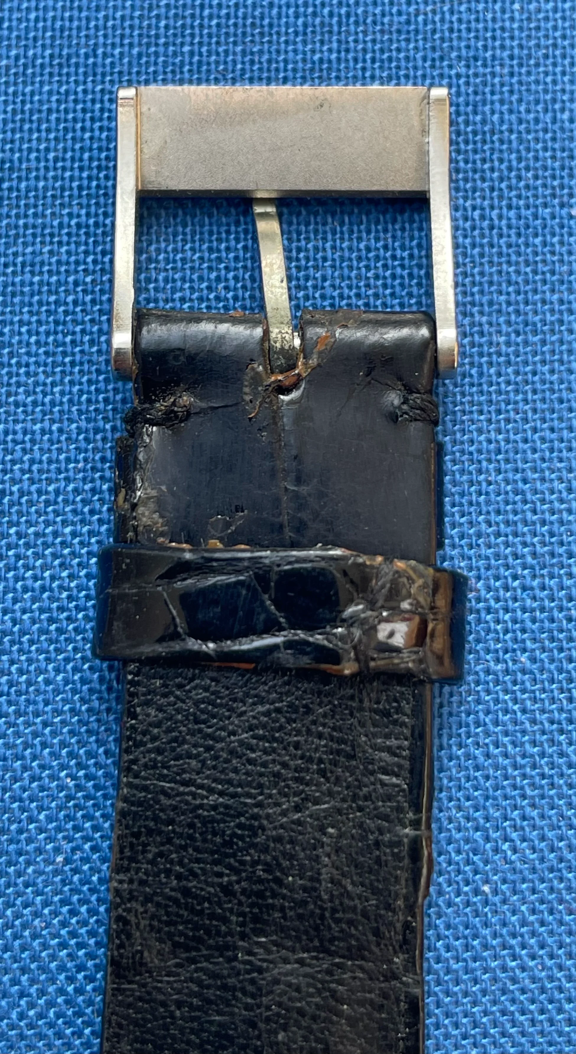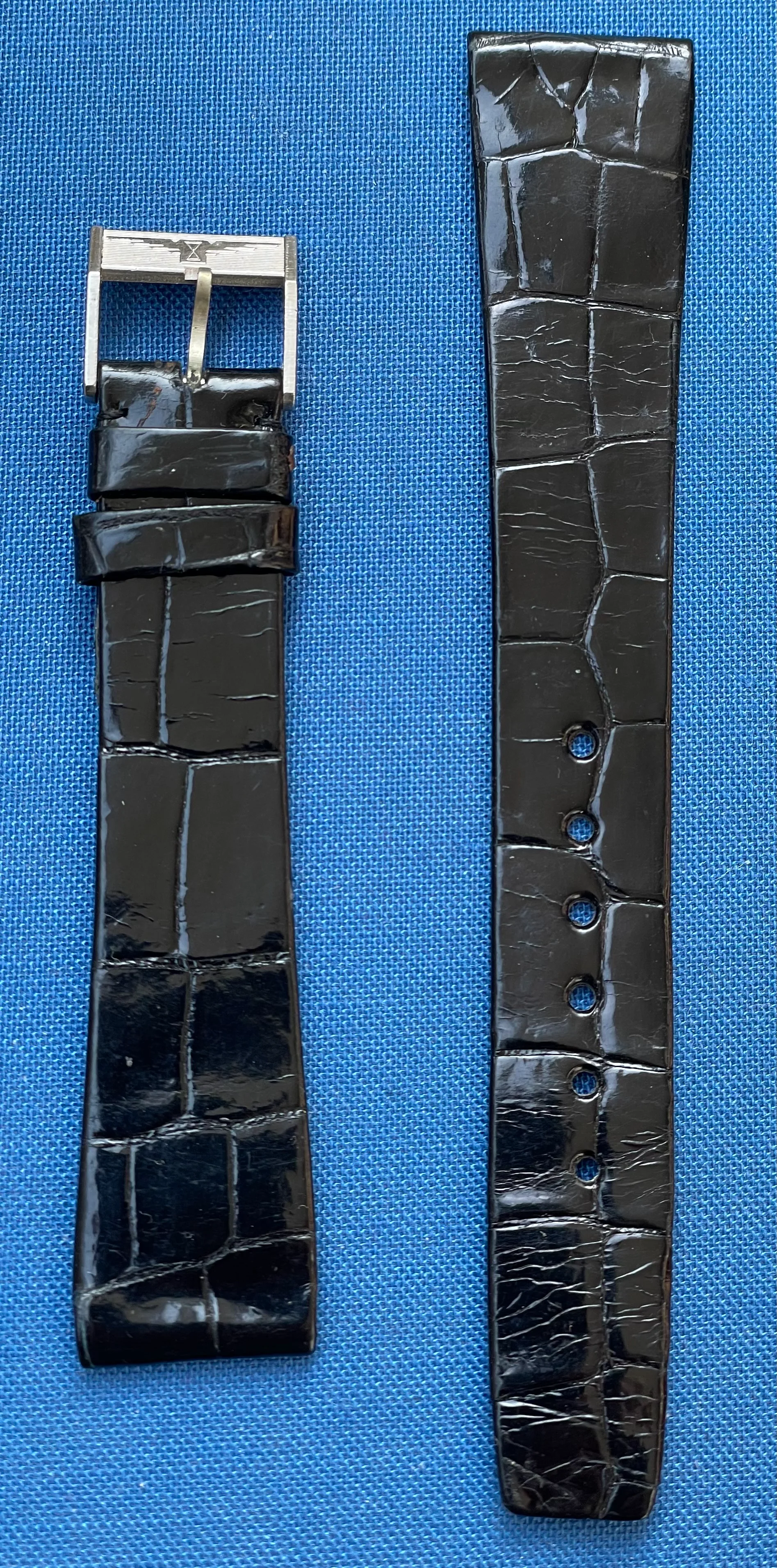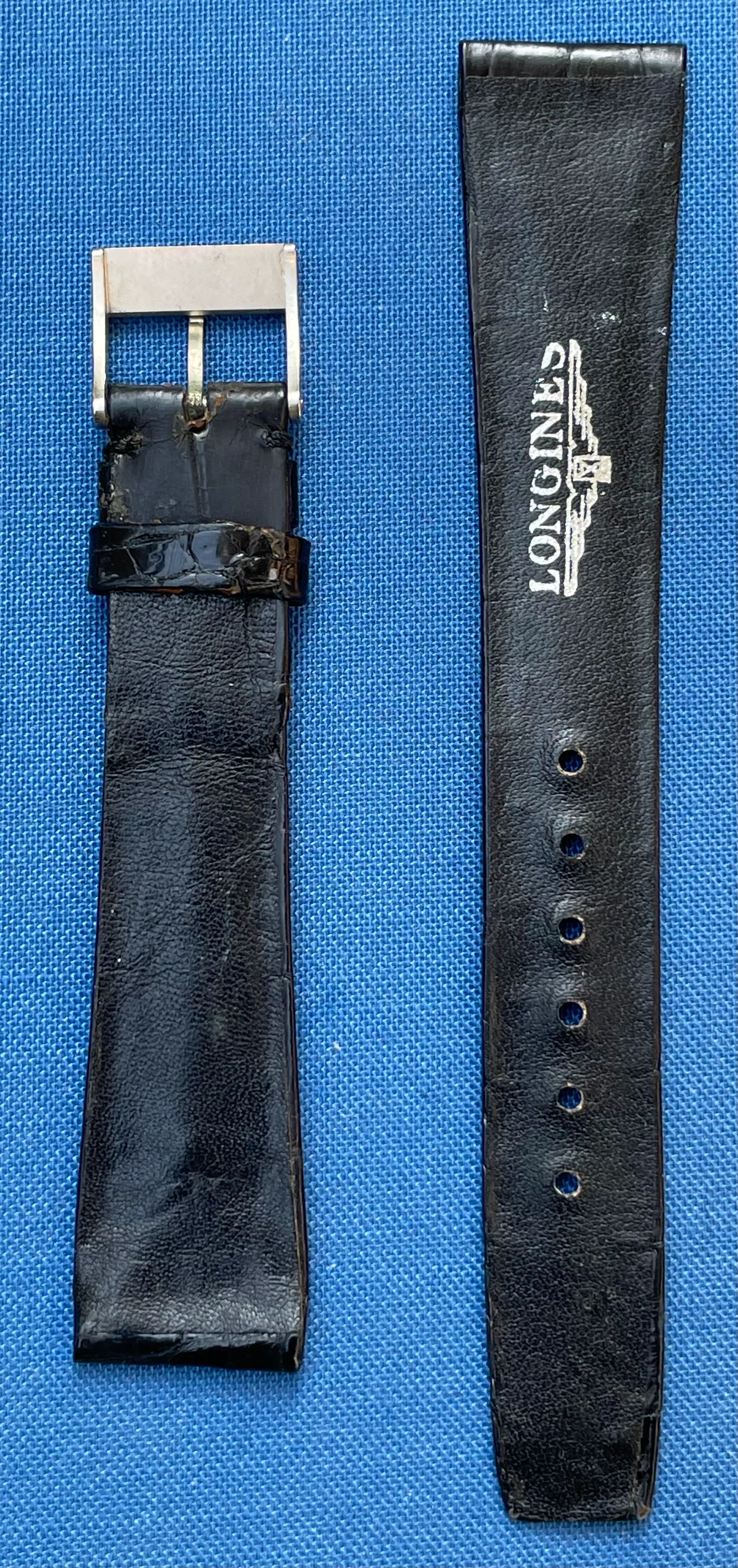 ·I am selling an unworn Longines crocodile strap with steel clasp from the late 1960s (It was fitted to a Ref. 8271 (Nonius), a Valjoux 72 chronograph). The longer part measures 11.5 cm, the shorter part (without clasp) 7.5 cm. Lug width 18.5 mm, at the buckle 14 mm. No signs of storage.