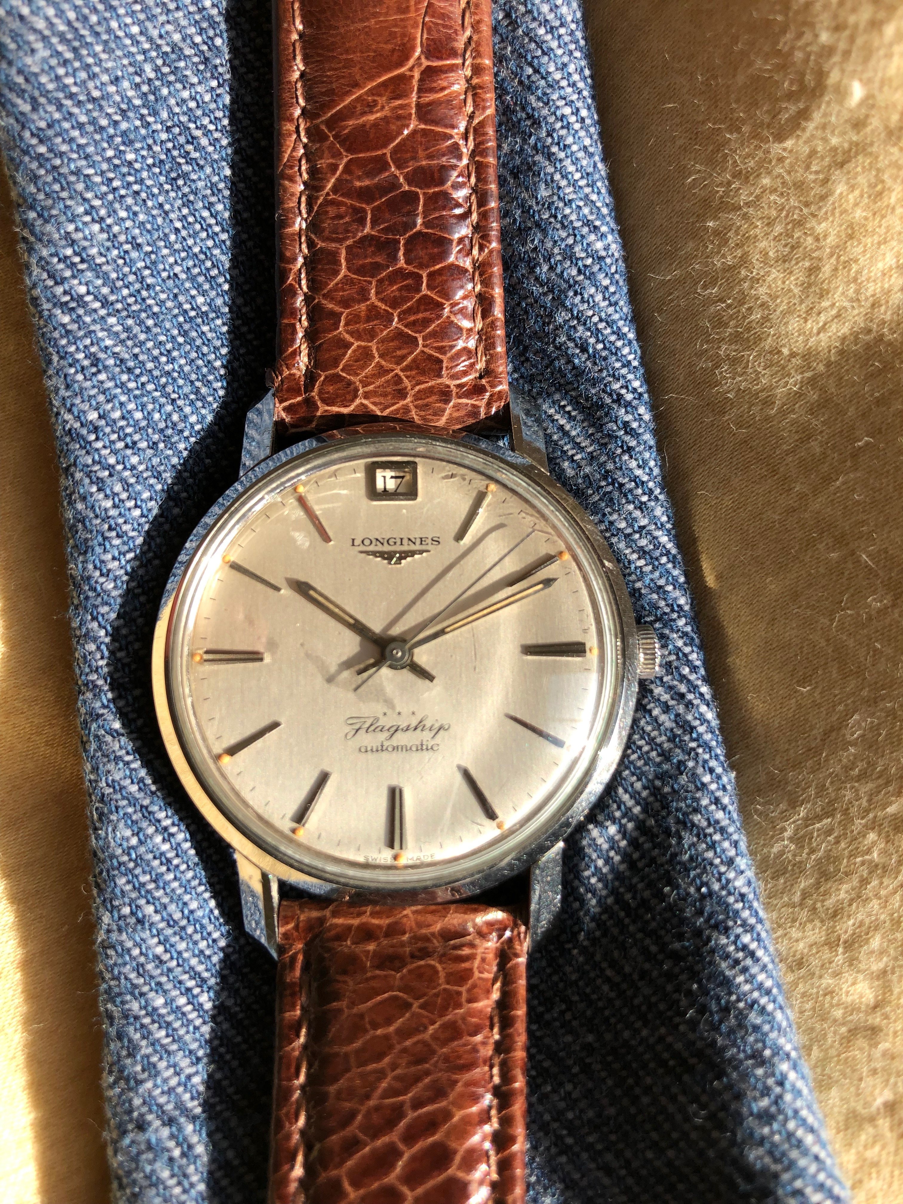 Stainless case, original crown and buckle on generic leather strap. The crystal does have a few scuffs that show up in some of the photos, but the dial itself is super clean. Case appears unpolished with crisp edges. Enamel on caseback largely intact. Caliber 341 movement, not sure when last serviced, but would recommend doing so prior to any extensive wearing. My weak photo skills and iPhone can't do justice to how nice this watch is, but I can try shooting different photos for prospective buyers as desired. I will cover shipping and paypal fees for CONUS. Shipping to Europe usually runs about $15 last time I shipped a watch.