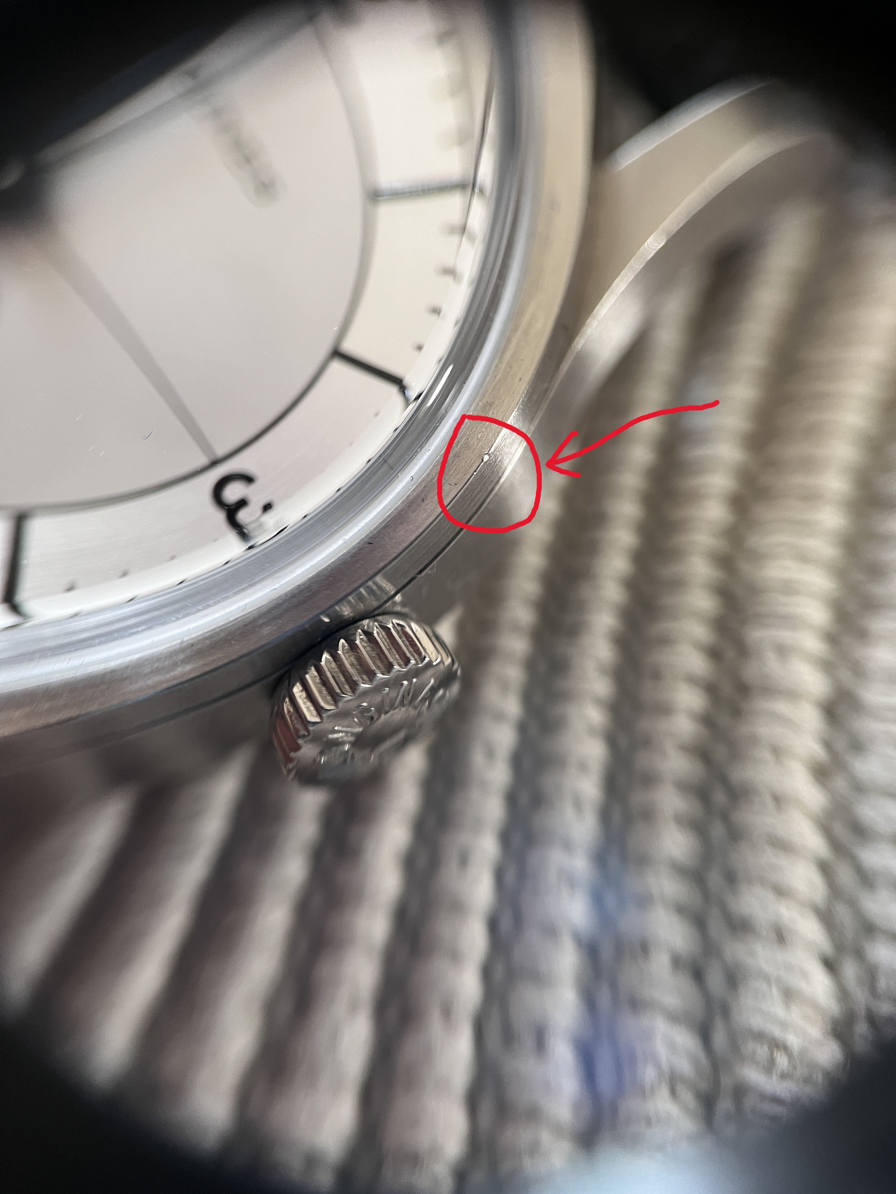 It comes with box and paper, with all original accessories, the only notable thing is a tiny ding on the case edge near 2 o'clock marker, please see attached photo taken through a loupe highlighting that ding. For reference, my wrist circumference is about 17cm/6.75 inch and this watch wearers beautifully!