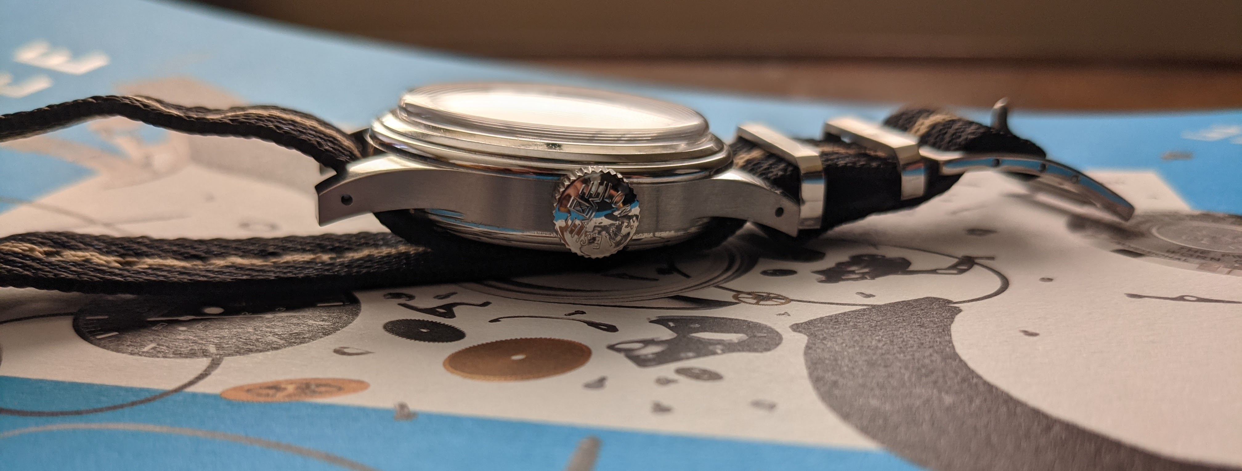 Dial: Beige with specs and blue steel hands with chocolate brown/black lume that replicates aged radium lume and Arabic numerals.