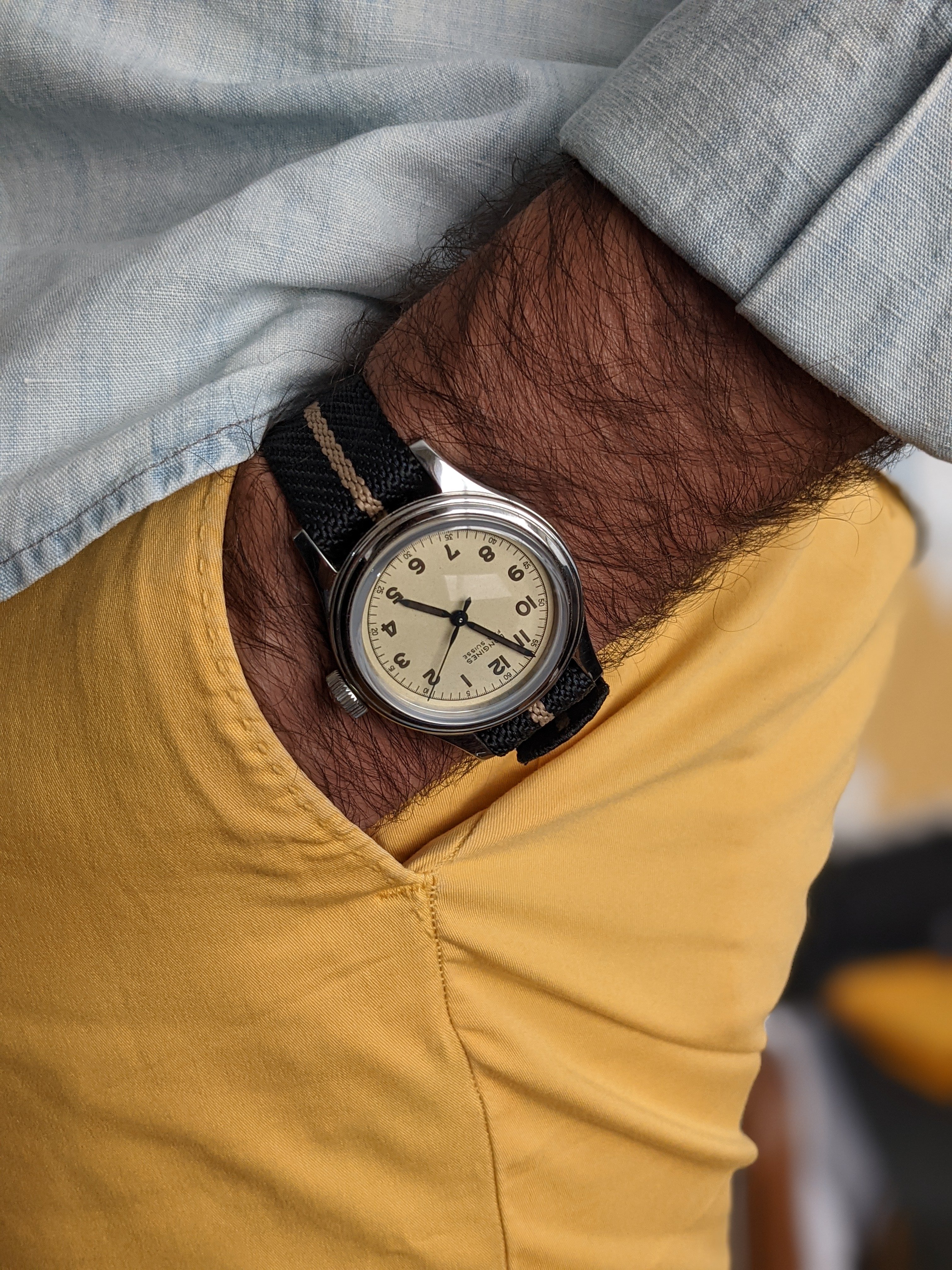 Case: Stainless steel 38.5mm in diameter/12.3 mm thickness/19mm lug width. Scratch-resistant sapphire crystal, with several layers of anti-reflective coating on the underside. 3 bar water resistance. Does not have any signs of wear or marks underneath the lugs. Unlike some Longines with long lug to lug measurement, this example wears quite well and isn't as long as the legend diver for example.