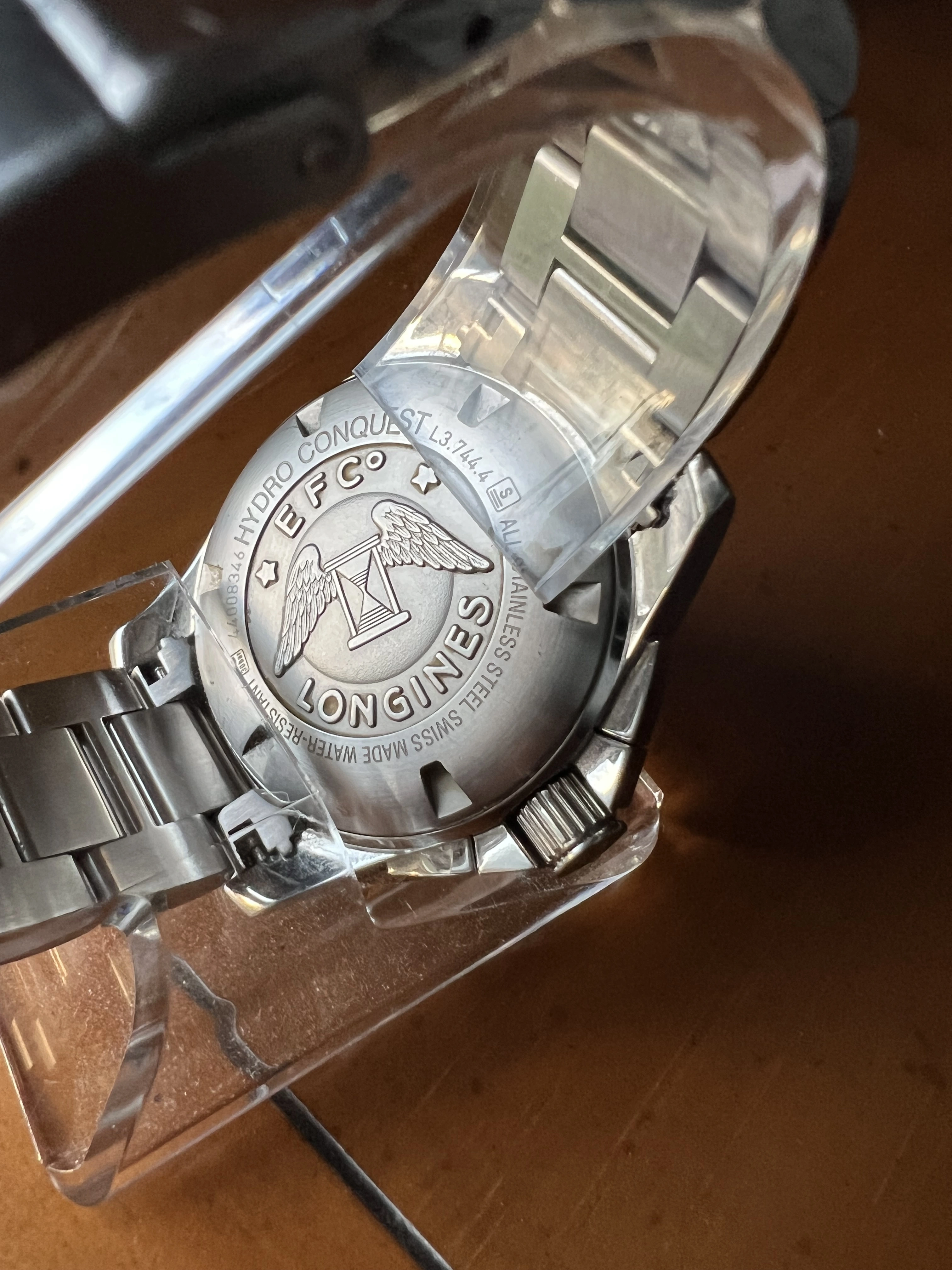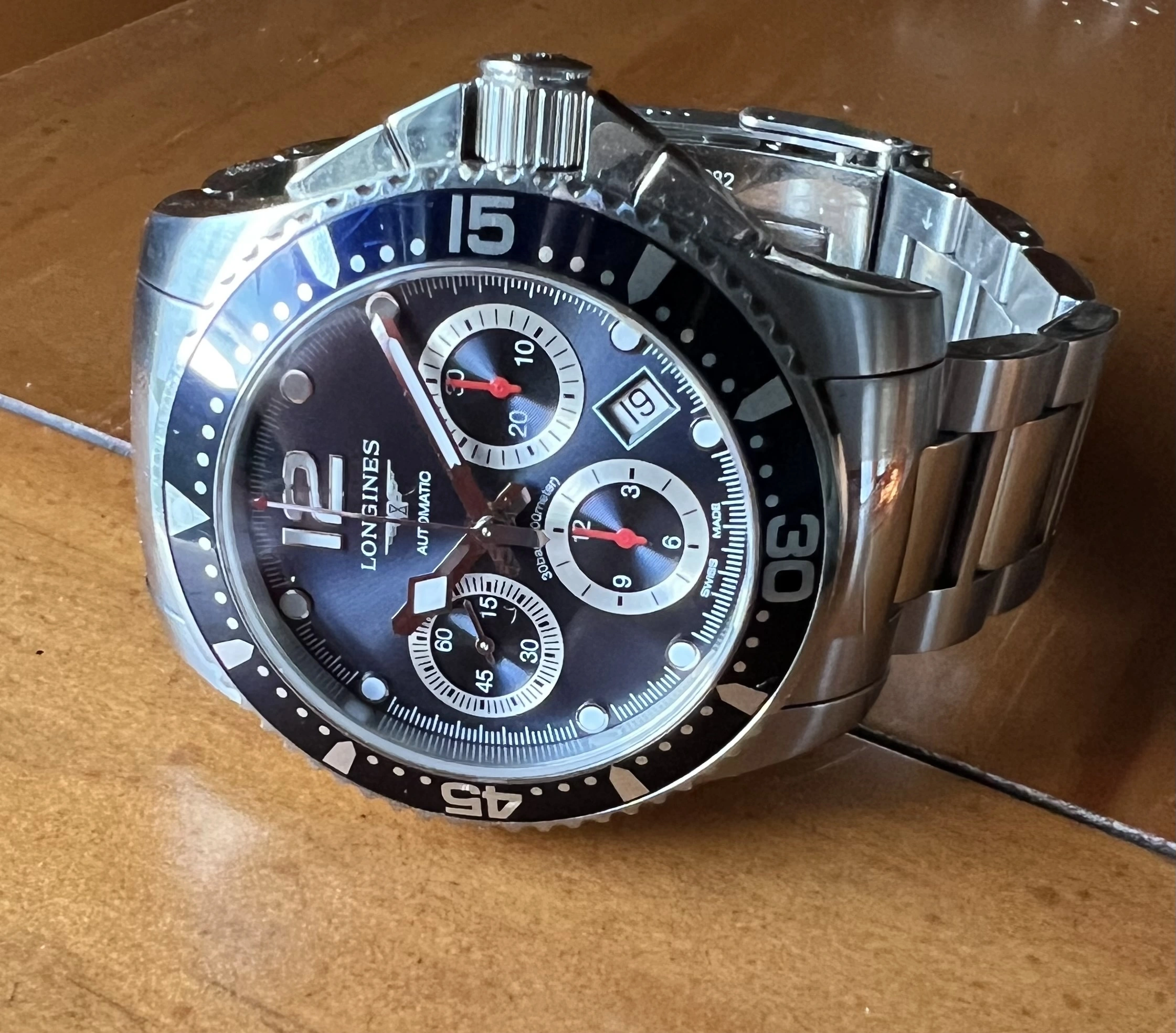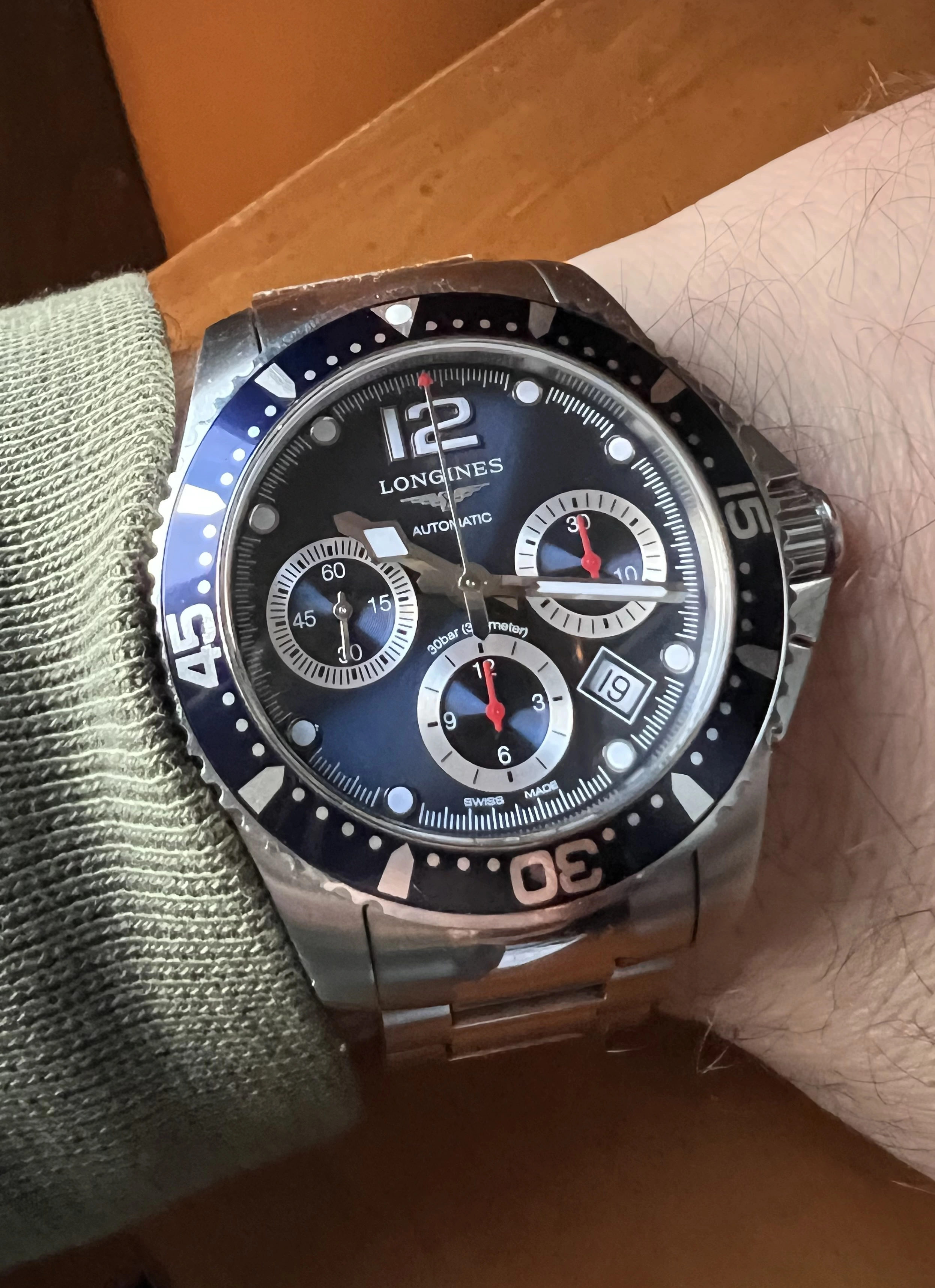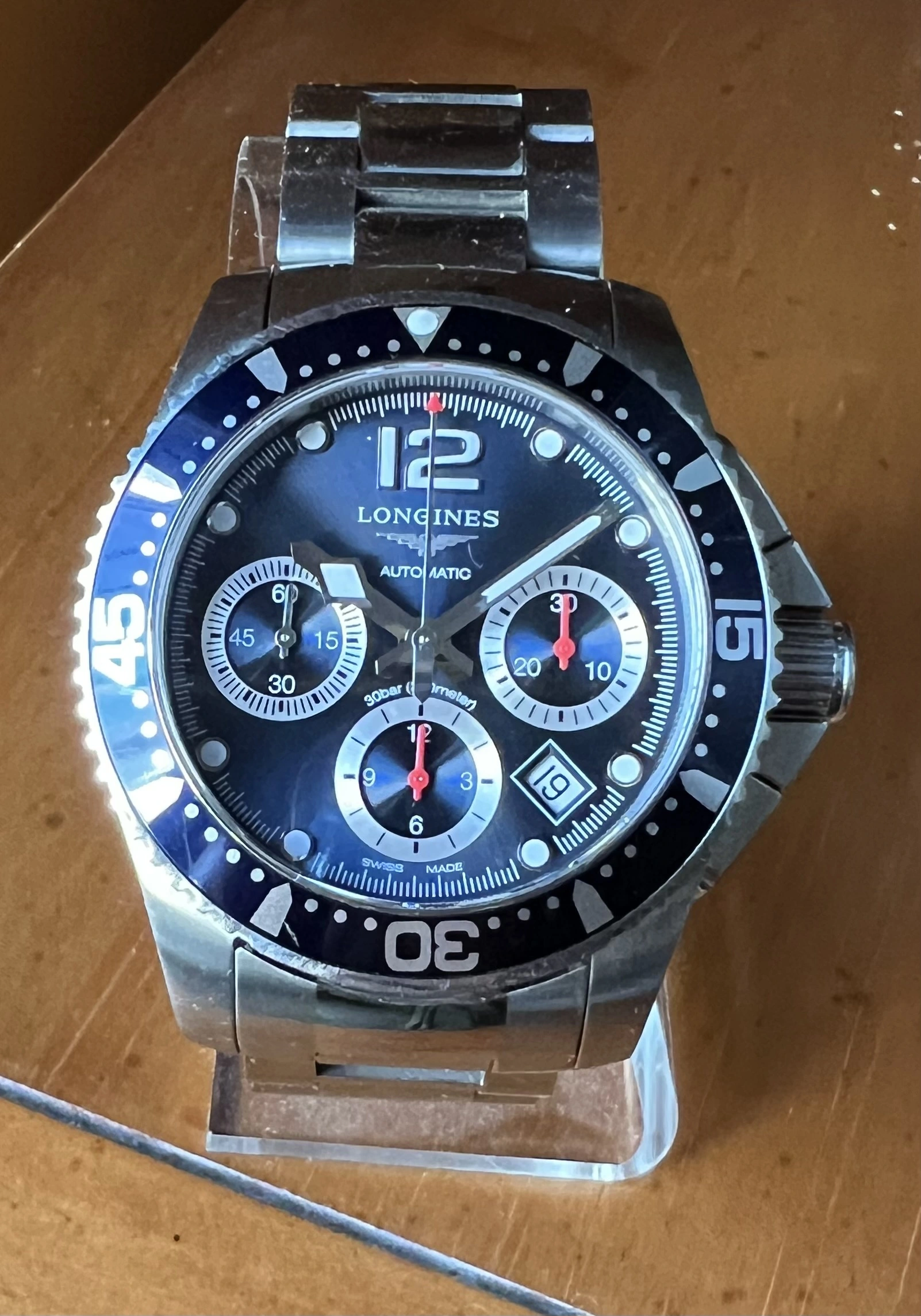 ·Up for sale is a beautiful and rugged Longines Hydroconquest chronograph. The watch commands great wrist presence with a striking sunburst blue dial and bezel coupled with a robust 43mm steel case and bracelet. Minor scratches, scuffs, and a ding or two as shown in the photos. Bracelet + head measure slightly over 8 inches in length with clasp closed and excluding the diver’s extension. All functions run flawlessly. $1000 net which includes USPS shipping in the US. International buyers to discuss shipping.