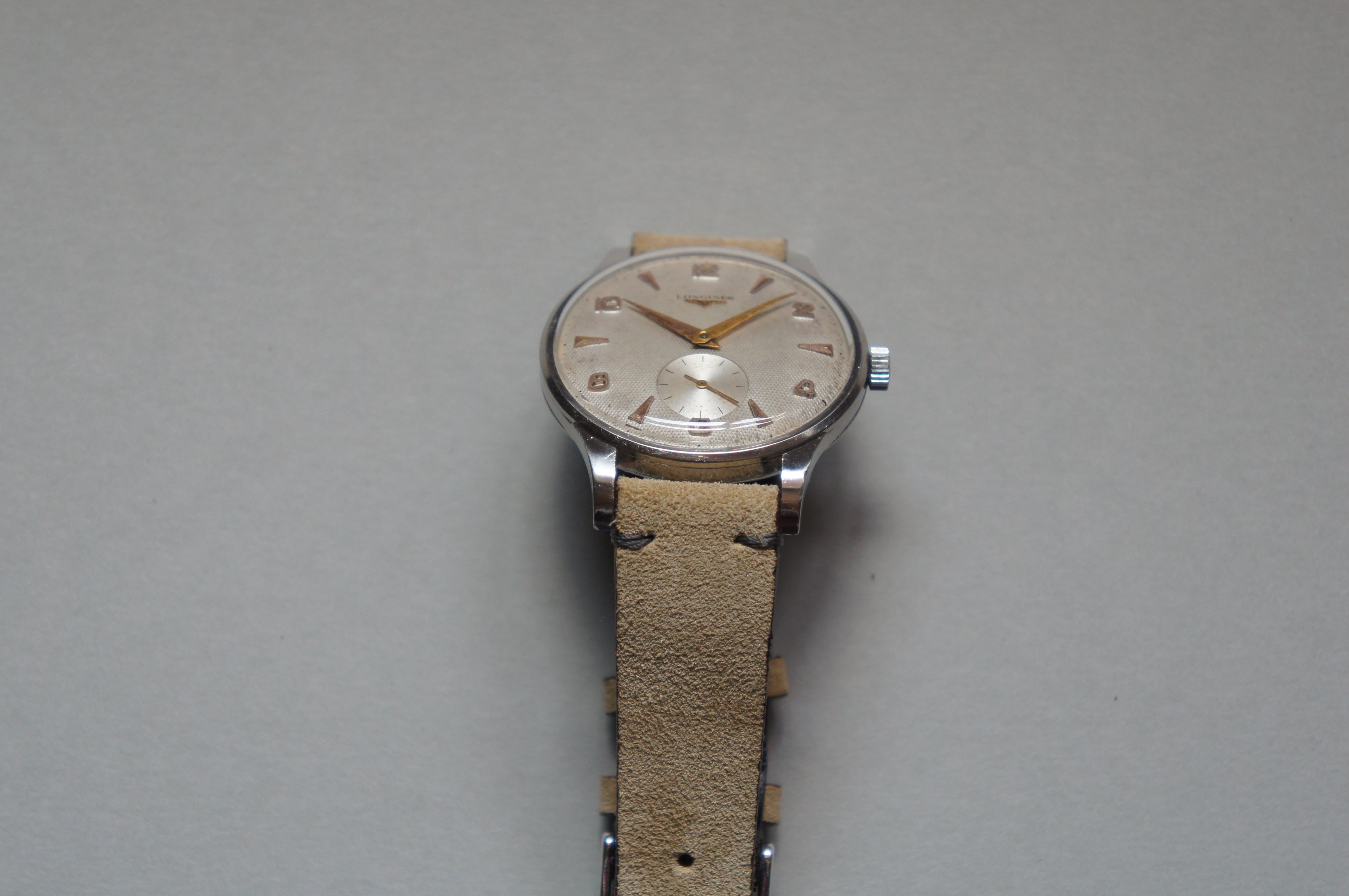 I am selling this nice and rare handwound Longines. It has a very nice hobnail dial with evenly distributed patina, applied gold indexes and matching gold hands.
