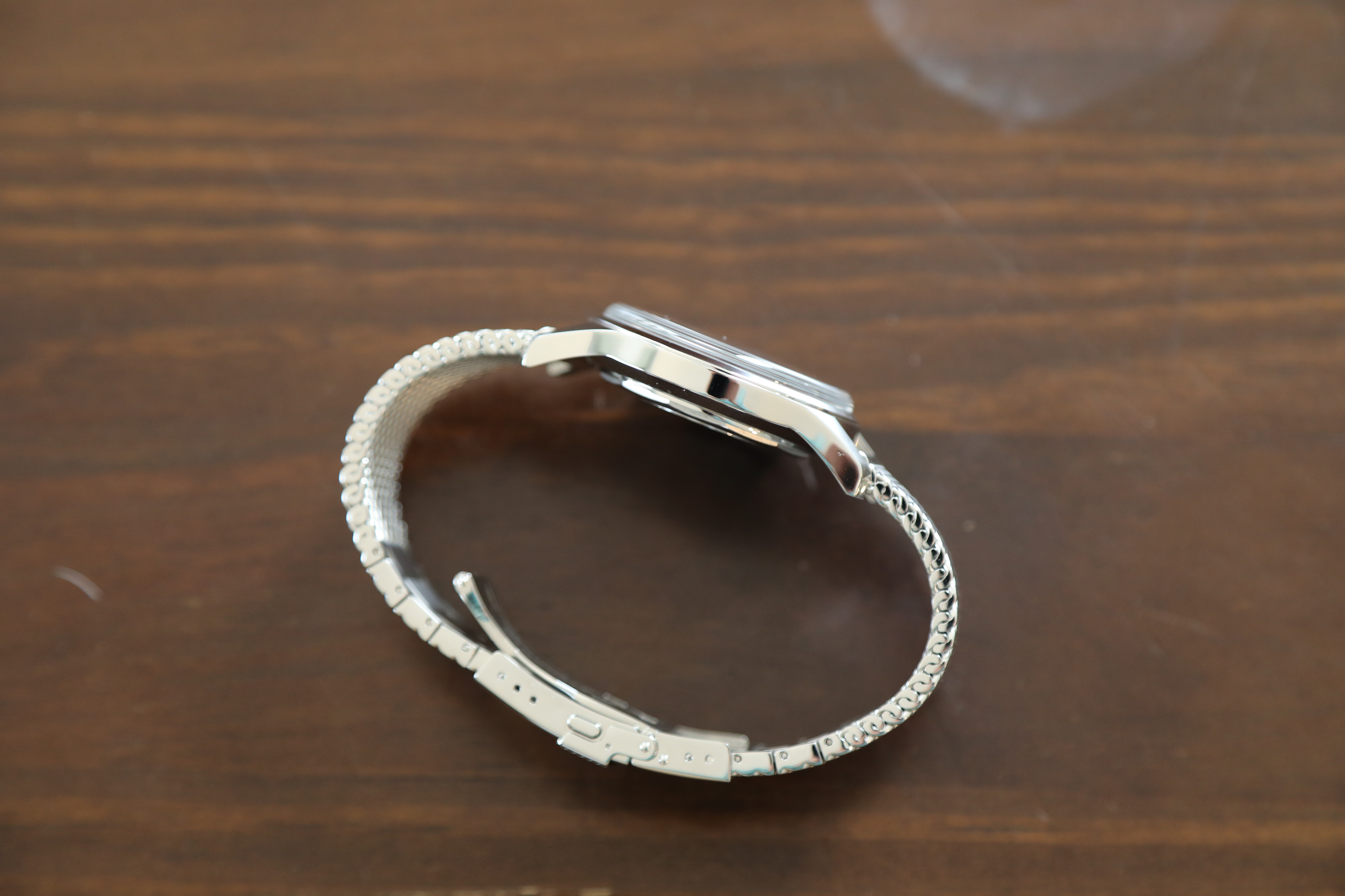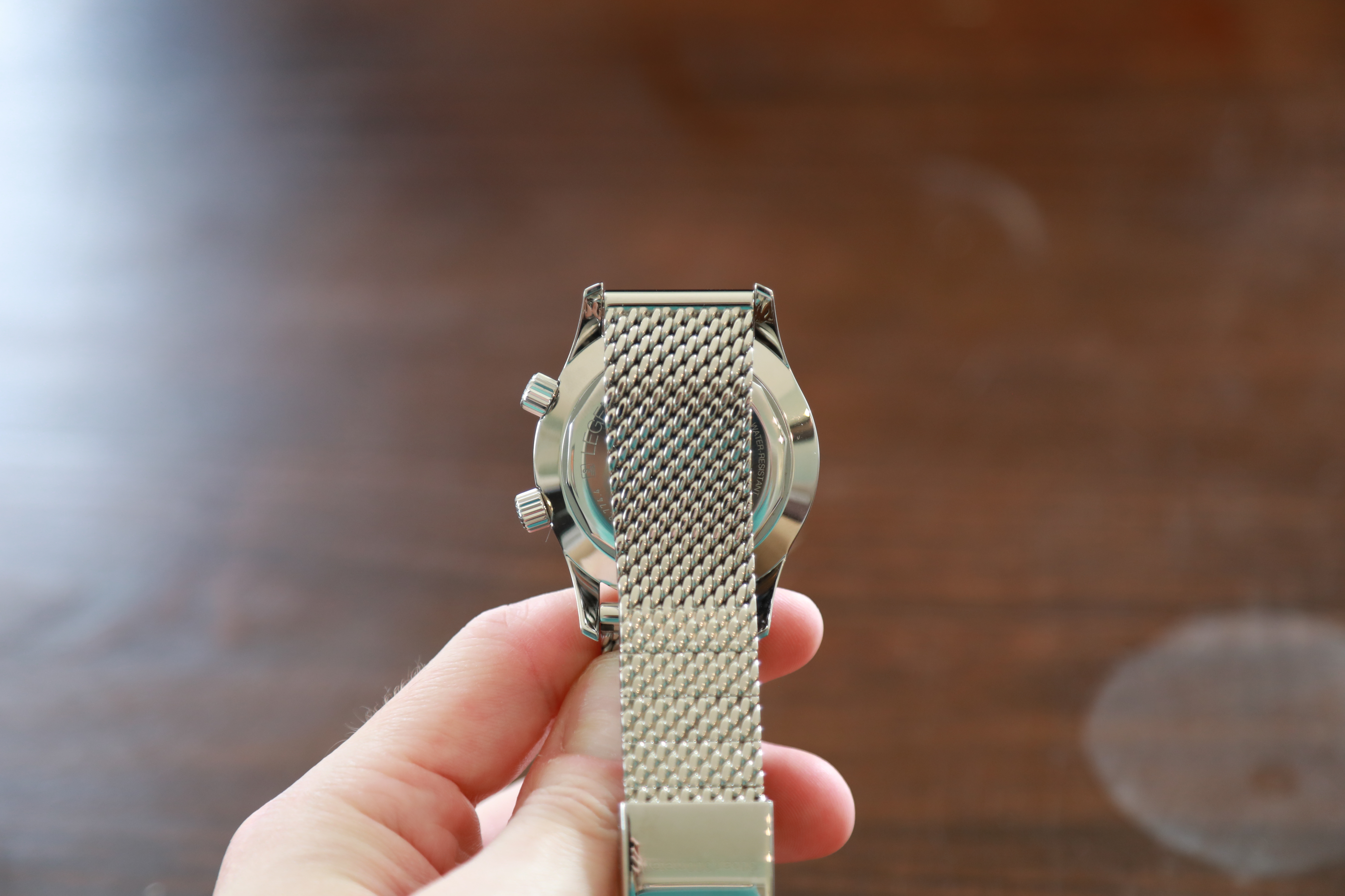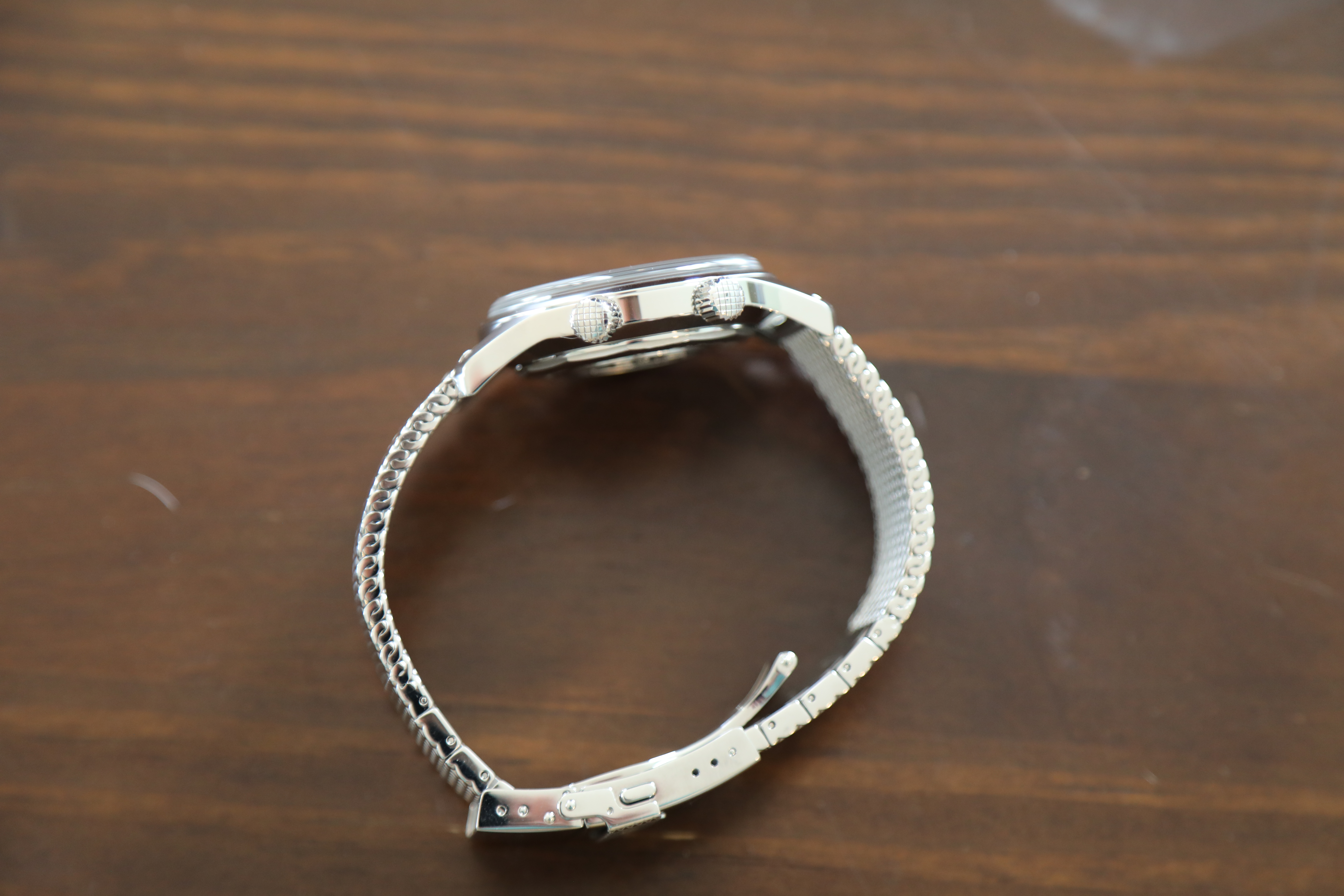 I purchased this watch a couple of months ago from the original owner in BNIB condition. Since I purchased it, I have worn it approximately 15-20 times on an aftermarket strap. The watch’s case and crystal are in phenomenal condition. The only signs of wear on the case are very faint strap change marks beneath the lugs. The mesh bracelet is in new condition as it has never been worn.