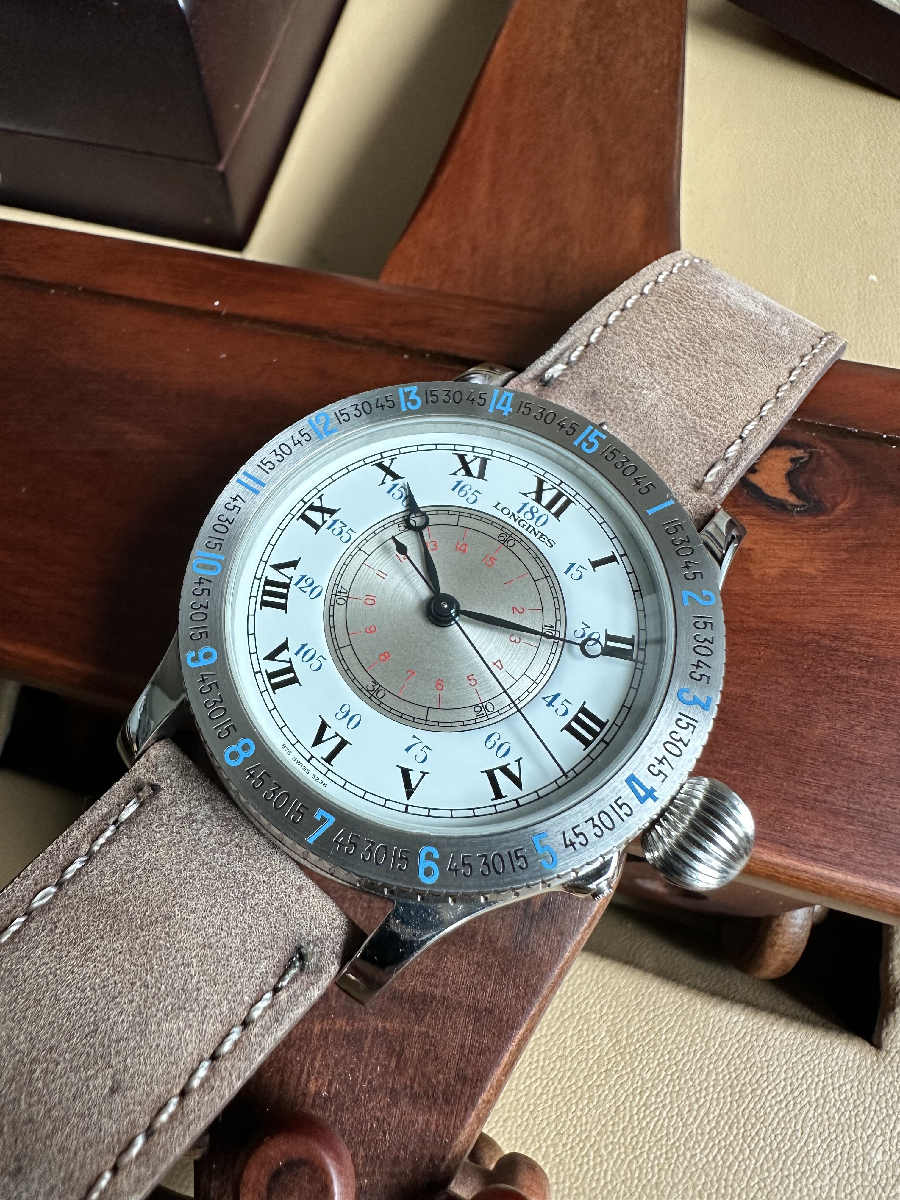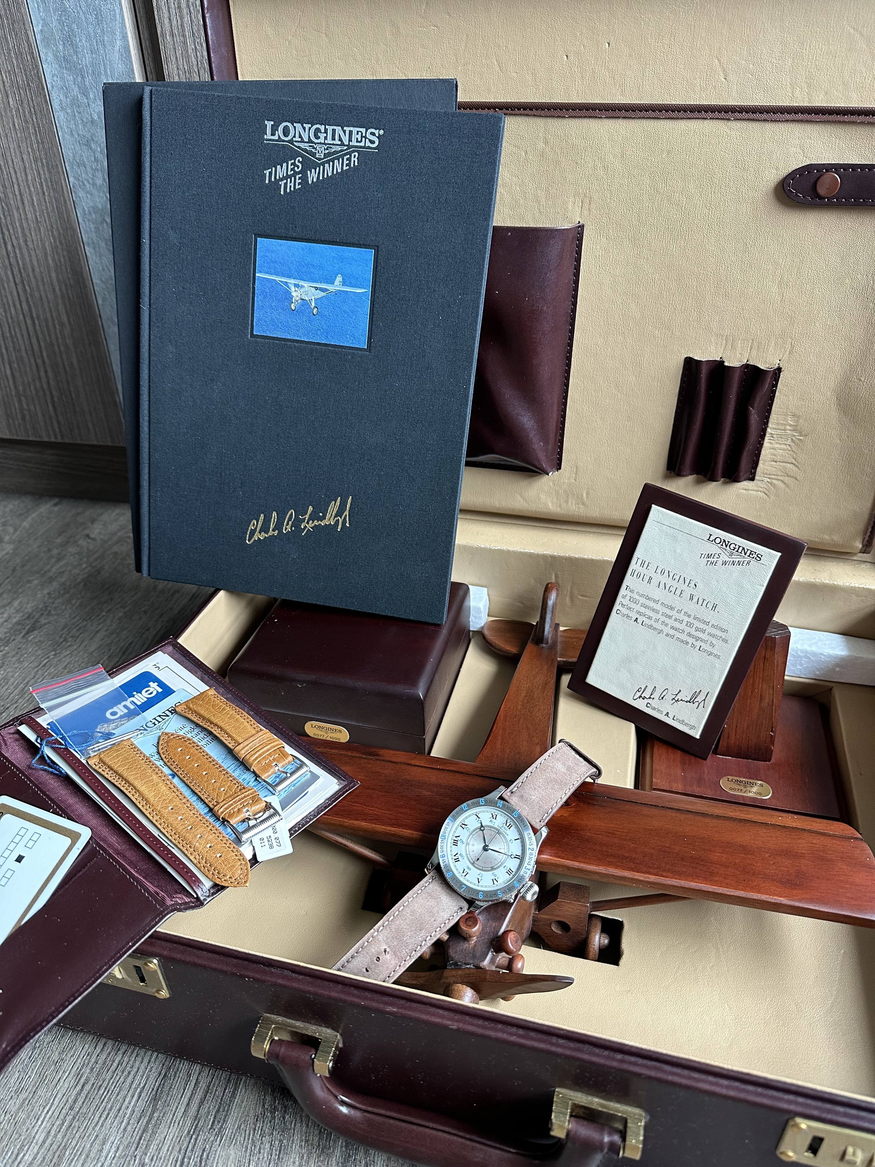 Probably one of the most impressive presentation for a watch, this is the first Limited Edition Lindbergh reissue made by Longines with a true vintage pocket watch caliber, L 878.4. This set is super impressive, comes with everything untouched, from unworn straps, strap extender with hang tags, all hang tags like new, warranty for the leather briefcase made by Amiet (reputable Swiss manufacturer for briefcase in the past), leather briefcase with customised layout for this watch, no. 77 wooden box, no. 77 replica wooden display plane that Lindbergh flew in, a plaque, and a numbered 77 book! Of cos the massive 47mm original sized numbered 77 Lindbergh watch. Everything is as complete as it is when new, watch is so mint that it can pass as NOS.
