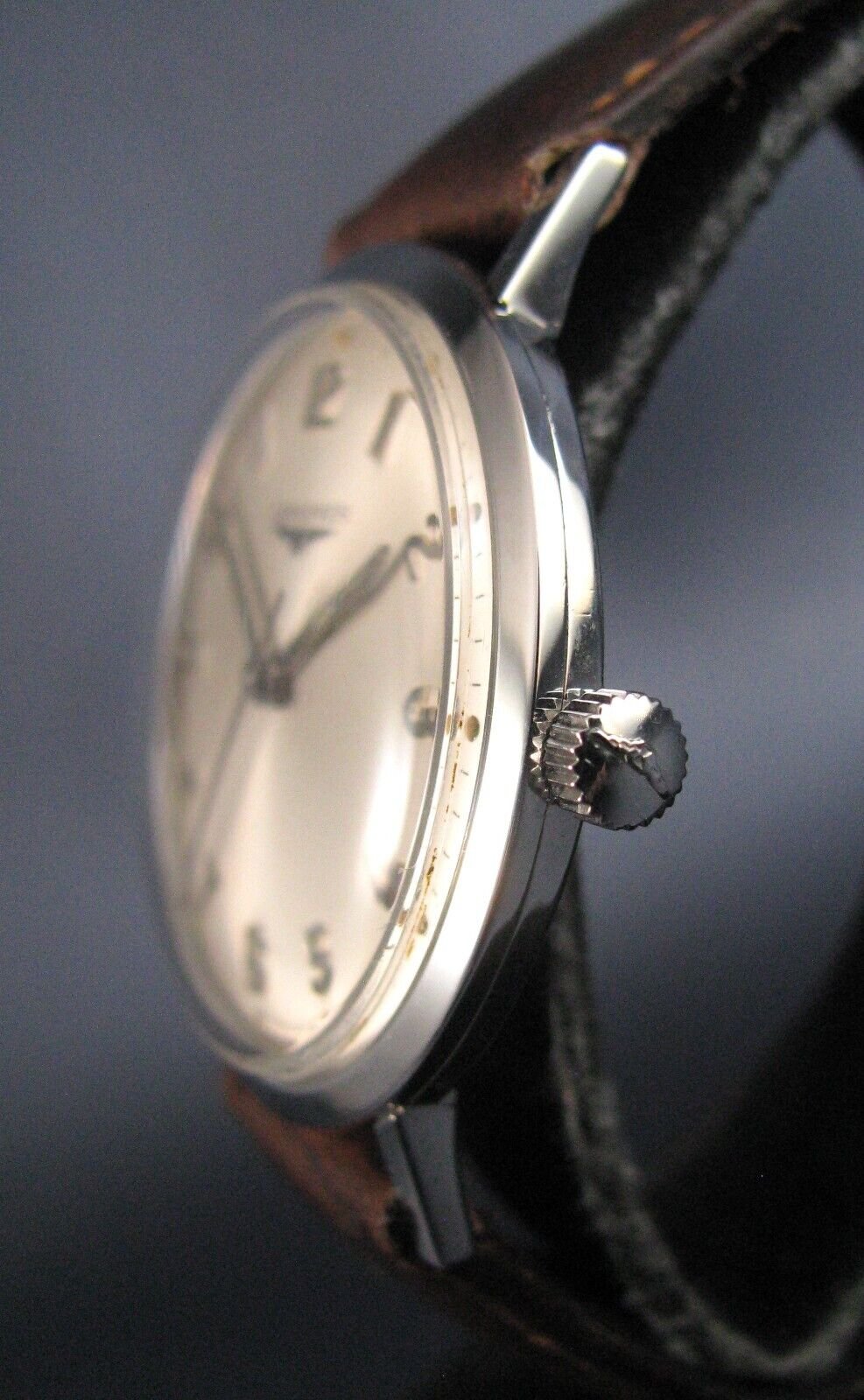 "This has a one piece case and a split stem. None of these three pieces is bent or damaged. The crystal is correct for this watch. Also, this watch opens through the crystal using an Allproof 1200 wrench which requires a shouldered crystal as this has...a domed crystal with no should would not work."