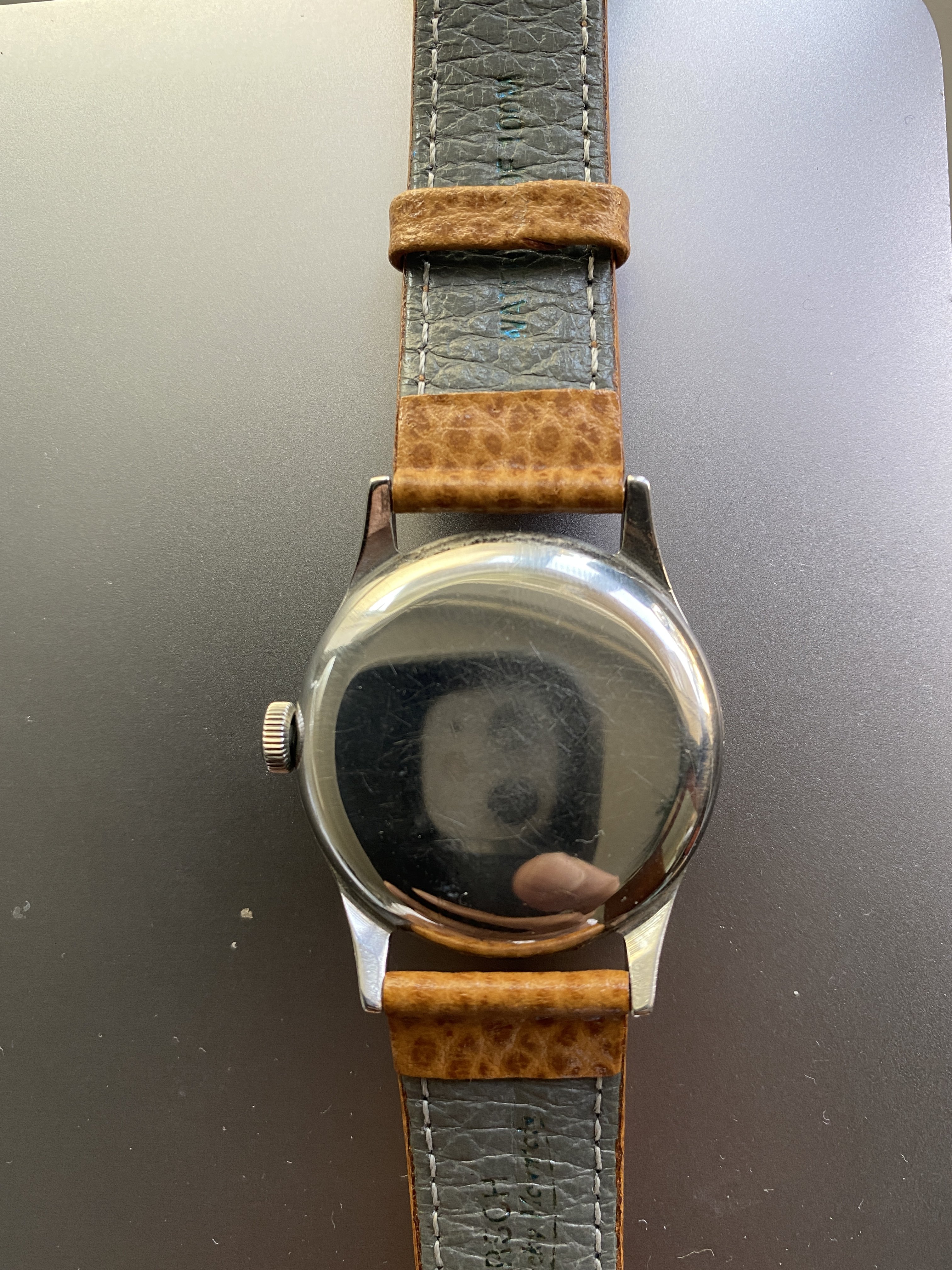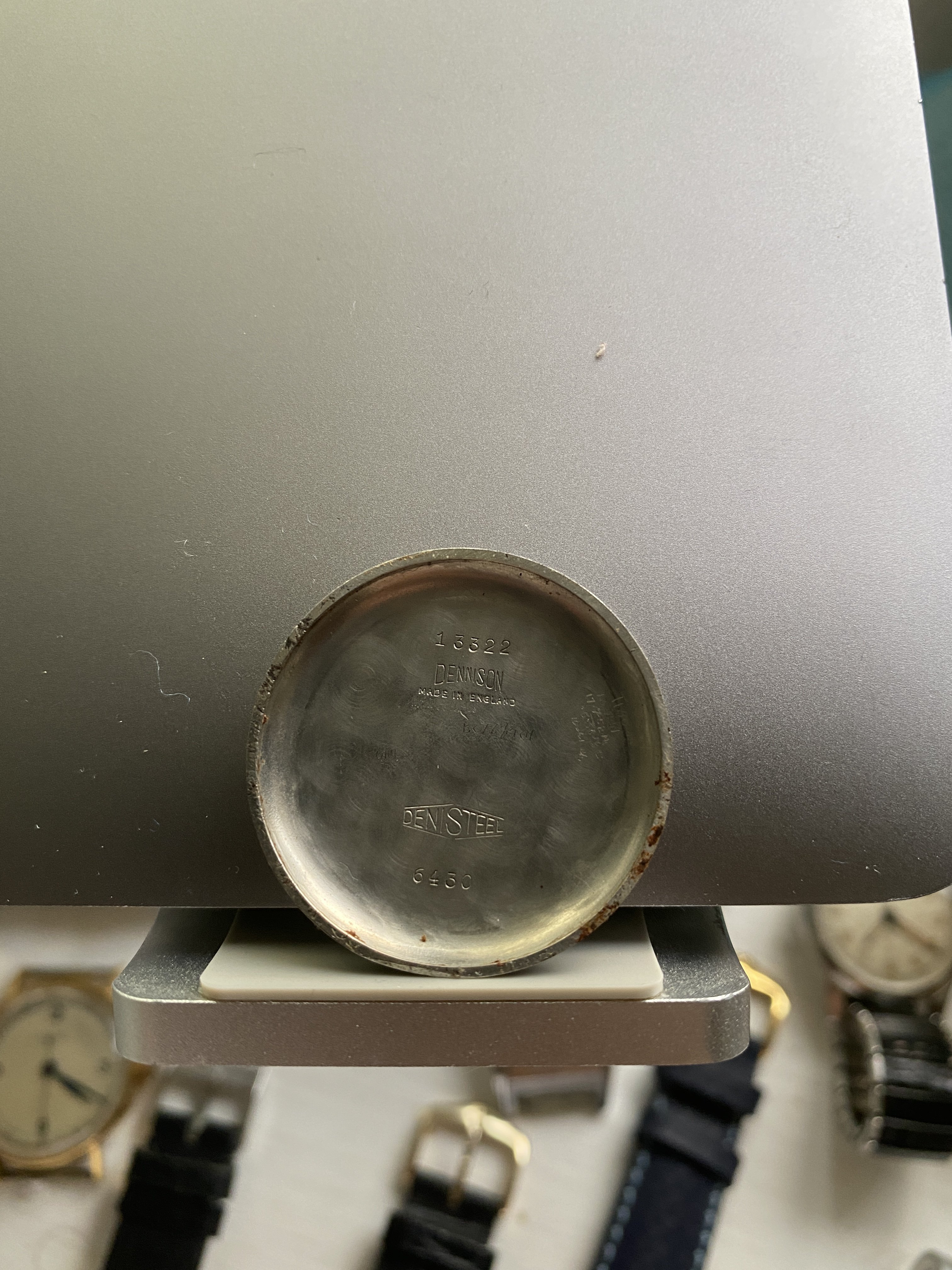 Case: The case is 33.5mm across without crown. It is steel and in good condition. The case says Denison - Made in England.