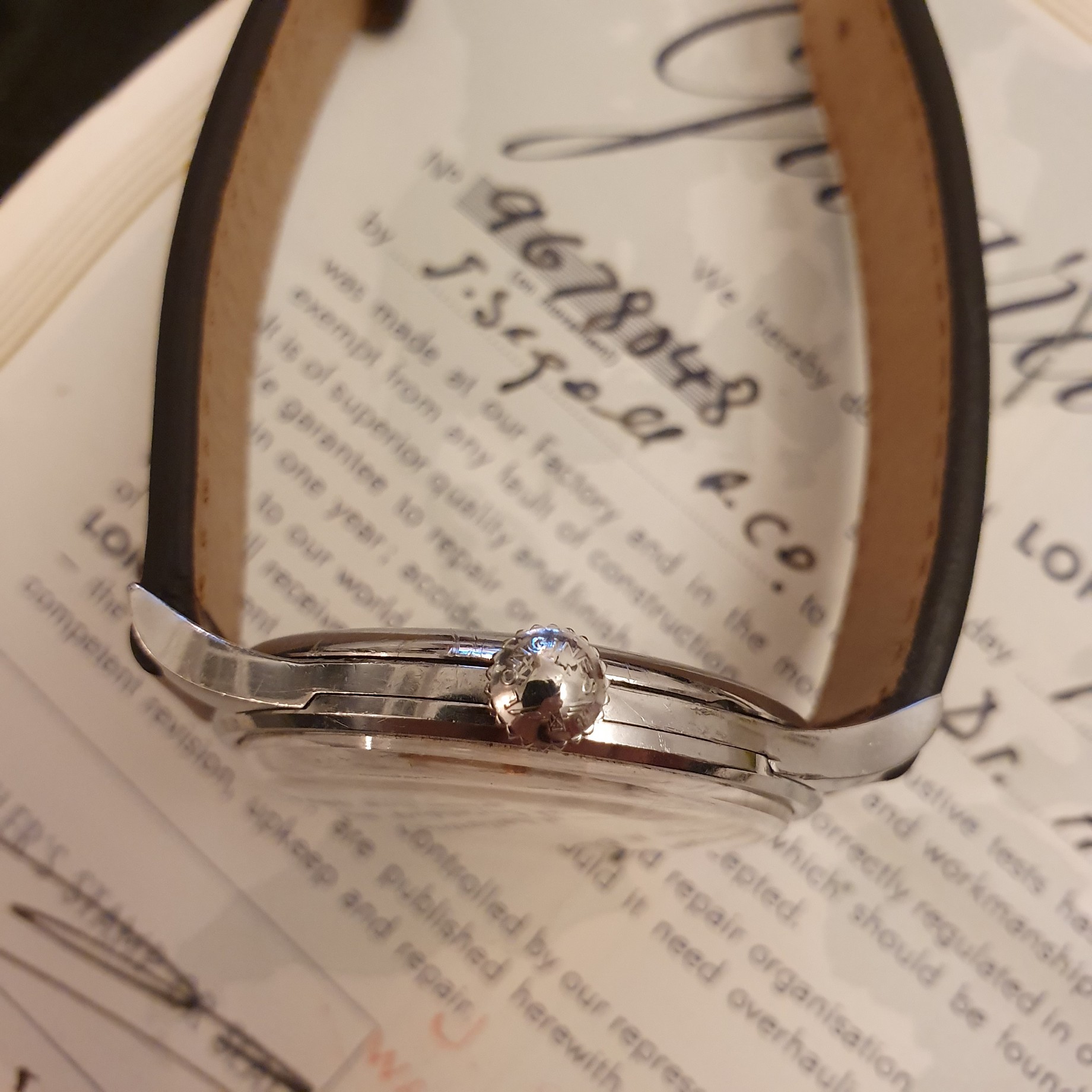 What makes this Longines so special is the fact that it comes in unmolested condition with original dial, guarantee card and original buckle. It was originally sold in 1958 in the city of Bulawayo. Bulawayo is the second biggest city of Zimbabwe, but at that time the country was still a British colony known as Rhodesia. The original owner was Mr. "Dr. A. Kennedy". Well, somehow it found it's way into my collection and now I am selling to make some room for new pieces.
