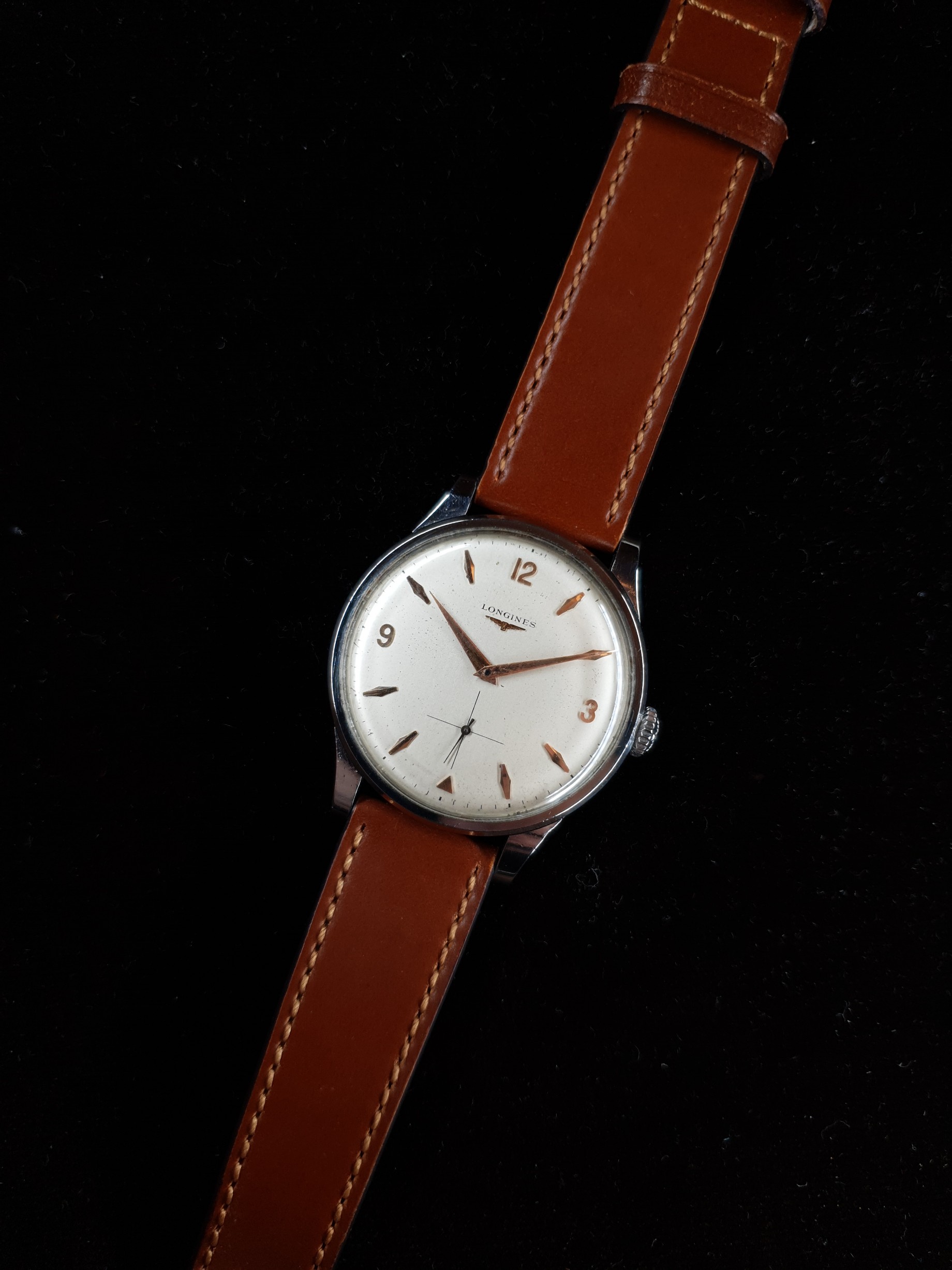 Clean Longines in-house manual caliber ref. 12.68z. The watch winds and sets very smooth and the movement is running strong, but I have no information about it's service history.