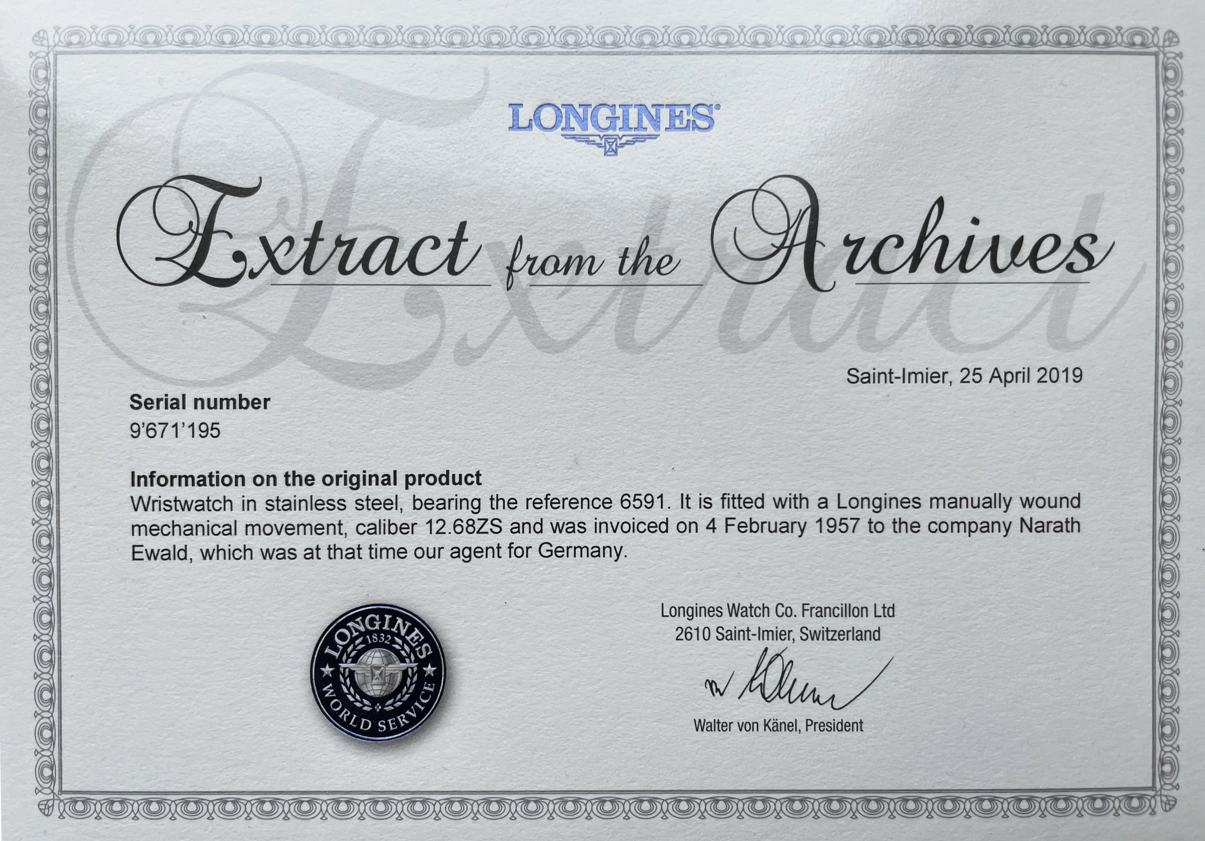 ·I'd like to sell my Longines Ref 6591 (movement 9671195, approx. 1957). It looks like the watch mainly has storage marks, as if it had hardly been worn. It hasn't been polished, at least I don't see any of the typical signs of this. An original Longines clasp and a pair of very old spring bars are also included. Both were already with the watch when I bought it. To me, it almost looked as if it had just come from the store. The only thing about the watch that doesn't look perfect is the dial, on which, with a little luck and depending on the angle of the light, you can see a fingerprint.