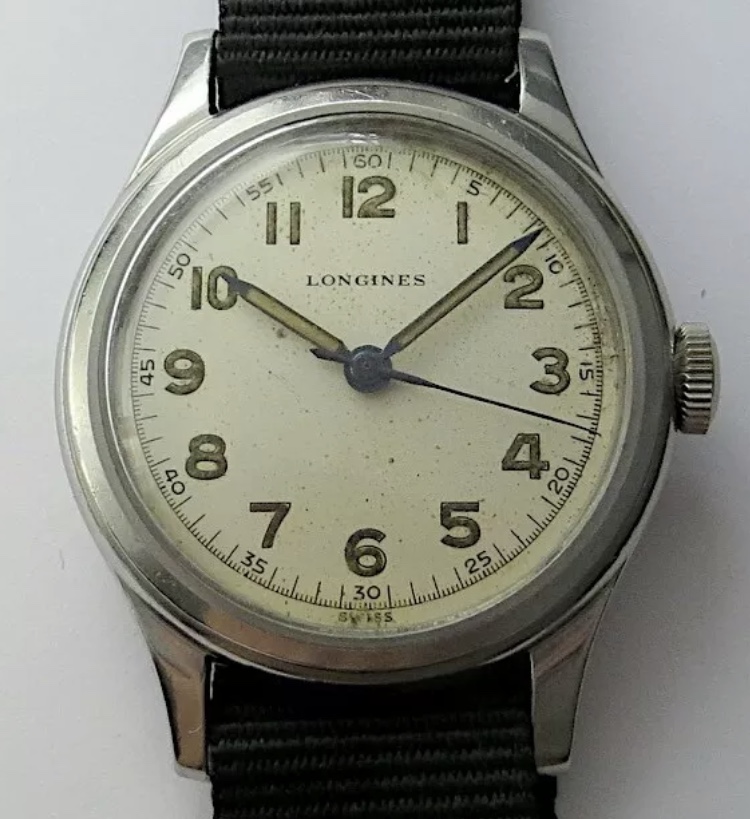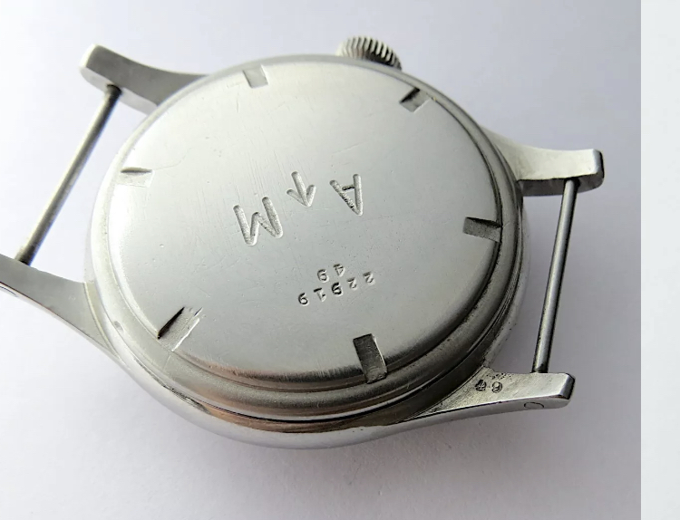 This particular example dating from 1945 contains both the "AM" and broad arrow markings. Also this sei tacche watch has unusual fixed bars and is a larger 35mm in diameter. In addition, I cannot find any case reference 22919 in my research.