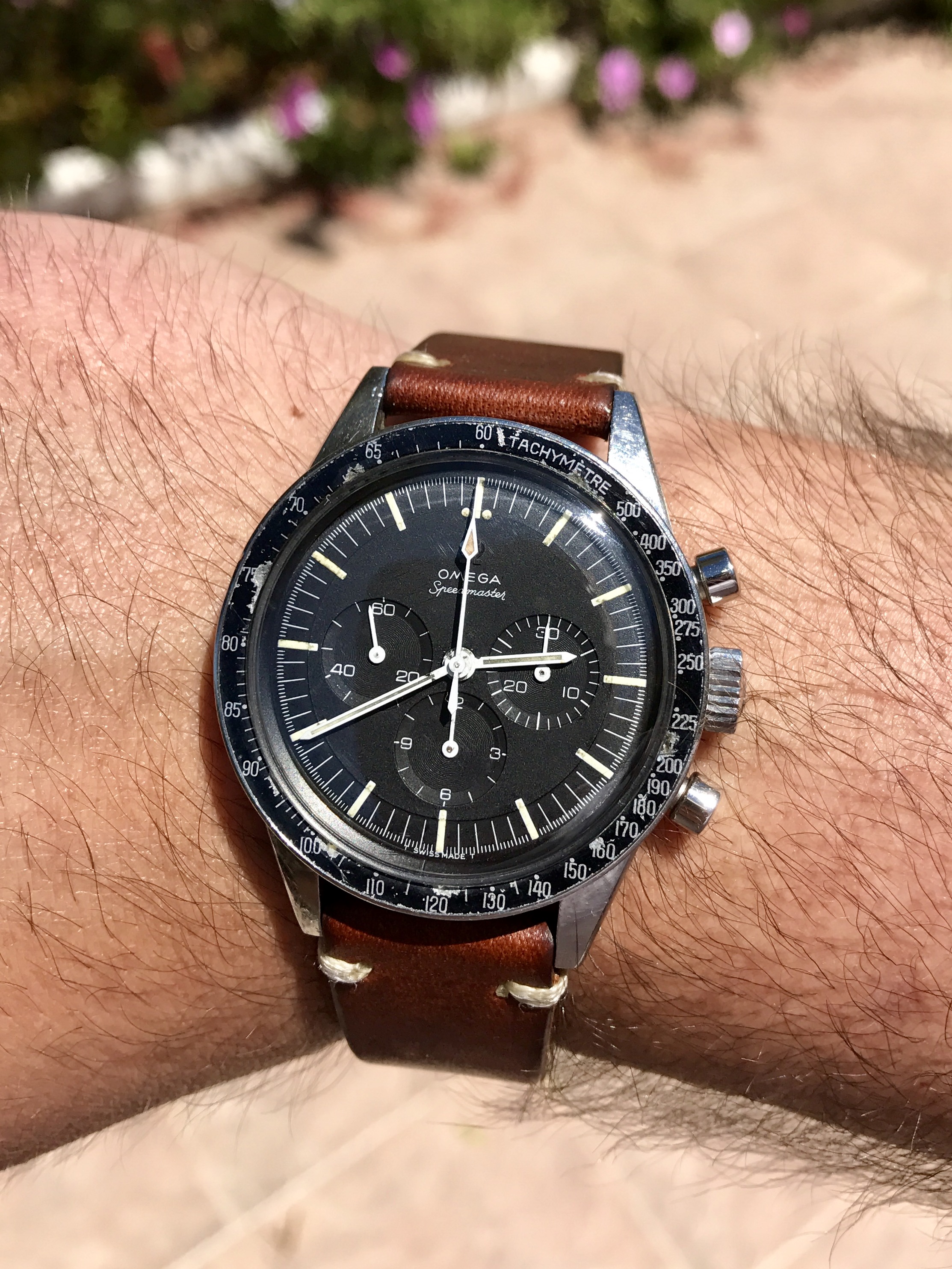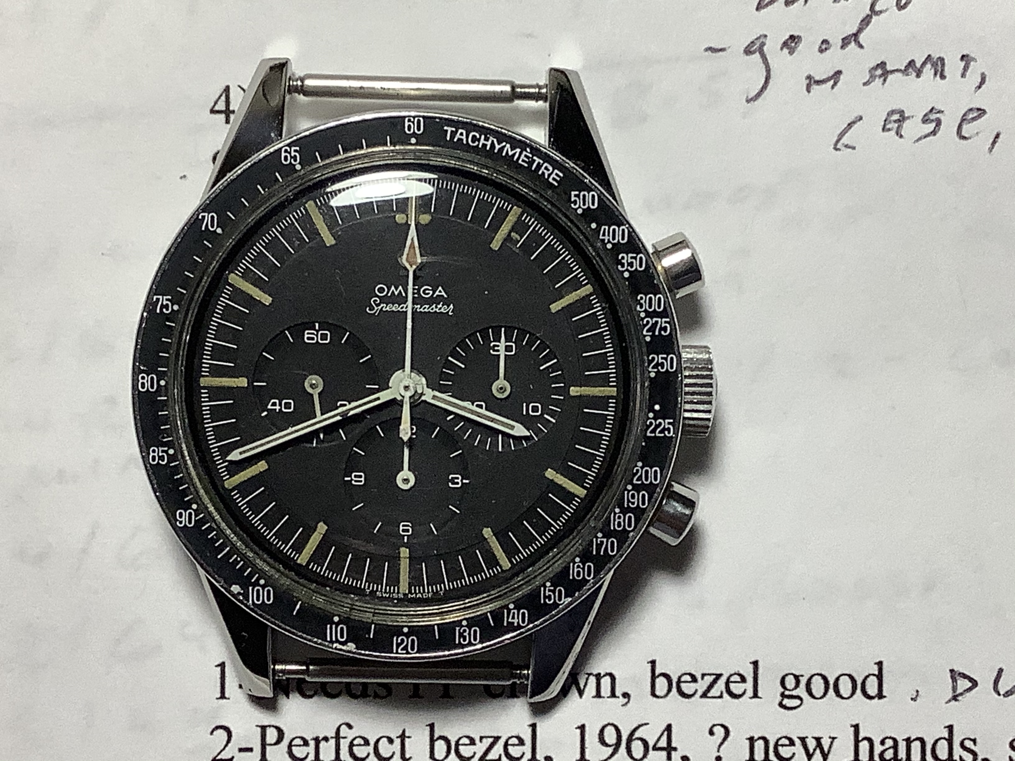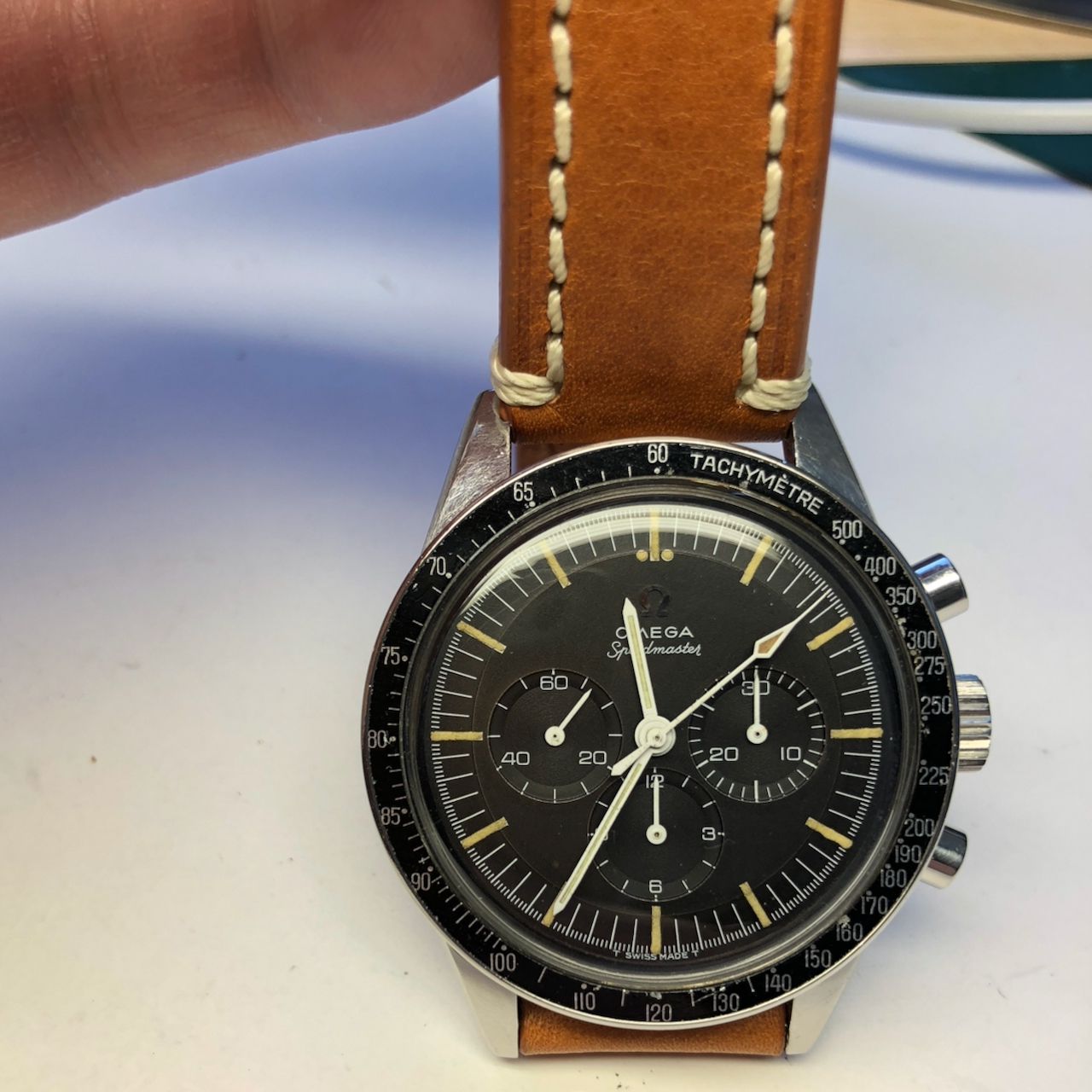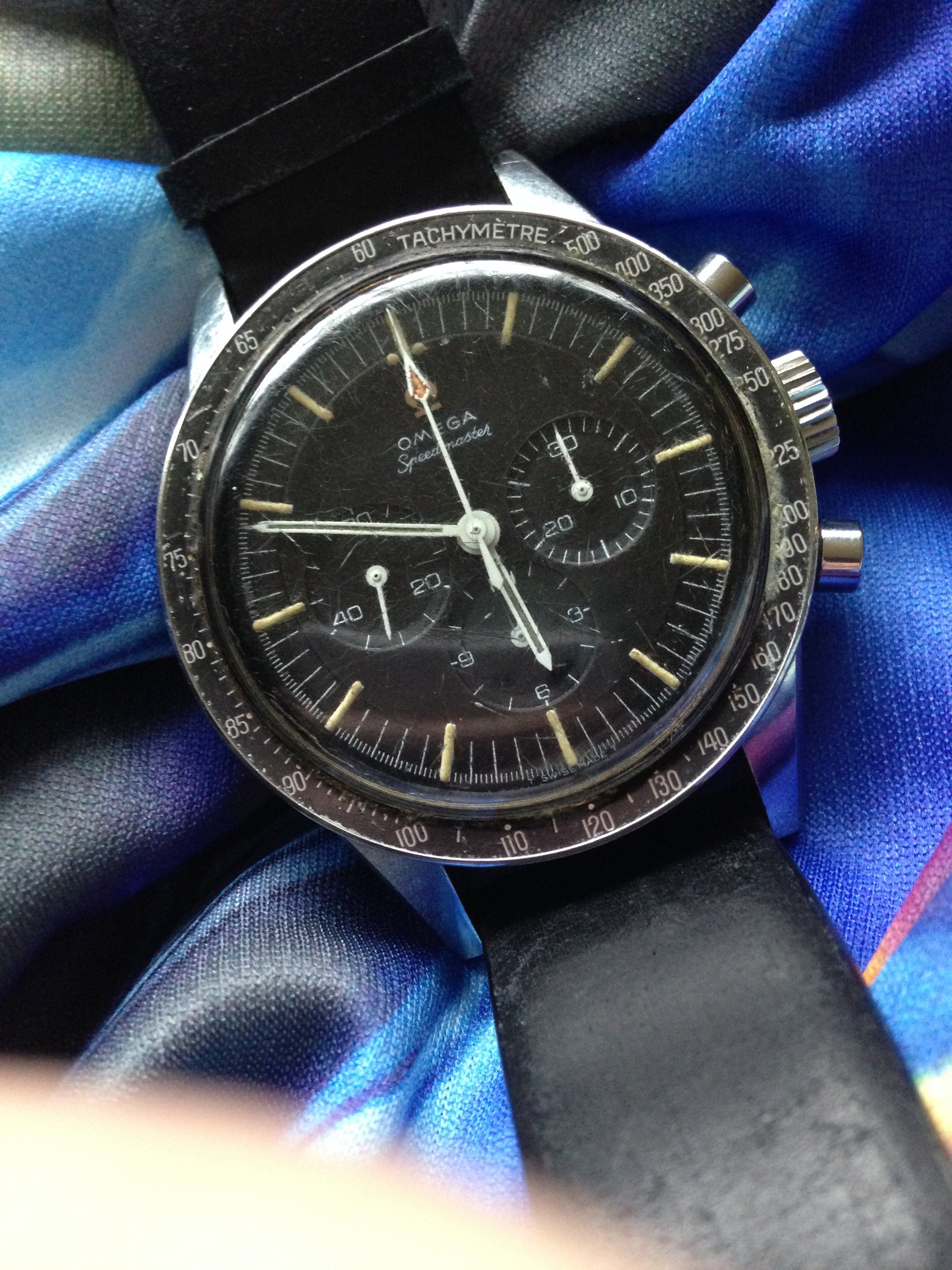 ·Note the similarity of the greenish lume, the minute and hour hand, and then the fact that the chrono hand lume is similar to each other in color, yet different from the other hands. Lends some credence to the idea bandied about that, at least for some time, the chrono hand and other two main hands may have been manufactured by different vendors.