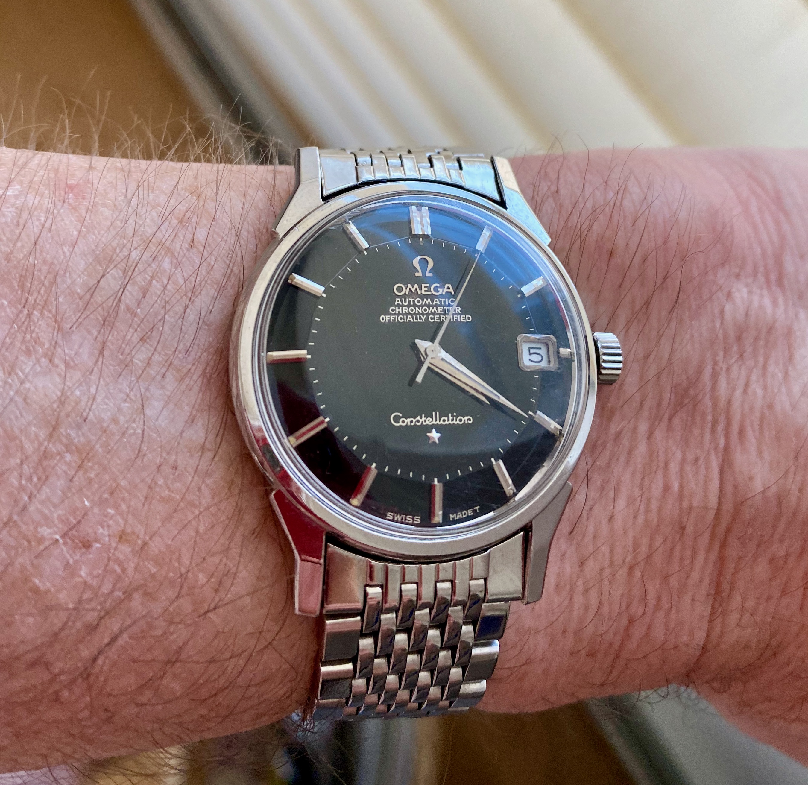 I've made a few stops at this shop in the past few months where I found the black dial Connie to see what they had. The watch had disappeared from the case and I thought it had been sold. I stopped this morning and there it was again along with a gold on steel triple date Speedmaster. Long story short, I went back this afternoon, passed on the triple date and bought the Connie knowing that it wasn't perfect but pretty good (and I hadn't stopped thinking about). Price was reasonable, I thought (USD 1375.00).