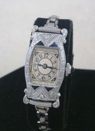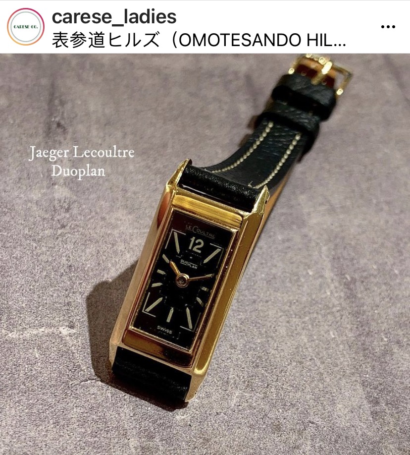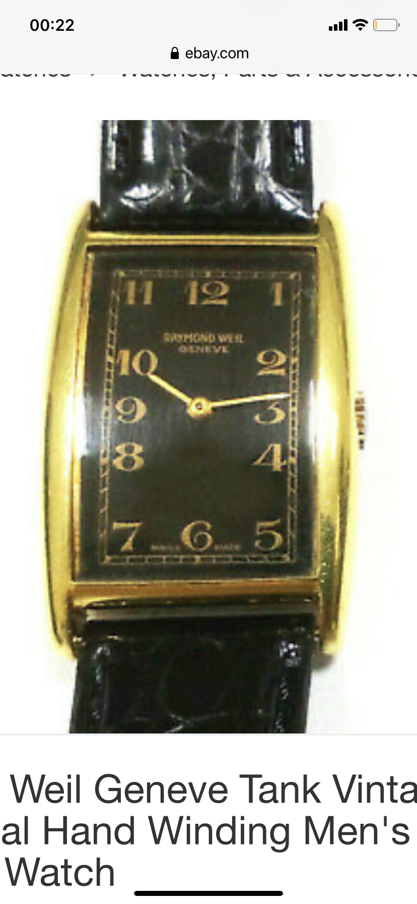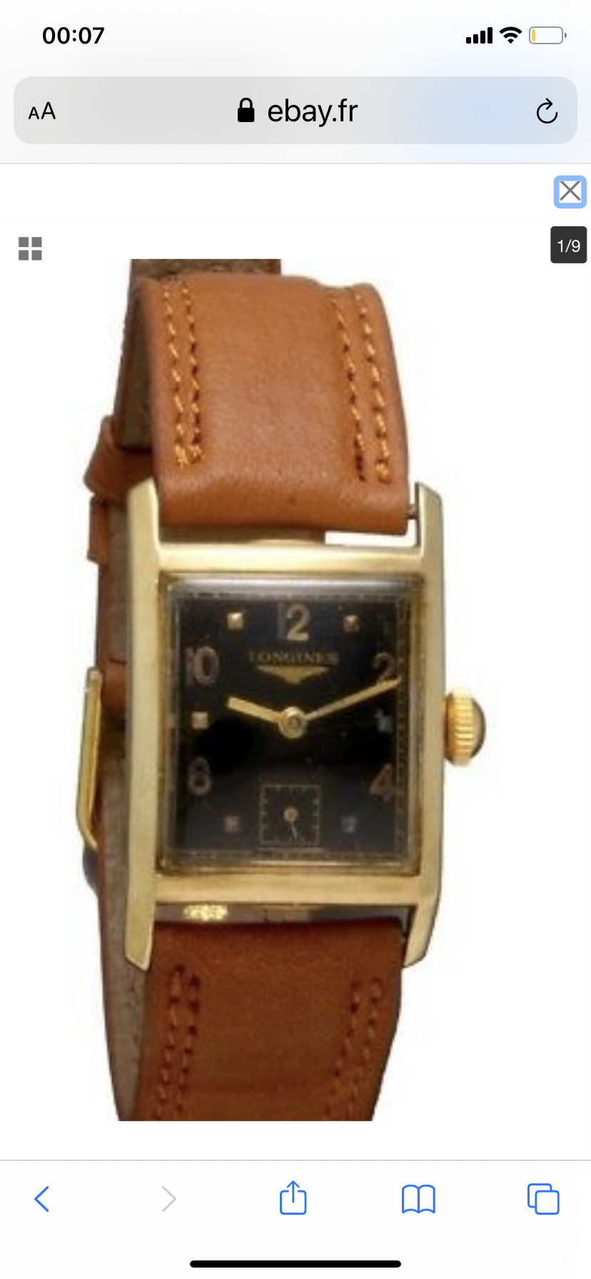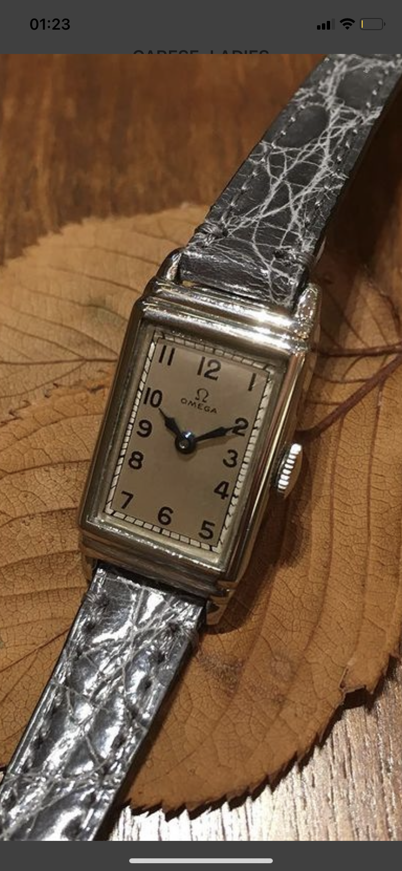 TLDR: I'm looking for pre-WWII women's golden (or gold-plated) watch, that is rectangular (not square) and has a black dial with golden hands.