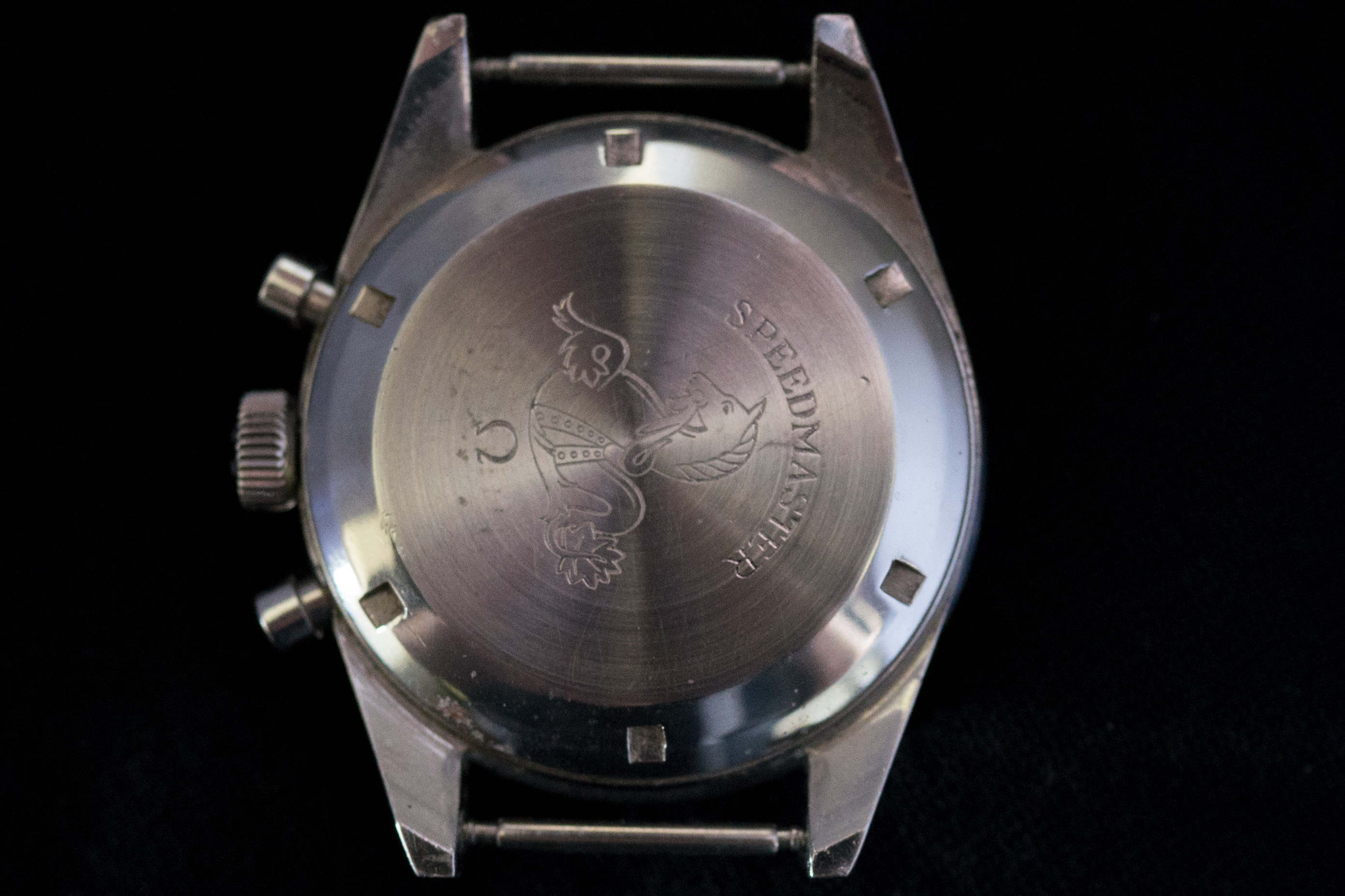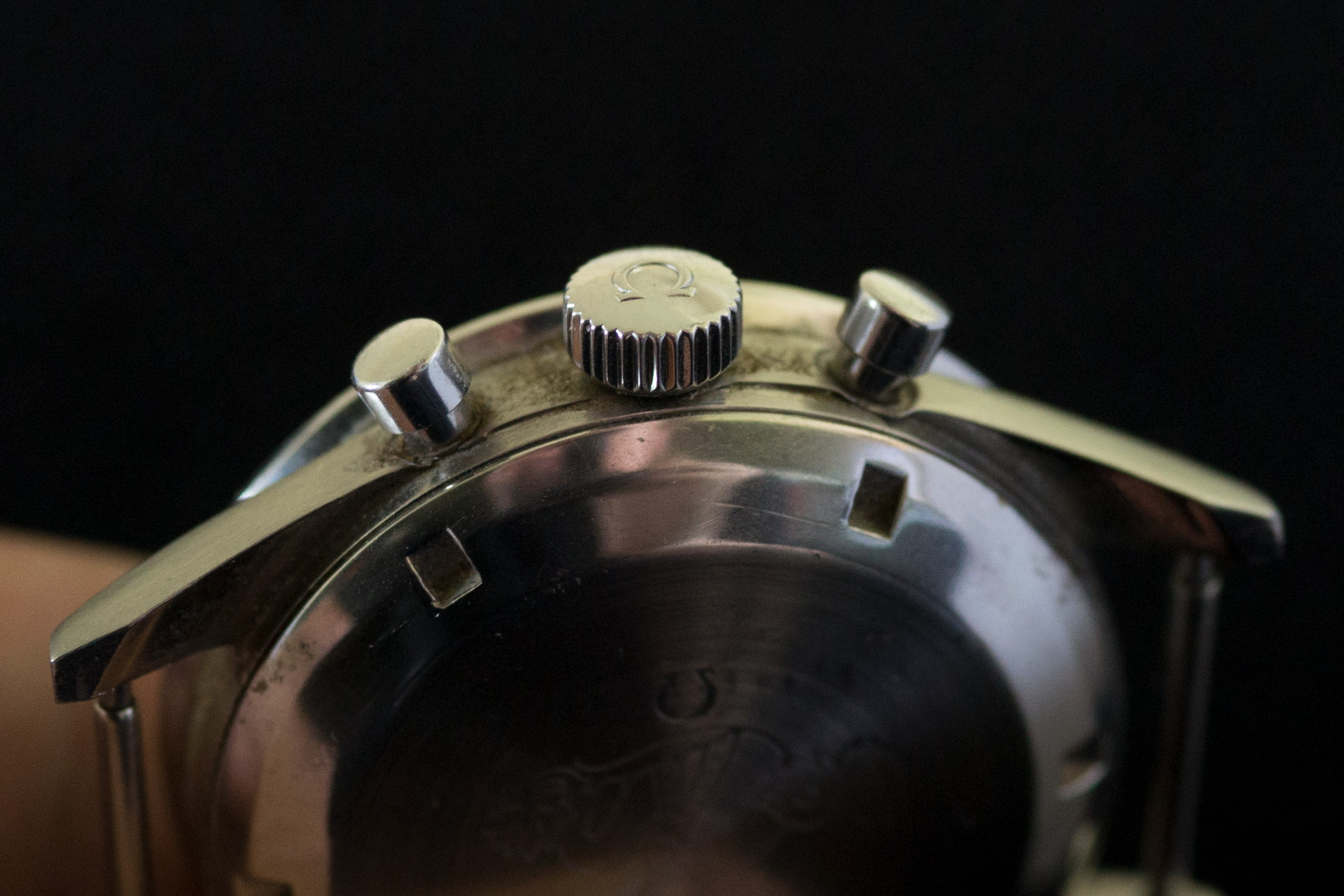 I later sent it to Omega, with instructions not to mangle things, which resulted in a replaced chrono and subdial hands, crown, and pushers. The slightly offset bezel is the result of a later, non-Omega service.