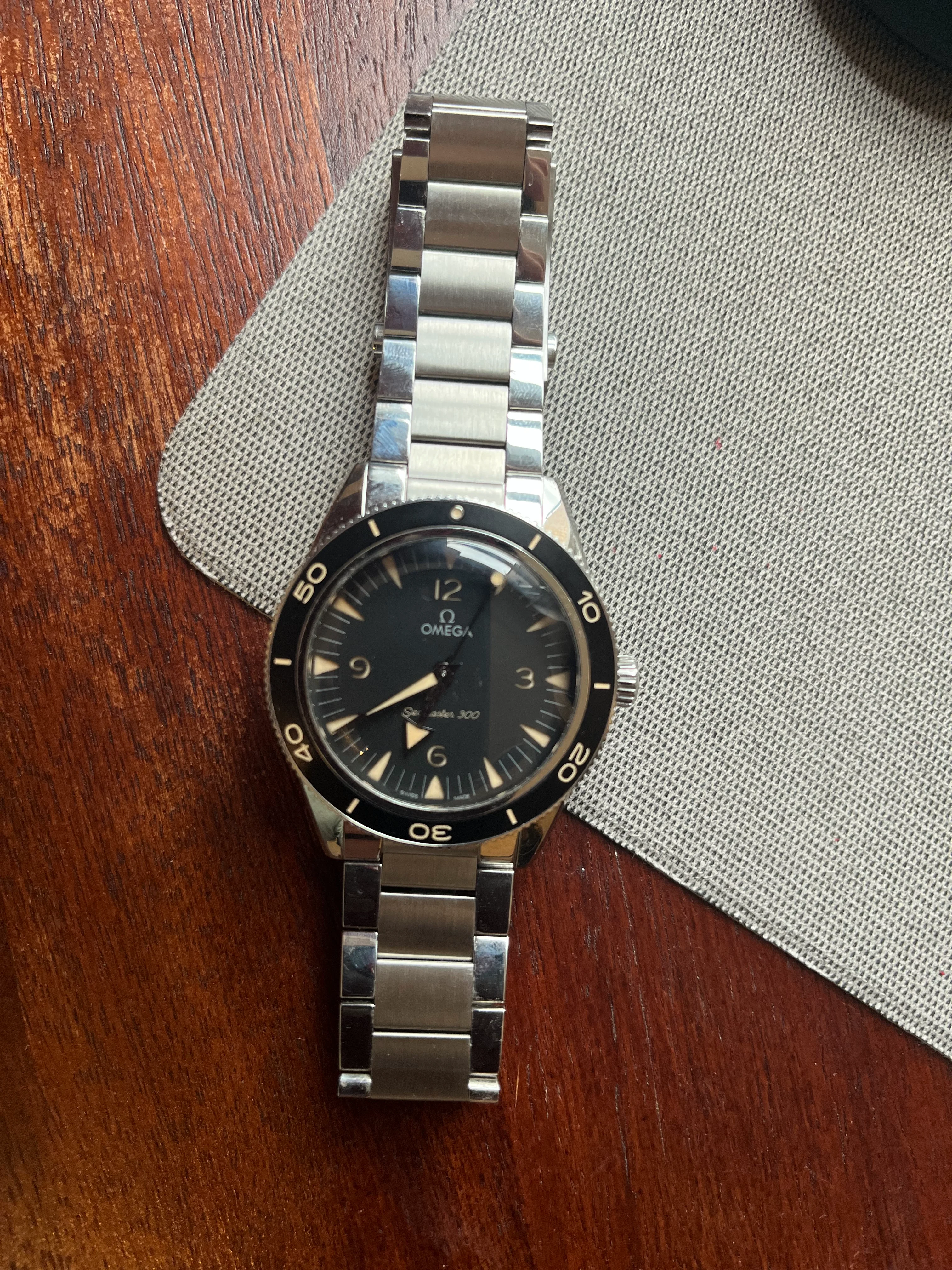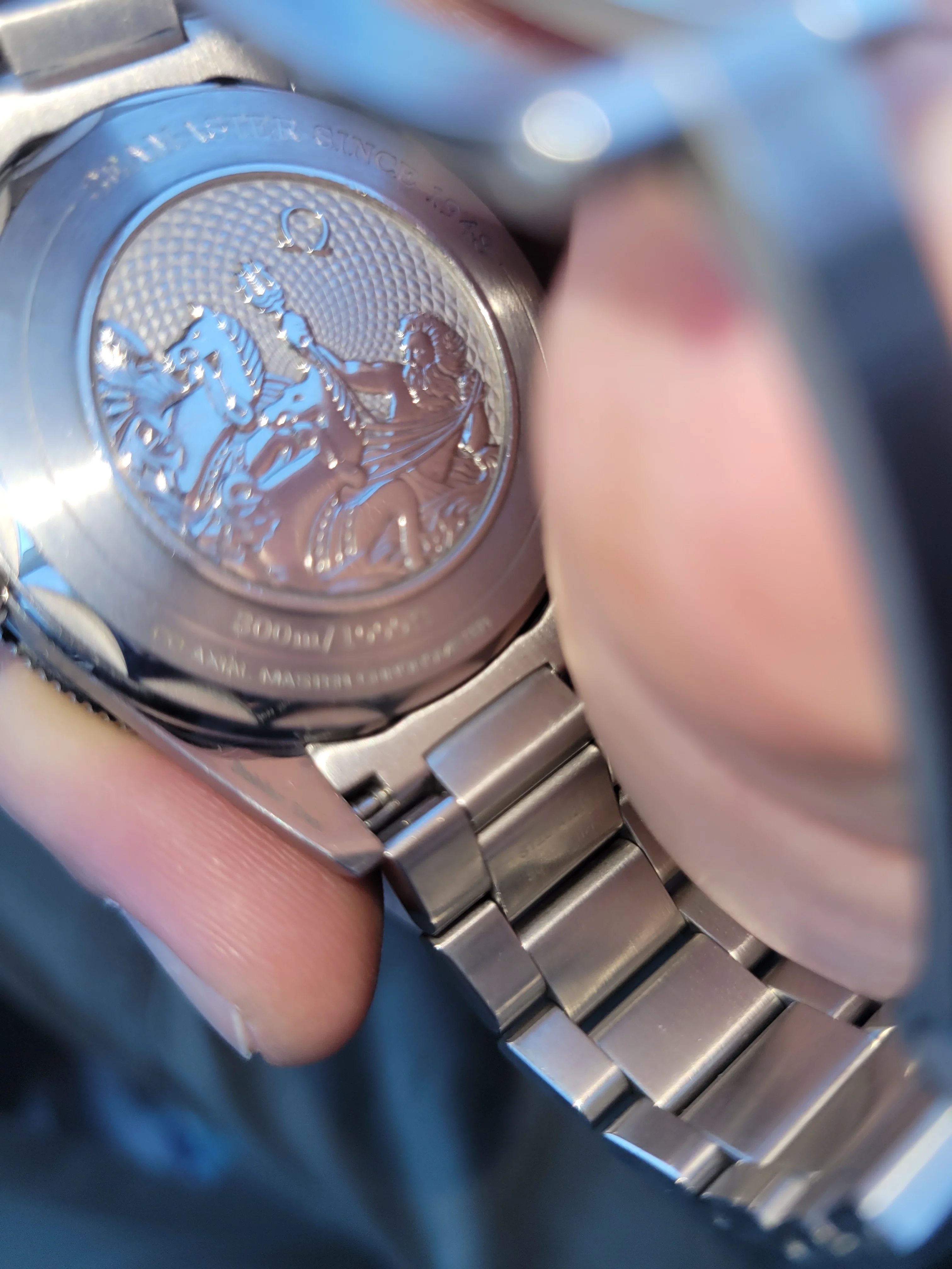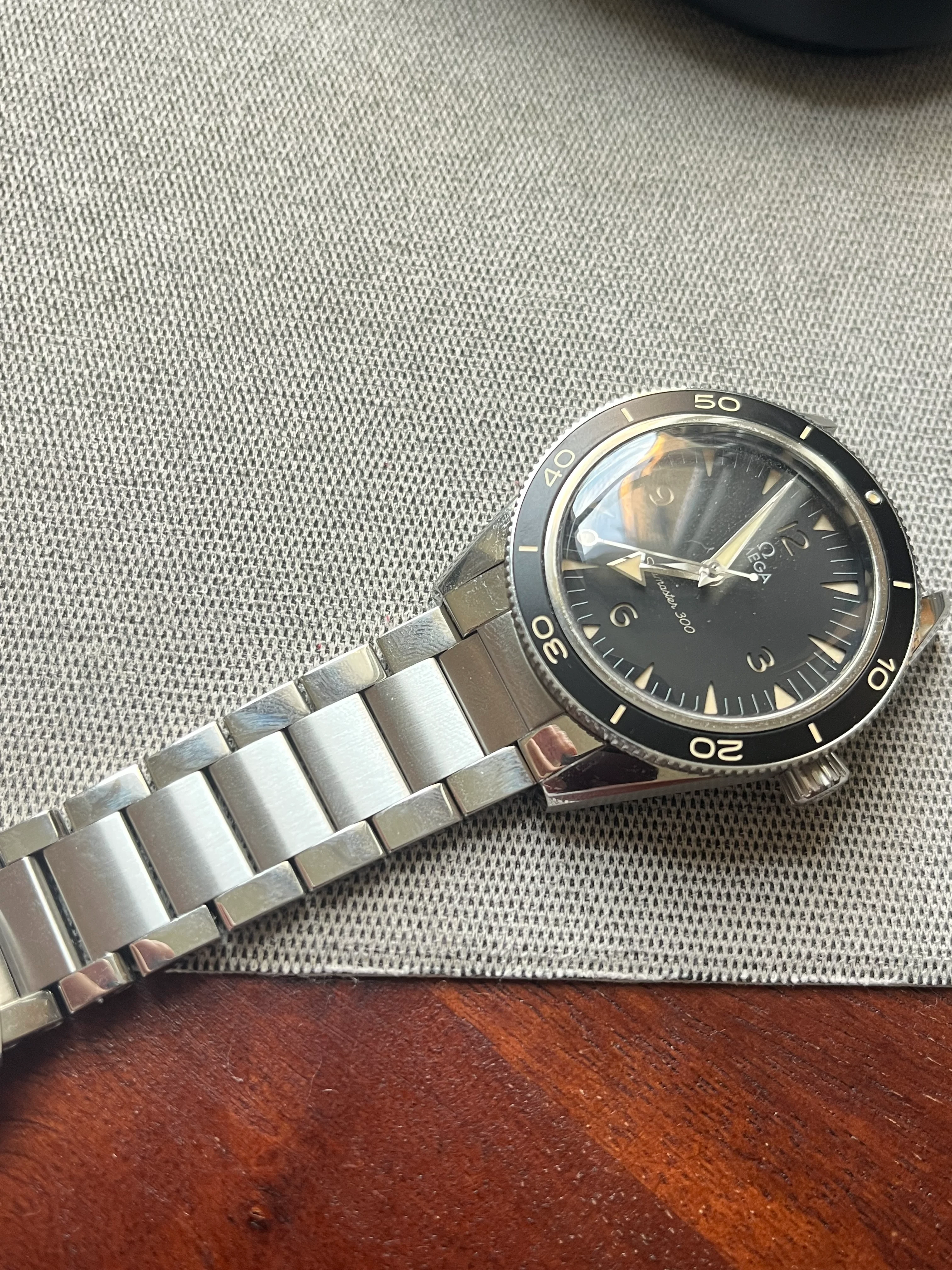 believe the clasp you have there (part #STZ001159, assuming it is genuine) with 6 positions and the slightly lower "OMEGA" placement comes from the current generation Seamaster Professional 300M. Your clasp appears thicker and longer (which is why the lower OMEGA placement most likely)- the current 300 heritage clasp is just over 18mm thick and mated to a bracelet that tapers to 16mm- and the portion of the clasp with the PUSH adjuster is 15mm thick.