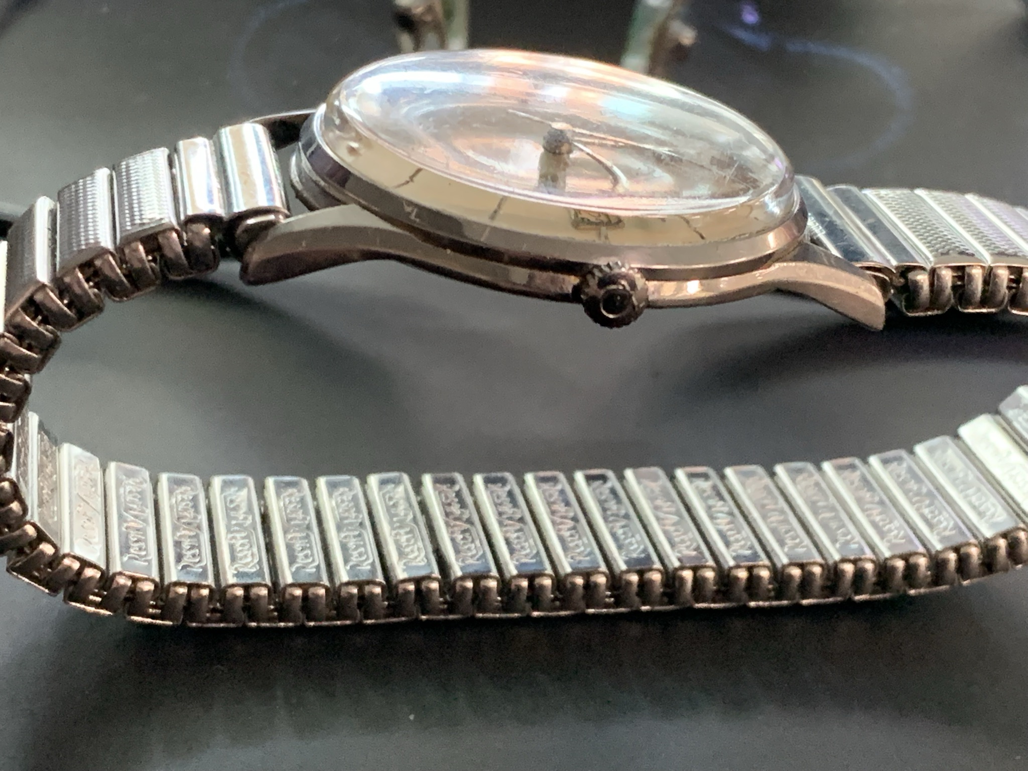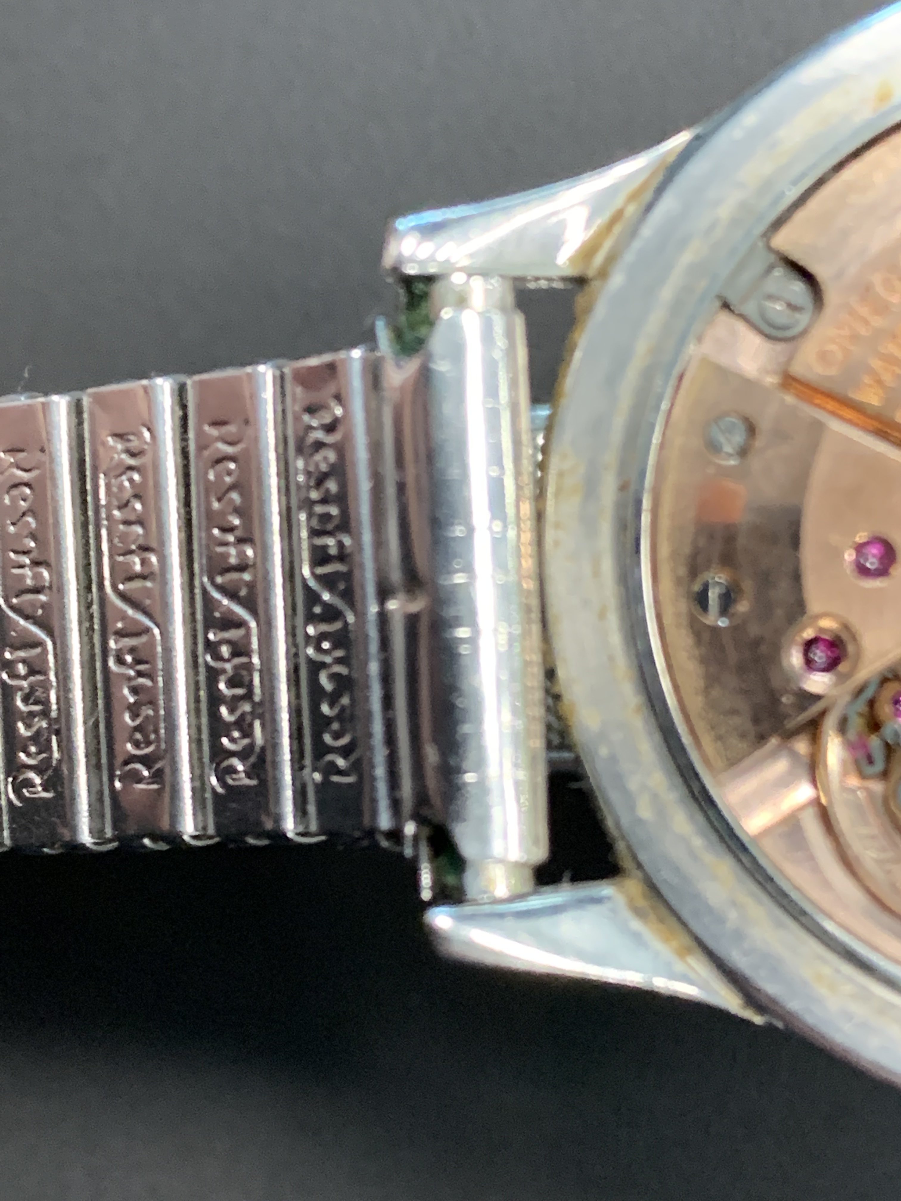 The strap is stainless, expandable and has ‘made in England’, ‘resofi’ and ‘Edelstahl’ written on it.