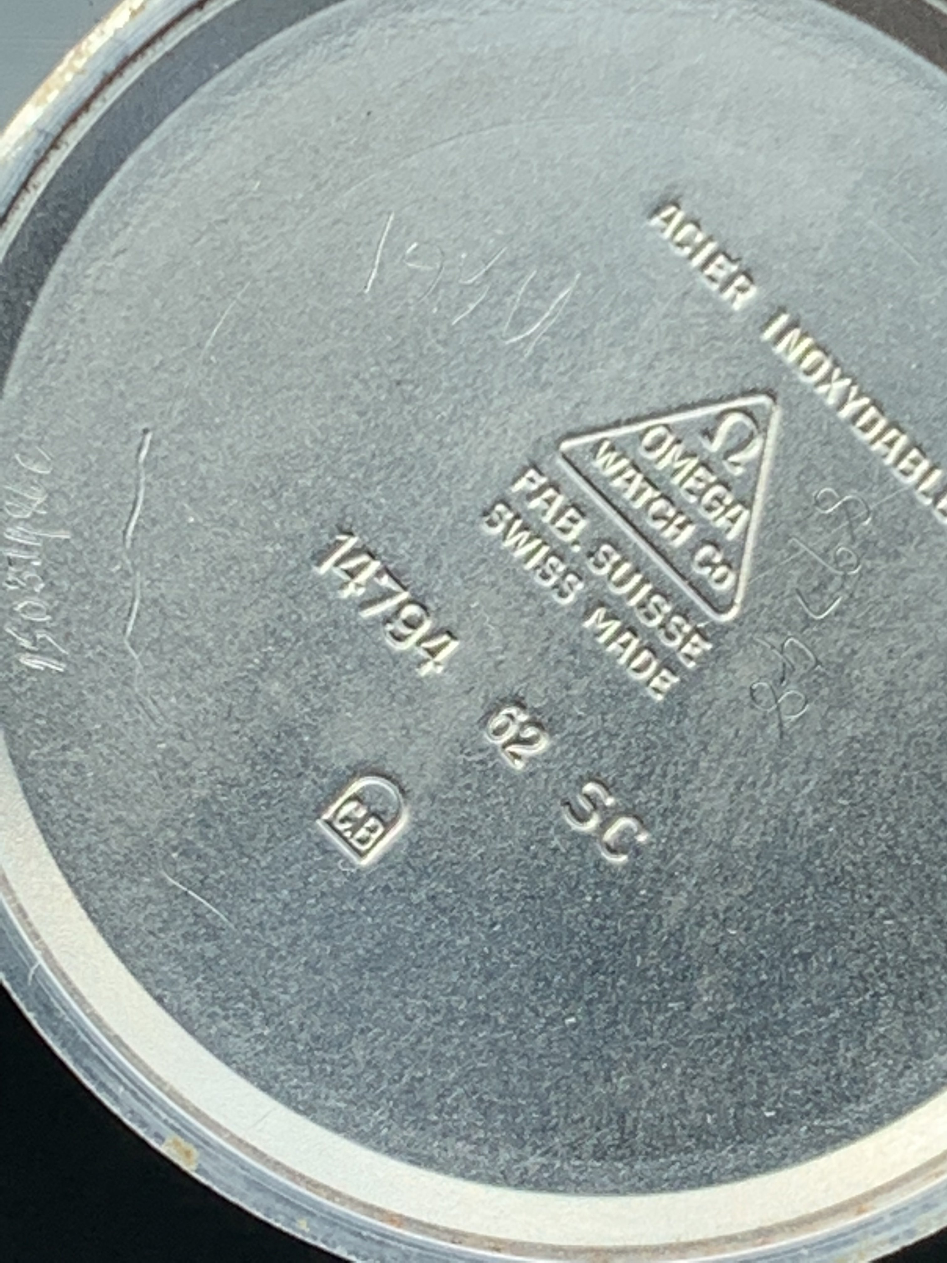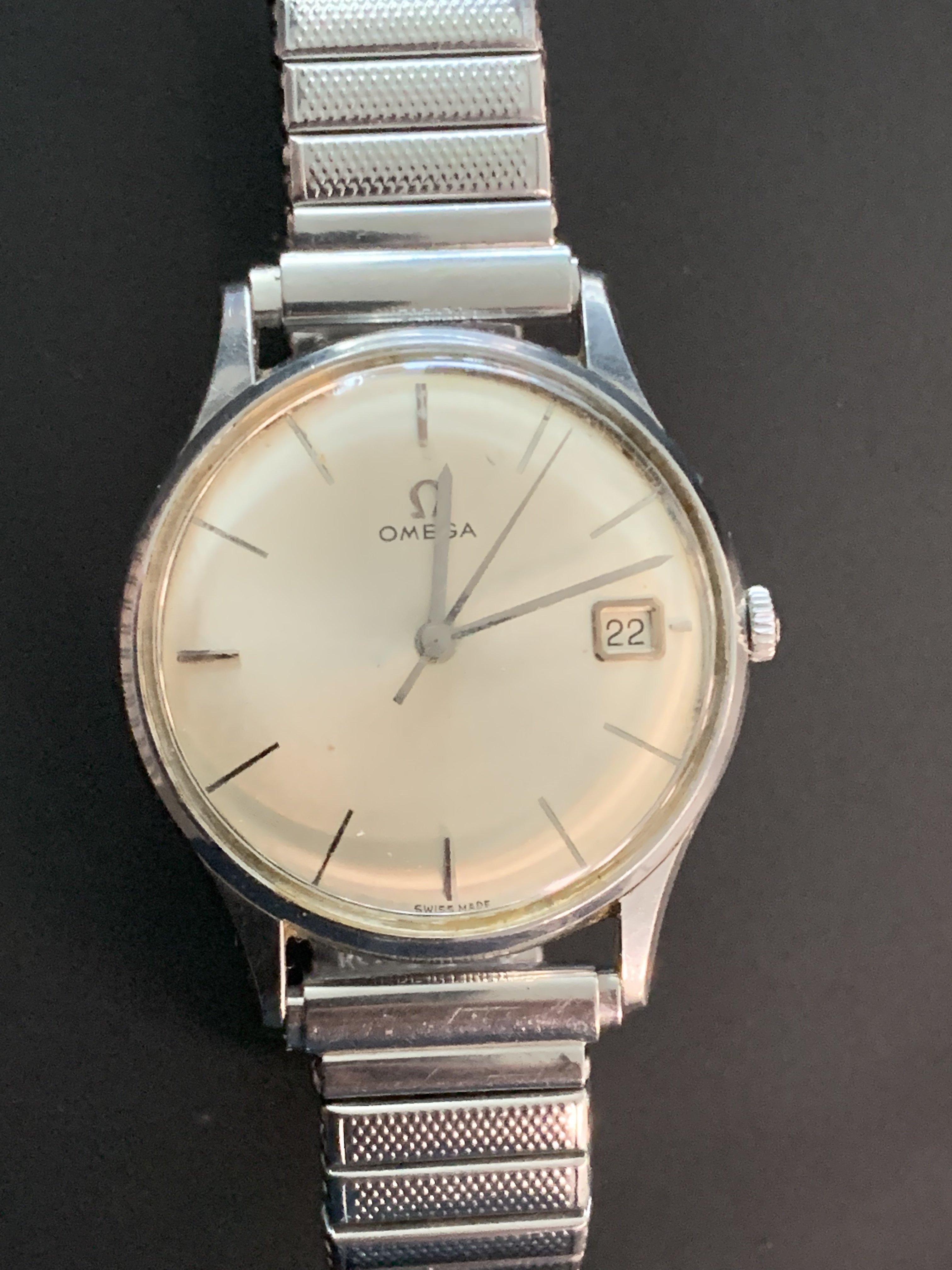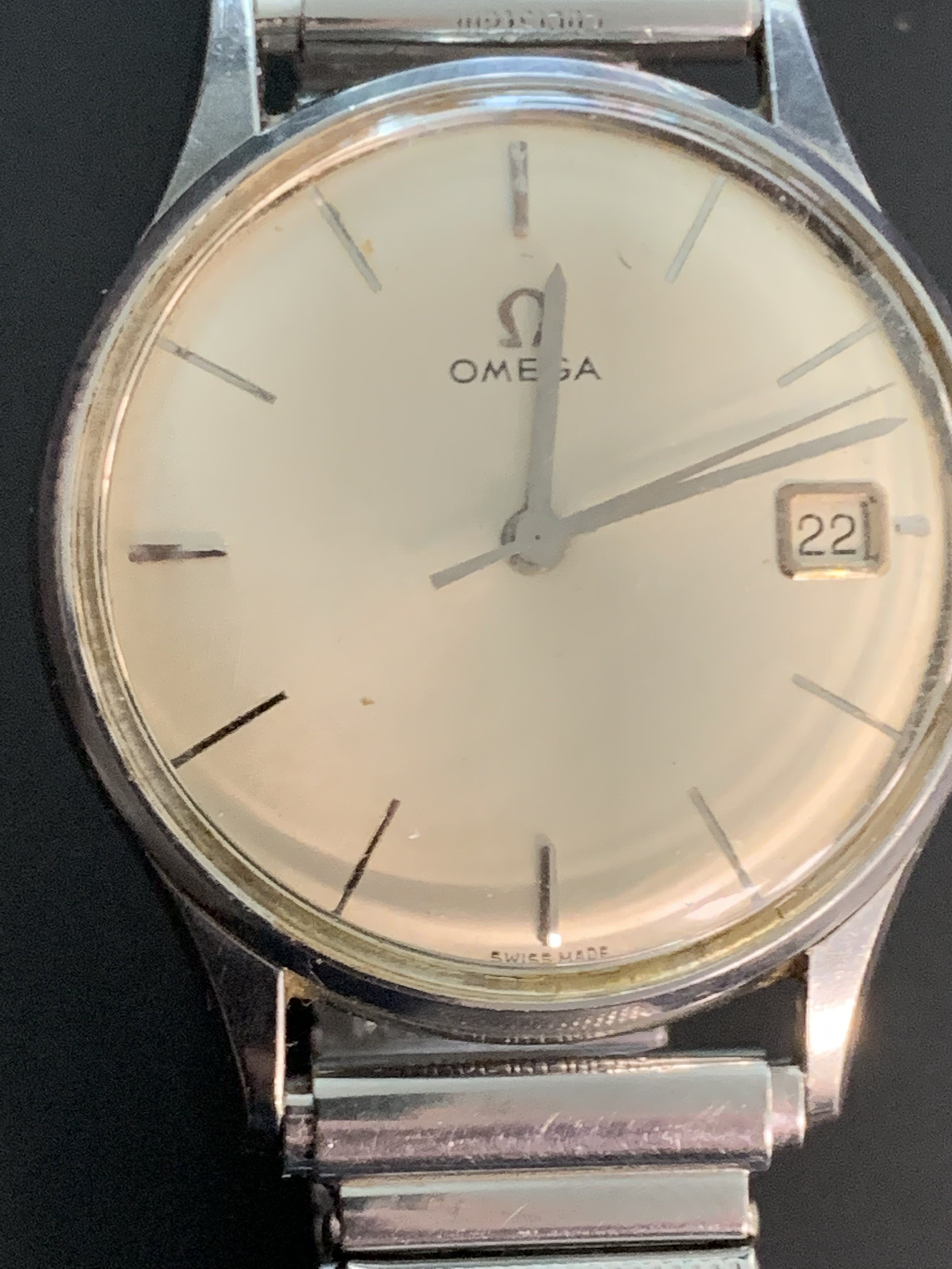 Face has no model type written on it, single plain hour markers and date function. The Omega logo and date window appear to be gold coloured, it is difficult to tell if the hour markers are gold or silver.