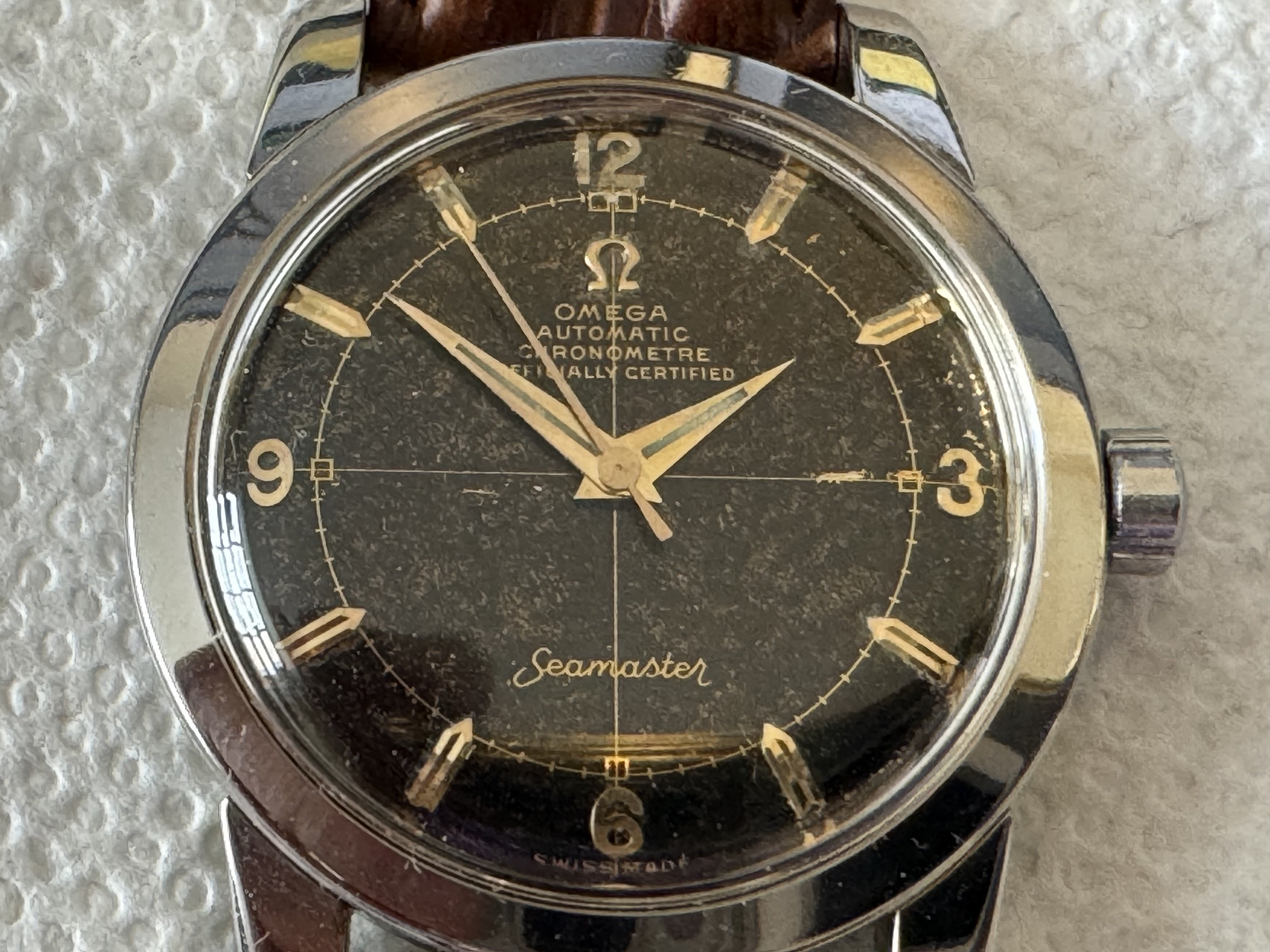 What I do know: It's an approximately 1953 Seamaster with the 354 bumper movement. About all I've got. I've researched online at length, randomly over the years as I think about it, and haven't found another dial exactly like this one. I have no idea if it is rare, or if I just suck at Google.