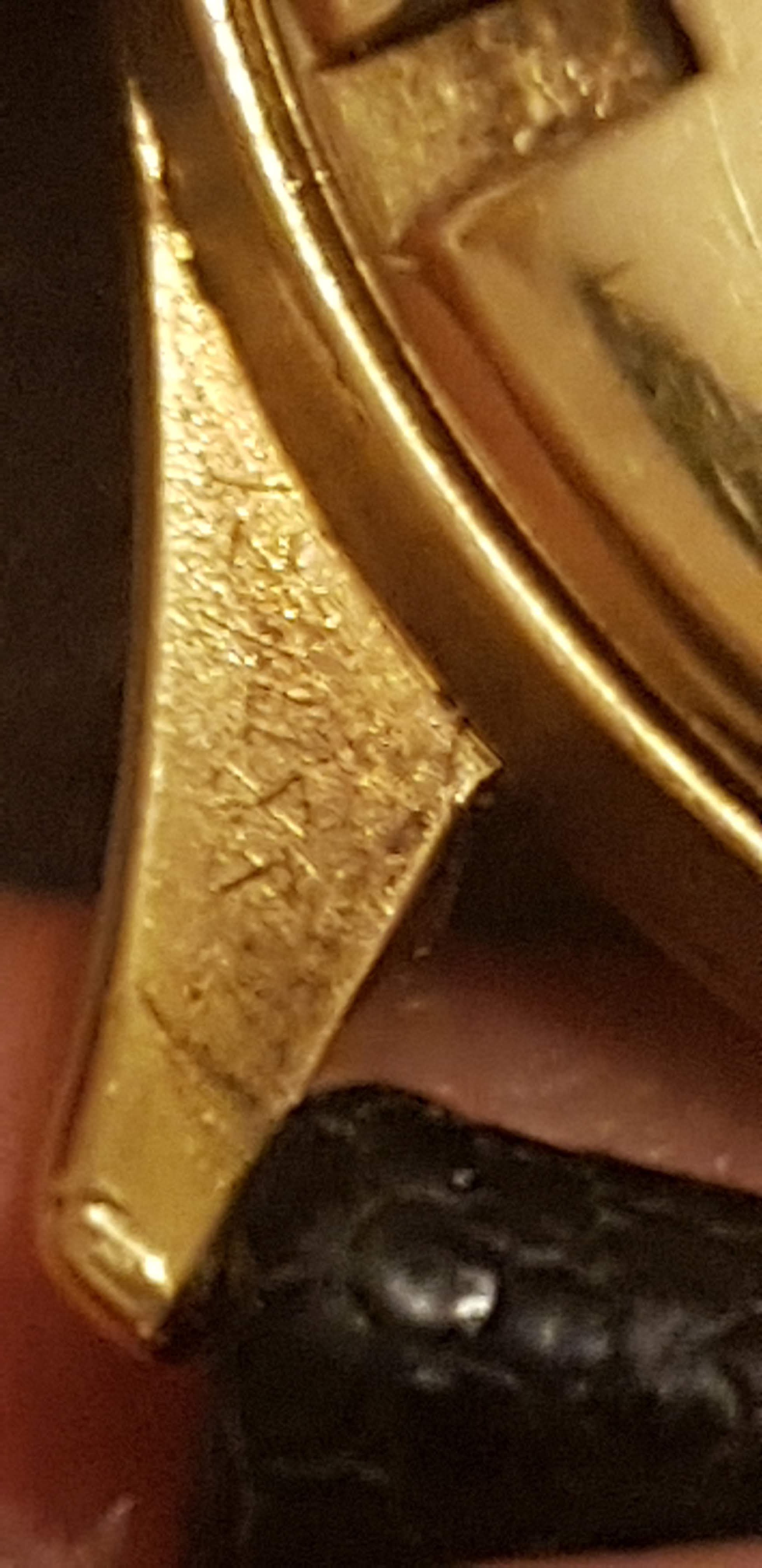 I got a local jeweler to remove the back for me yesterday and he informed me that it was 18K gold and that he thought it was probably made in the 1970s. He obviously has the date wrong as my Grandfather had already died.