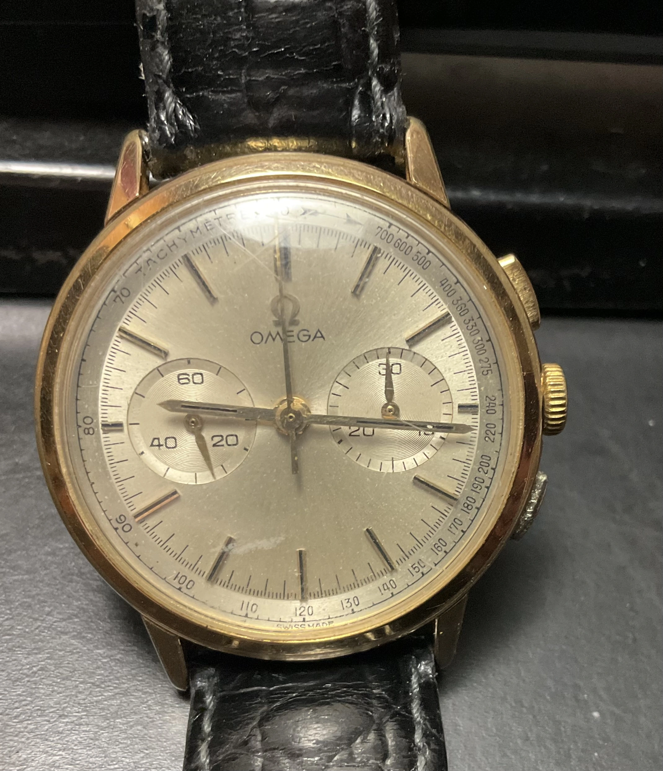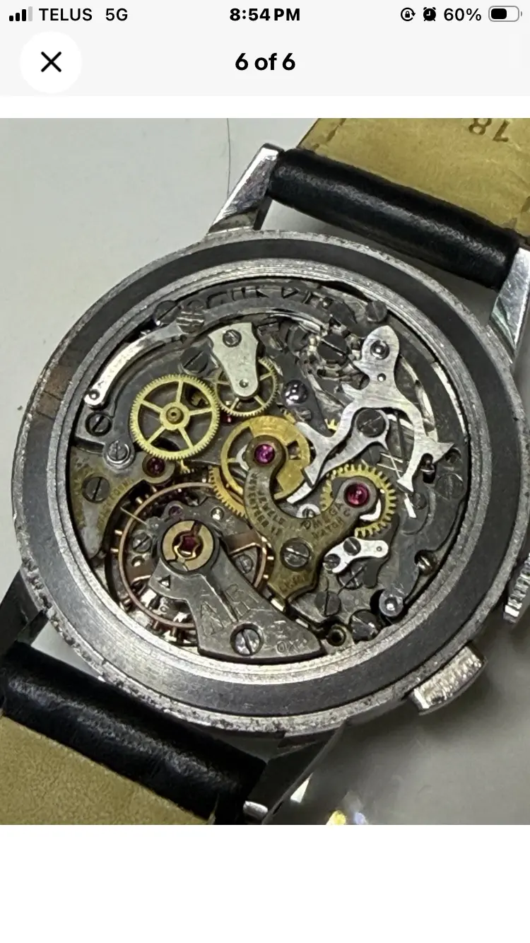 I have one much like the subject watch in my shop right now. The movement in the subject watch appears to me to be not original to this case. I refer to my sample Omega two-register chronograph right now which has an Omega calibre 350 in it. Clearly marked with a serial number.