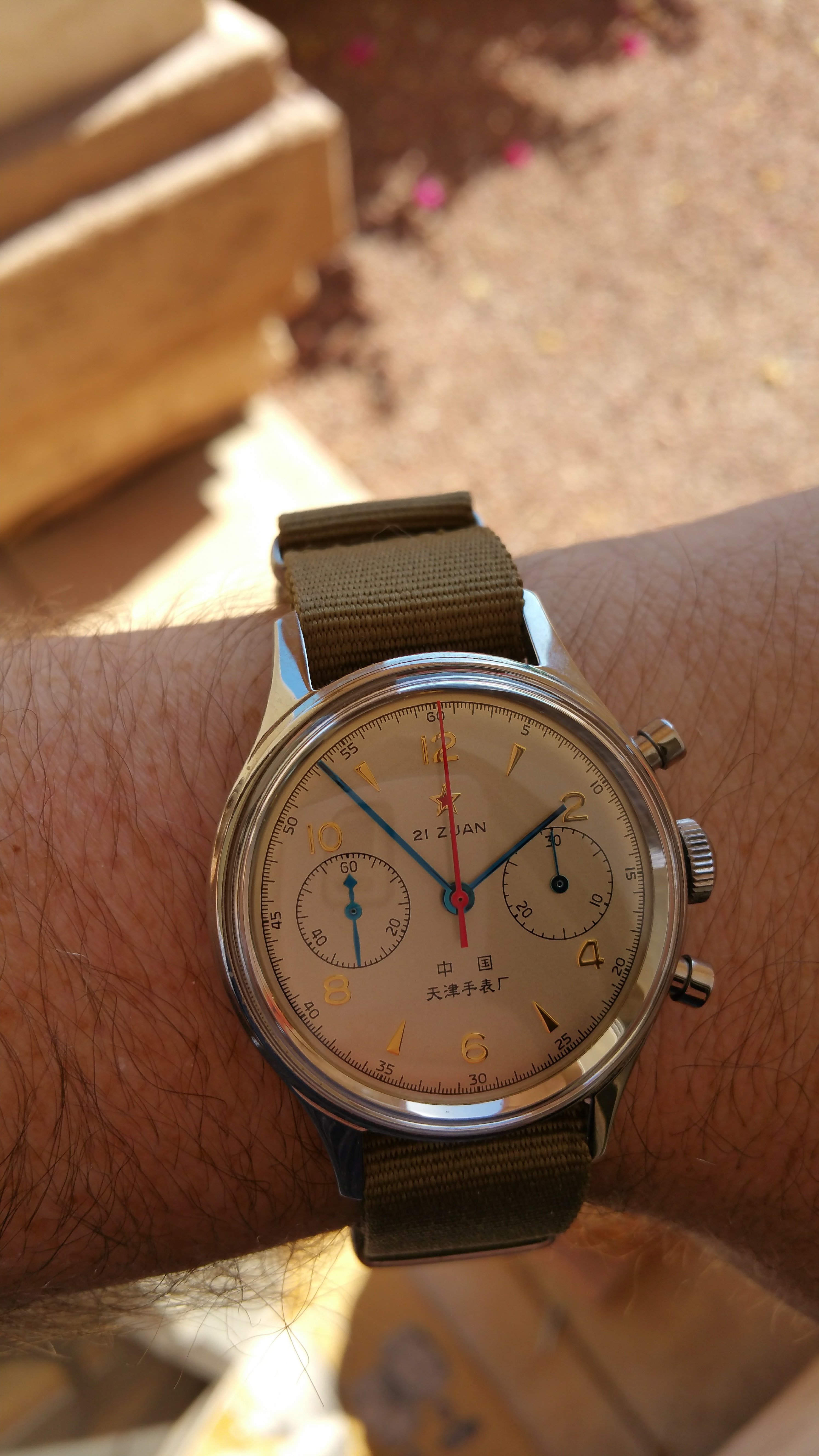 Easy. The Hamilton Khaki Field Mechanical. 38mm, hand-wound, slim case ( <10mm) so won't be super prone to smacking into things. It's $475 which isn't a big stretch.