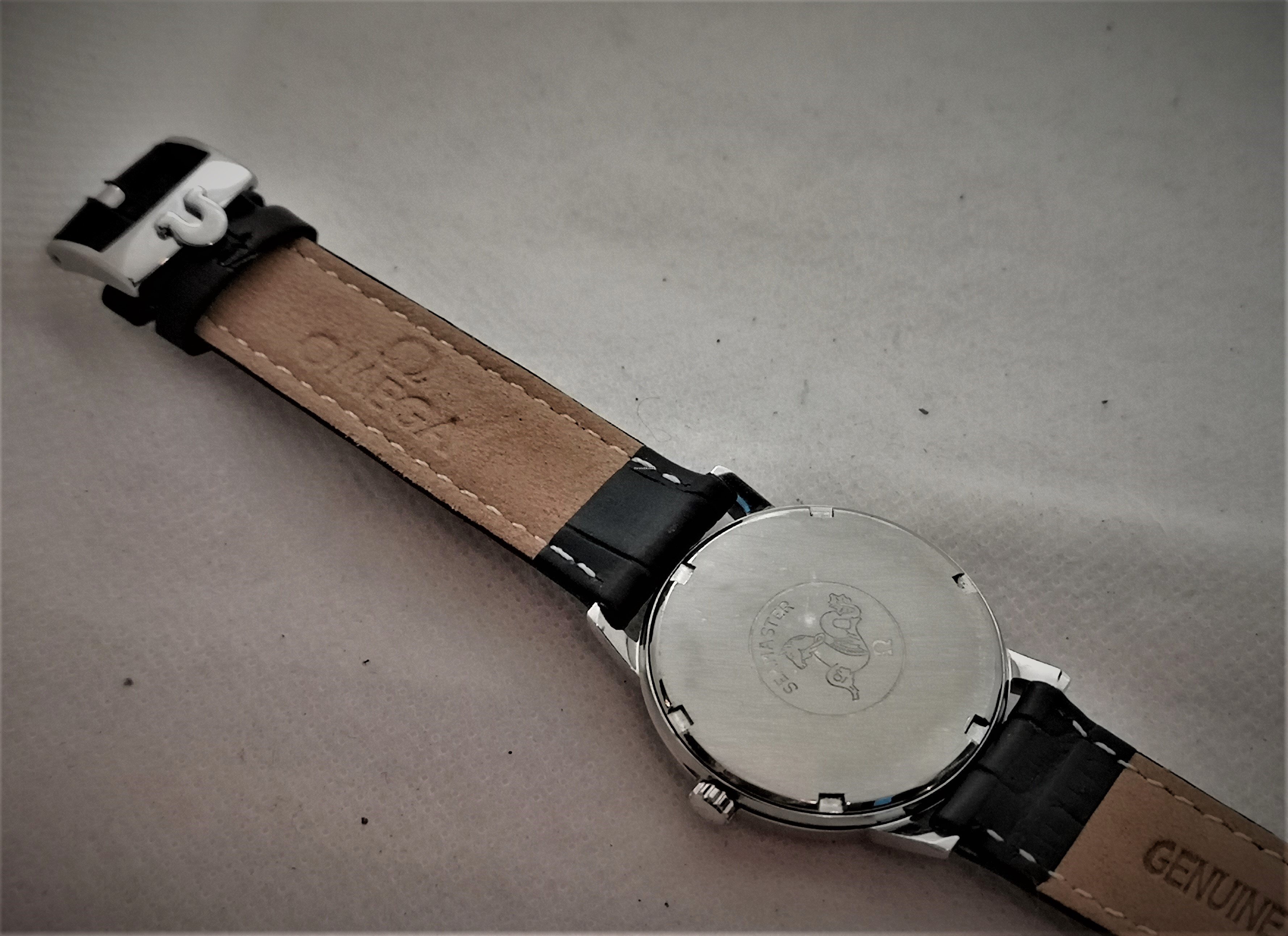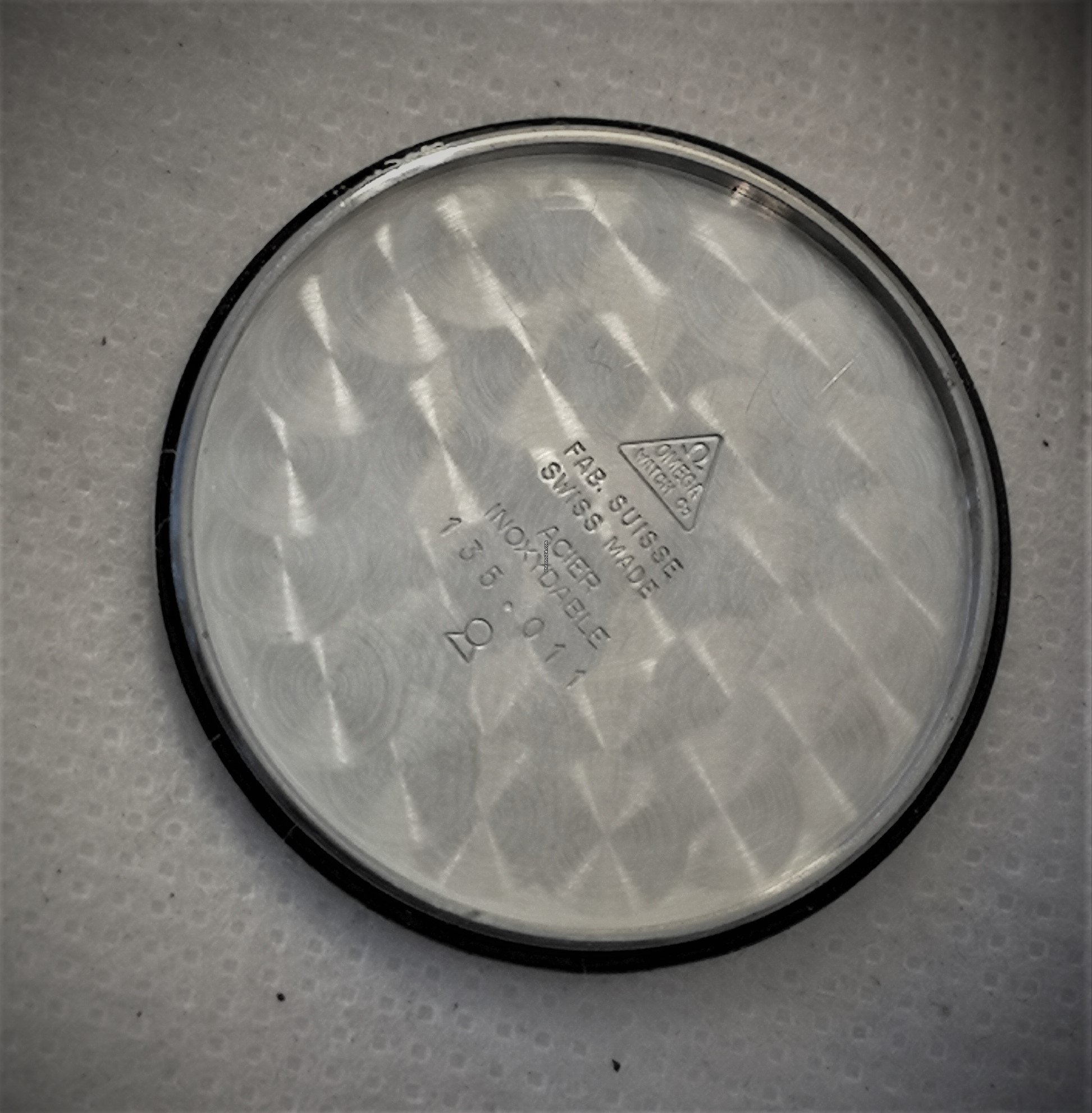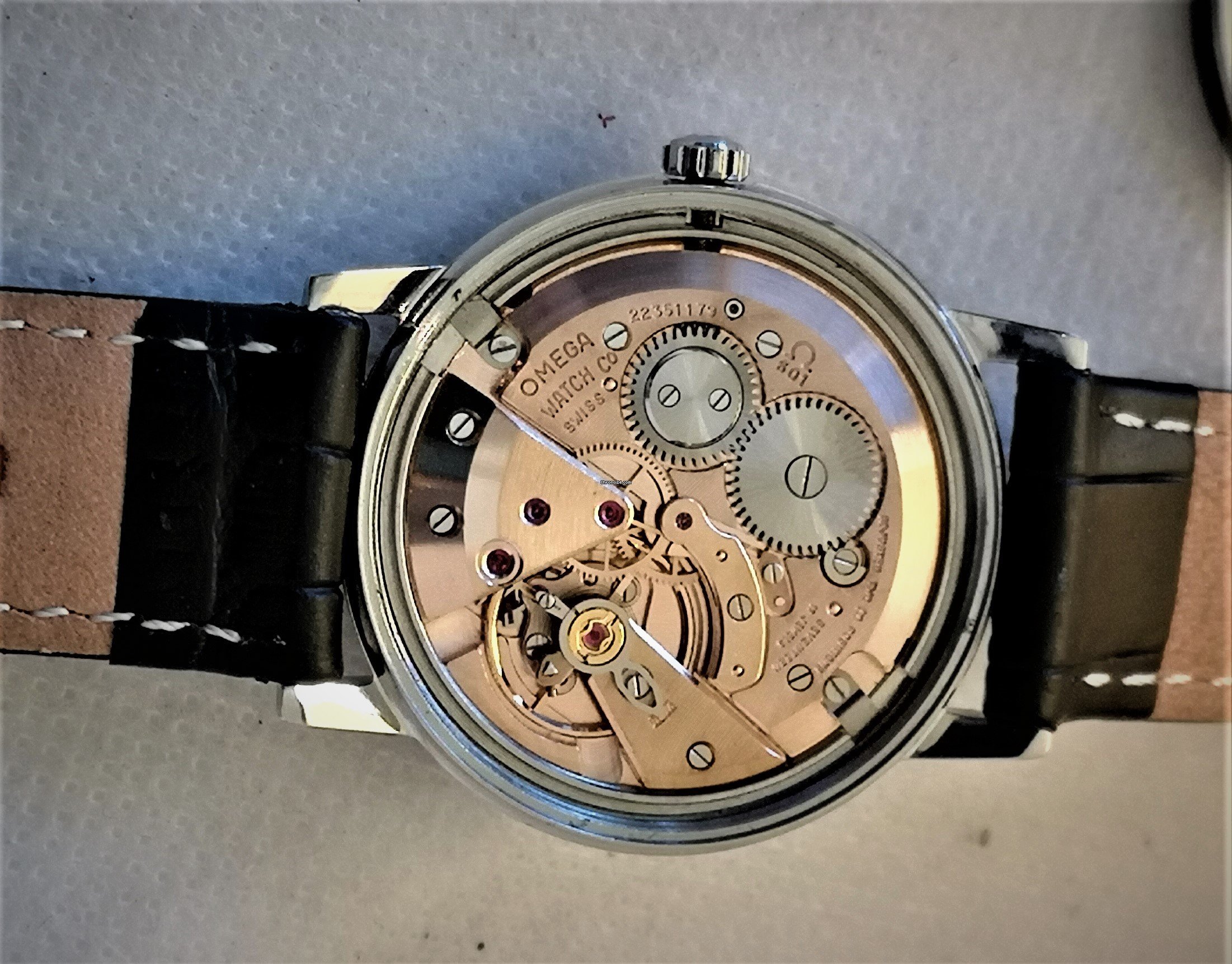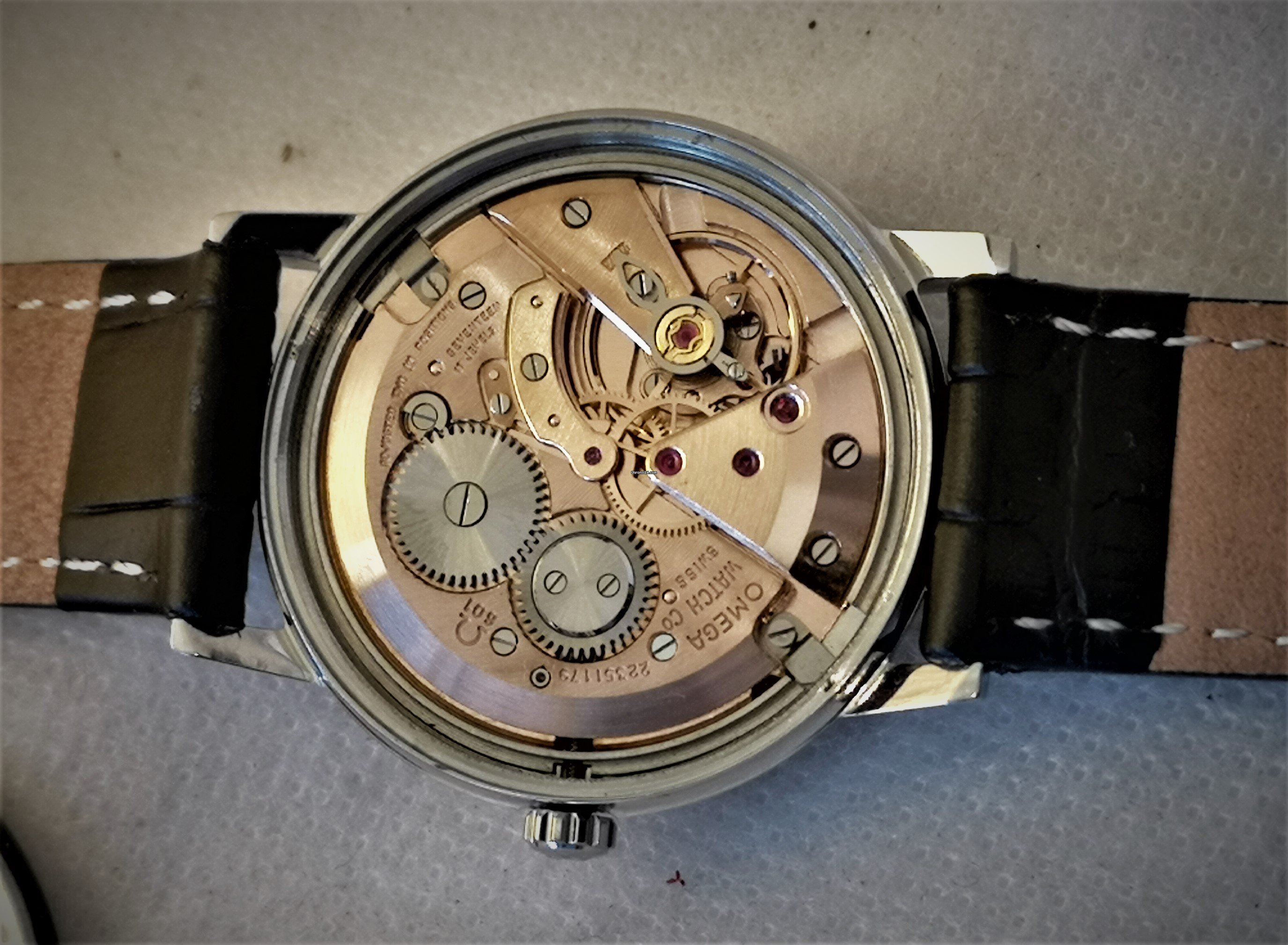This one looks tidy but I'm wondering if the 'T's at either side of 'Swiss Made' are too close together. On other examples I've seen they are exactly half way between 25 and 30 and 30 and 35, and on this one they are at 28 and 32. The G on OMEGA also looks a bit off, perhaps? The seller has said the crown is original. Can anyone tell from the images if it's at least a genuine crown?