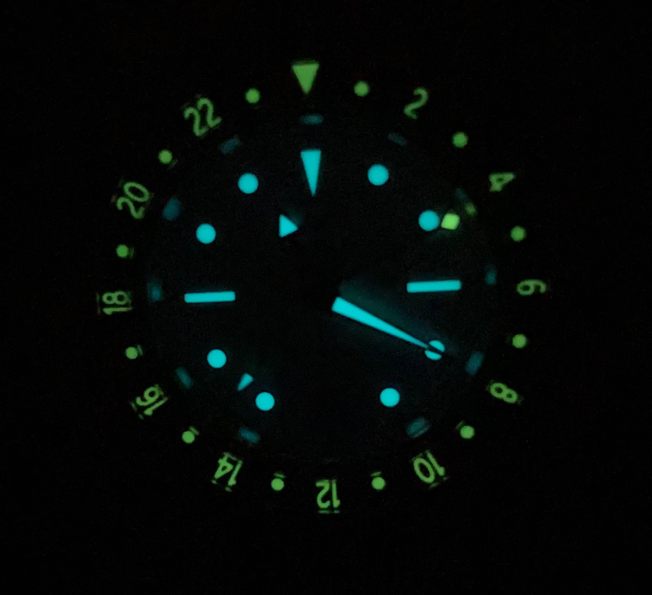 I guess from there it's a good segue to lume. Overall when fully charged up this lume is the brightest watch I've ever owned. I'll put another aside at this point to say that my eyesight is awful. Seriously terrible. I'm able to get to 20/20 corrected with glasses and/or contacts, but add on middle aged onset of other vision problems, and take things that I say about low light visibility with a few grains of salt. Anyway, I was very interested to see how the 2 tone lume on the Lorier would work out, and in general even when fully charged I can't really tell the color difference at arm's length. It's much more apparent in a pic or if I take off my glasses and look up close. The size of the lume plots on the hour and seconds hands makes them a little difficult to see for me. I know that Lorier recently redesigned their hour and minute hands specifically to "be more distinct, making for better low-light legibility." And they definitely are distinct, but I wonder if I would be able to see the old hour hand better since it had more lume area. On a similar note, again for me the second hand is not hugely visible in the dark because it's such a tiny lumed area. Again overall it's still the brightest lume out of all my watches, but keep in mind I'm comparing it to a few Casios in the $50-120 range and a 1969 Omega where the tritium-based lume is completely (and understandably) non-functional at this point.