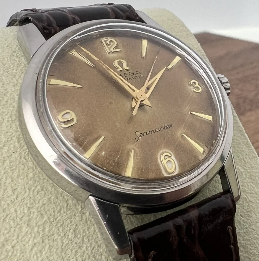 They become porous or develop fine cracks and hydrogen sulphide gas (which is always present in the air in small traces) can penetrate to the silver of the dial over time. The silver reacts with the hydrogen sulphide to form silver sulphide. This can result in colours ranging from pink to various shades of brown to almost black.